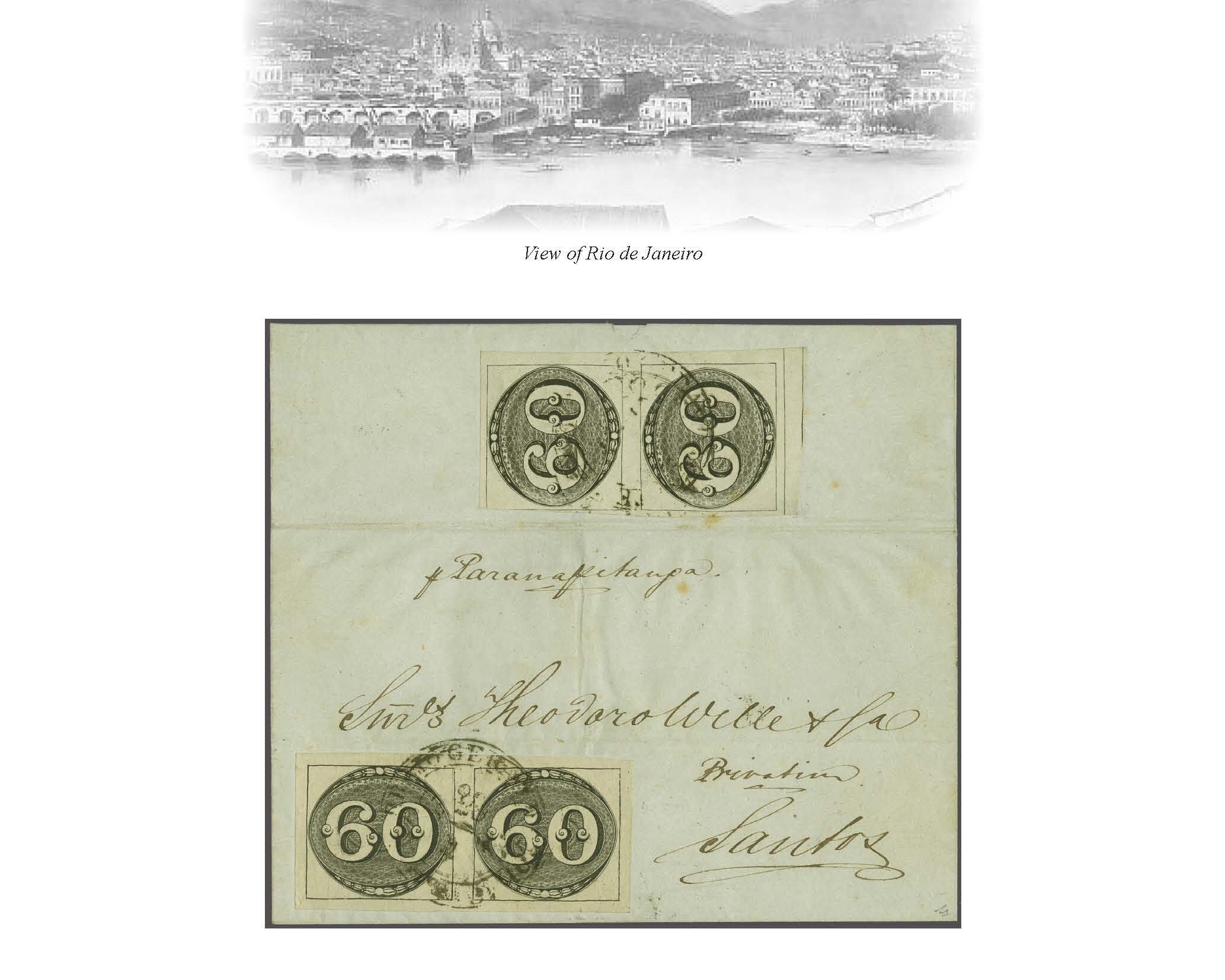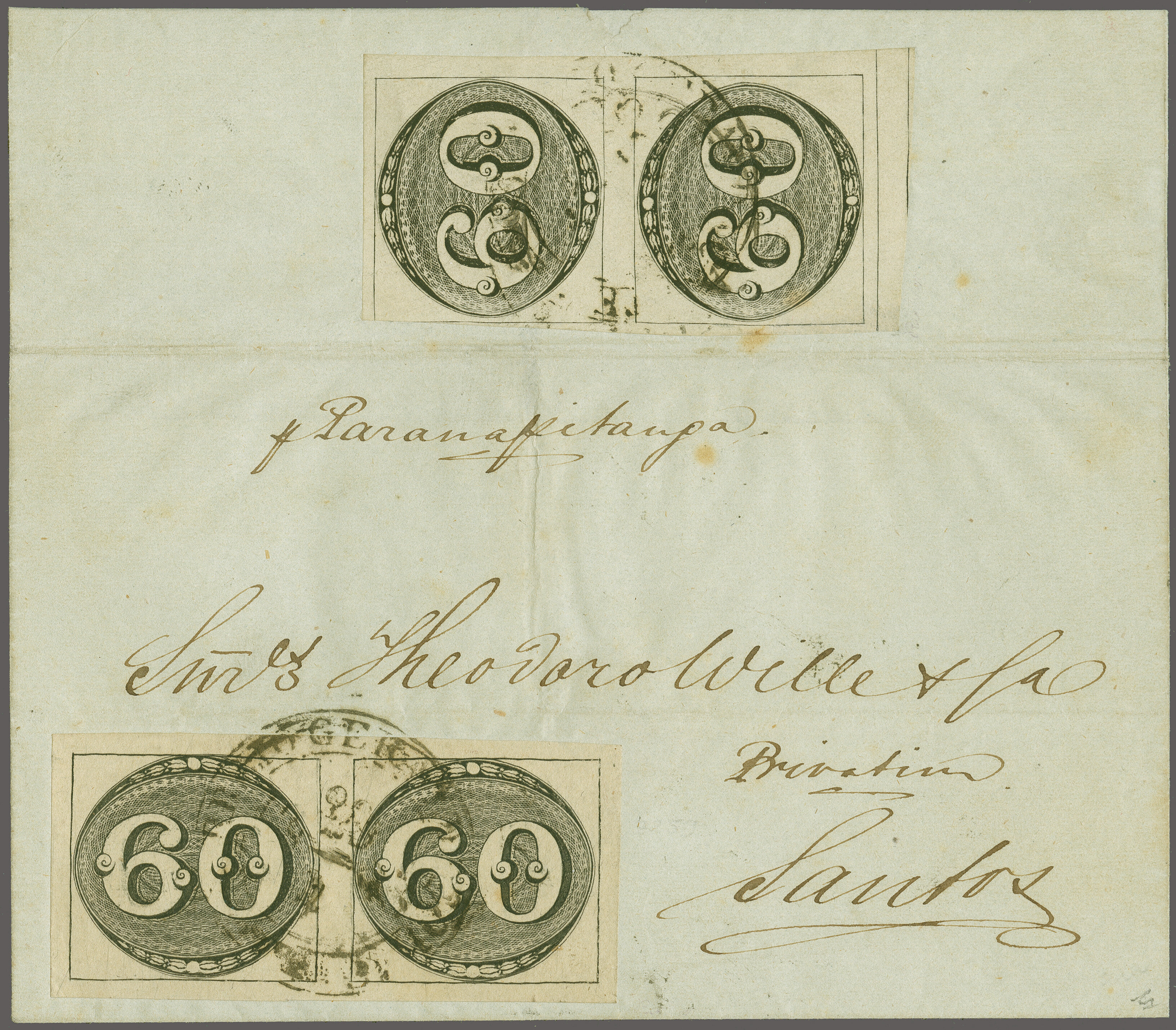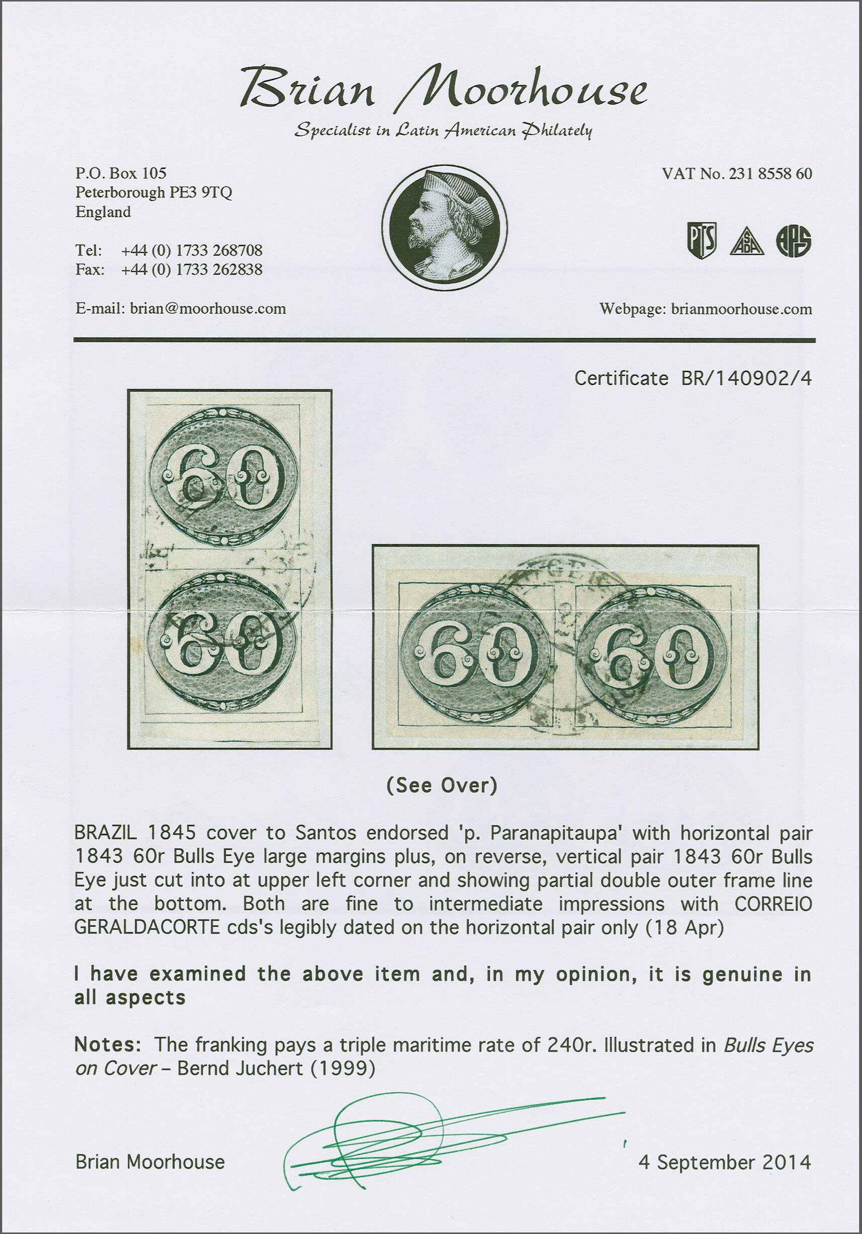 142 cover image60 reis black, early Intermediate Impressions, two horizontal pairs on 1845 maritime triple rate cover to Santos (Wille correspondence) endorsed "p. Piranapictupa", horizontal pair on obverse with large even margins all round, the vertical pair on reverse with margin just shaved at upper left but showing the horizontal dividing line; each tied by "CORREIO GREAL DA CORTE" circular datestamps (April 25) in black. Illustrated in Juchert "Bull's Eyes on Covers" on page 144. Extremely rare cover - just 4 such frankings are recorded. Cert. Moorhouse (2014). Provenance: 5th RHM Auction, Sao Paulo, 1986, lot 62; Soler y Llach, Barcelona, Feb 2007, lot 39; Corinphila sale, London, May 2015, lot 303. (Image 1) (Image 2) (Image 3) (Image 4)