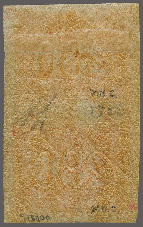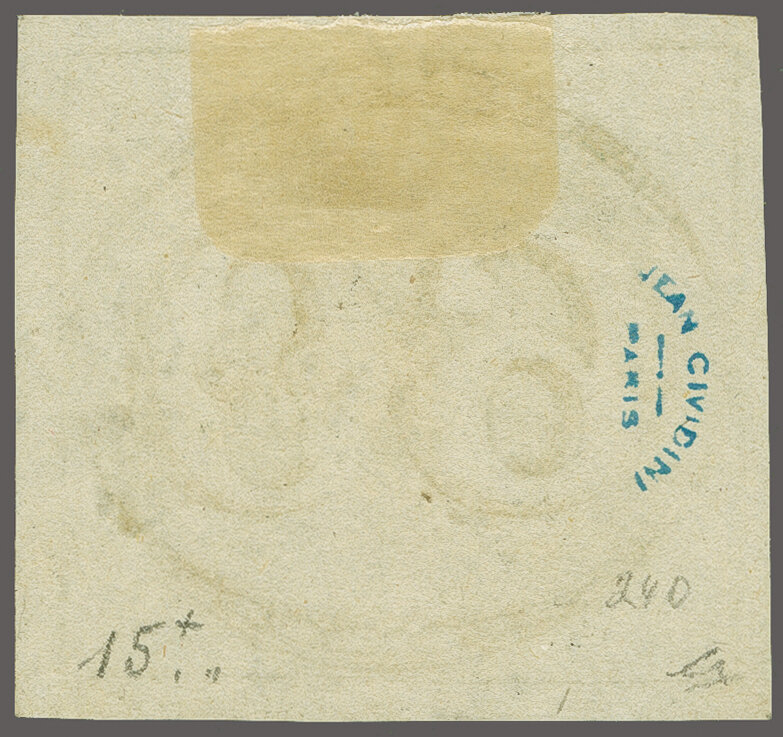 151 image90 reis grey-black, Intermediate Impression on yellowish paper, showing the horizontal marginal line at top, large margins on all sides, cancelled by "Correio Geral Da Corte" circular datestamp in black; with major retouching to the vertical frameline at right and in the numeral '9' at left. An unusual and attractive stamp. Provenance: Collection Dr. Hugo Goeggel, Corinphila sale 178, Feb 2013, lot 4172. (Image 1) (Image 2)