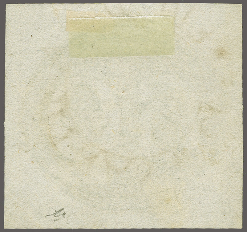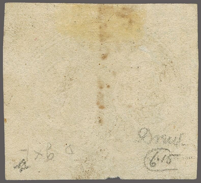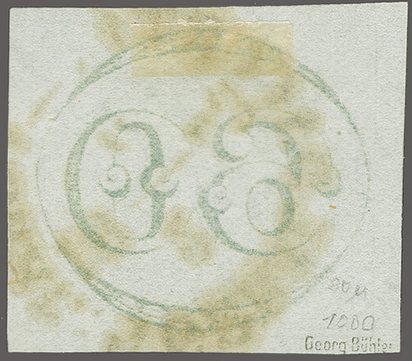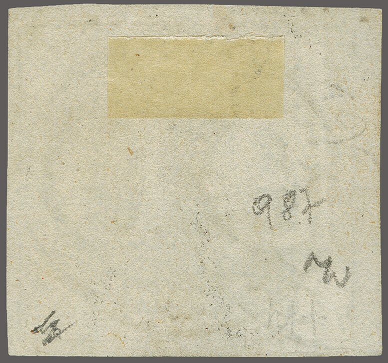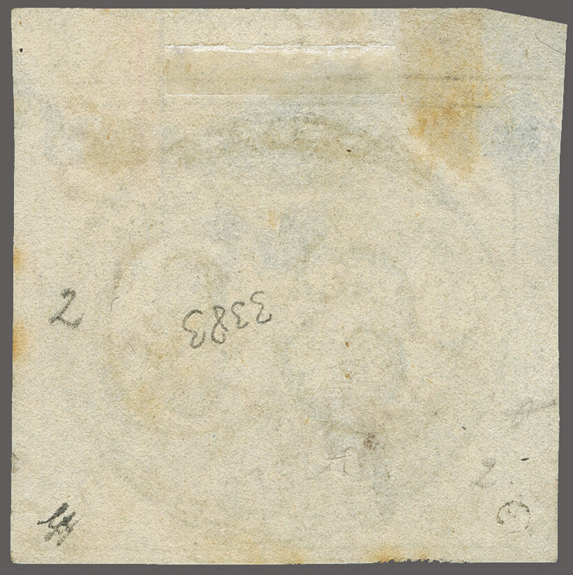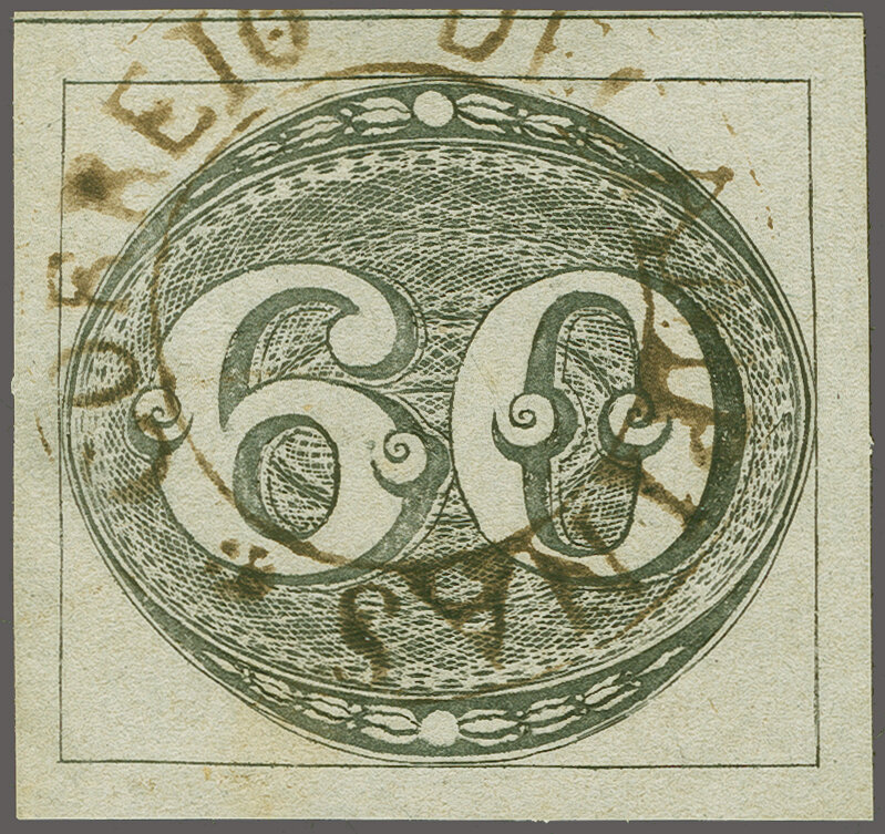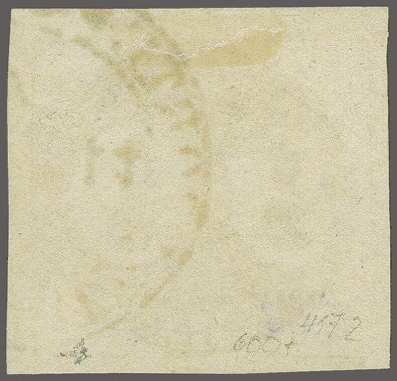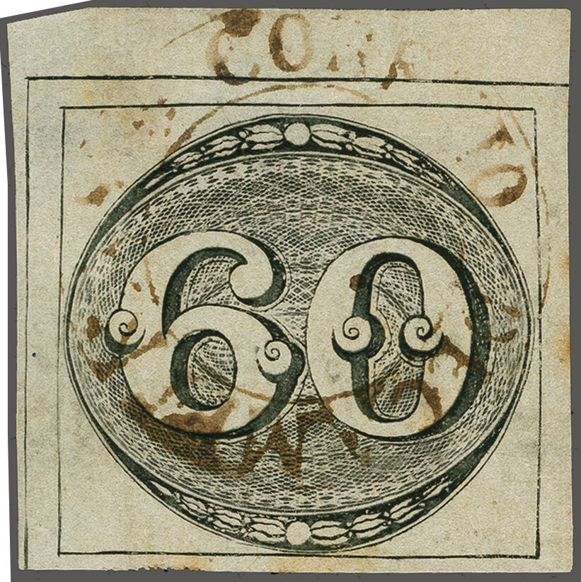 146 image60 reis grey, Worn Impression on thin greyish paper (note the complete lack of cross-hatching between the '6' and '0'), four large even margins, cancelled by rimless "Correio Da Geral Da Corte" cds in black: an early usage - appears to be dated "2-8-1843" but second figure of day missing. Signed Bühler. Provenance: Collection Dr. Hugo Goeggel, Corinphila sale 178, Feb 2013, lot 4068. (Image 1) (Image 2)