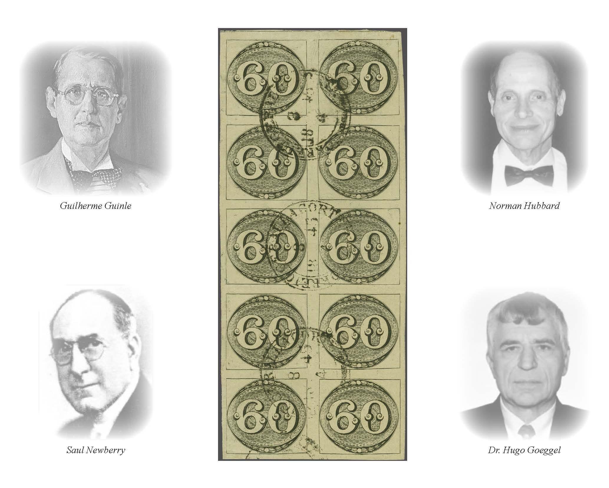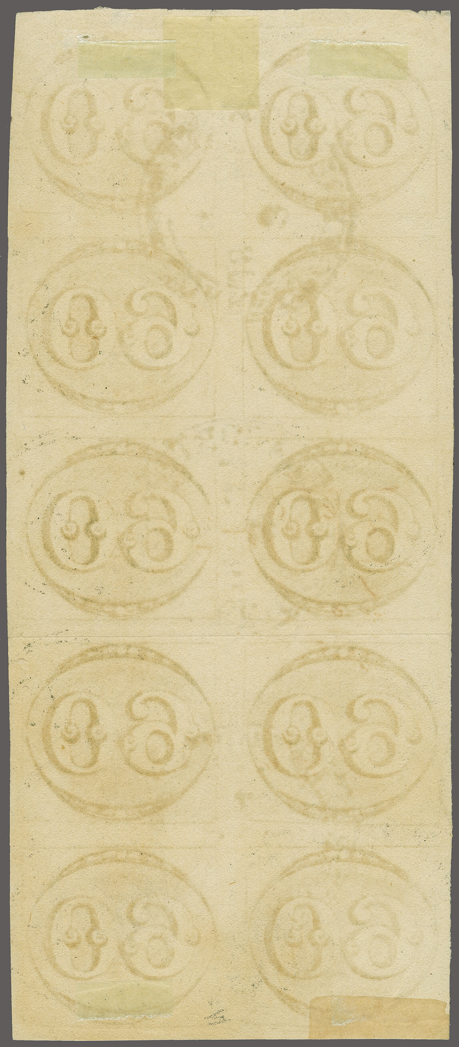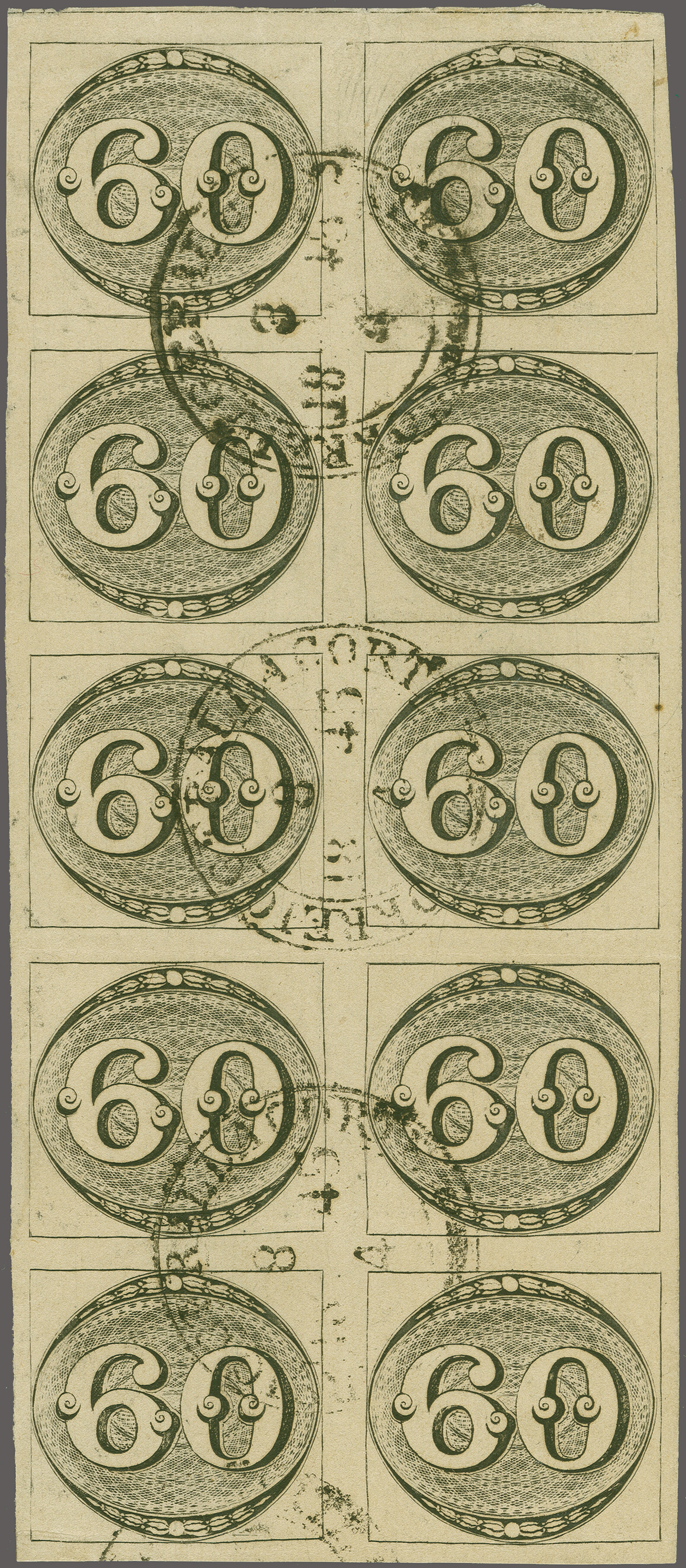 145 bof image60 reis grey-black, Intermediate Impression on yellowish paper, the magnificent vertical block of ten from the 2nd. Large Plate, State B (positions 5-6/11-12/17-18/23-24/29-30) and thus from the top right corner of the sheet, with outer frame line visible at top. Huge margins all round and neatly cancelled by "Correio Geral Da Corte" datestamps (April 8, 1845). But for a horizontal crease in margin between the third and fourth rows a faultless and delightful multiple of the utmost importance in Brazilian philately. Illustrated in "Die Ochsenaugen" by Jose Kloke on page 47; and in Juchert "Ochsenaugen im Viererblock" on page 51. Originally illustrated in "Bulls Eyes" L.G. Brookman's artcile on Saul Newbury's collection in the Collectors Club (1943) on page 136, when the multiple was a vertical block of twenty, this being both the finest and most attractive of the two multiples (the lower block has the eighth stamp with large closed tear). A truly wonderful Exhibition piece for the specialist. Provenance: Collection Lieut.-Colonel G.S.F. Napier (1923); Guilherme Guinle (1937); Saul Newbury (1967); Norman S. Hubbard, Siegel, New York, 25 May 1986, lot 2058; Dr. Hugo Goeggel, Corinphila sale 178, Feb 2013, lot 4122. Note: Lieut.-Colonel G.S.F. Napier in "Brazil" states on page 15 that the block of 20 proved "that there was a large plate in existence as well as the small panes of 18". (Image 1) (Image 2) (Image 3)