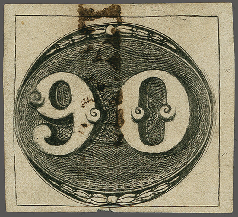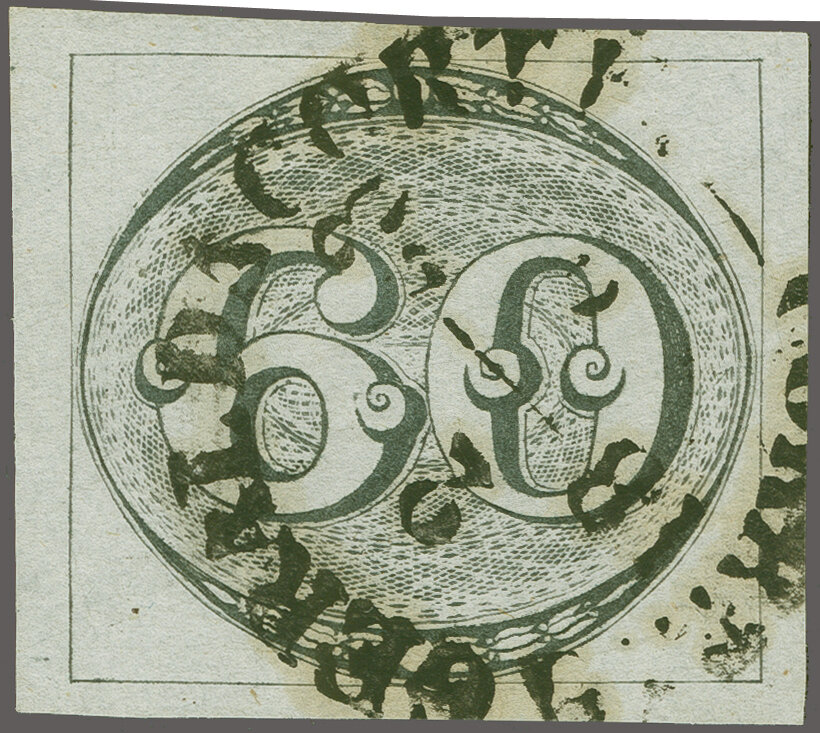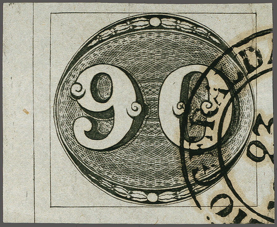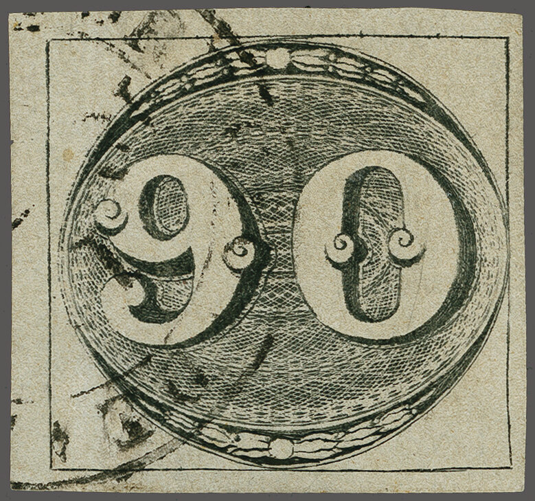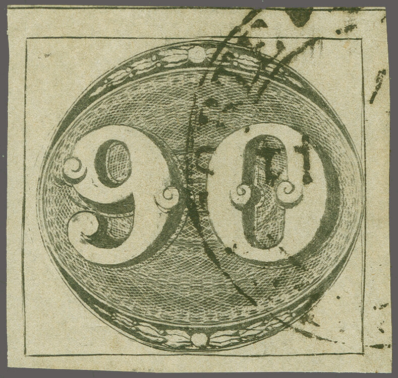 150 image1843: 90 r. deep black, Early fine Impression, a fine used example with ample margin at base and large on three sides, neatly cancelled by part straight line handstamp in red-brown. A rare and most attractive stamp Scott = $ 1'400. (Image 1) (Image 2)