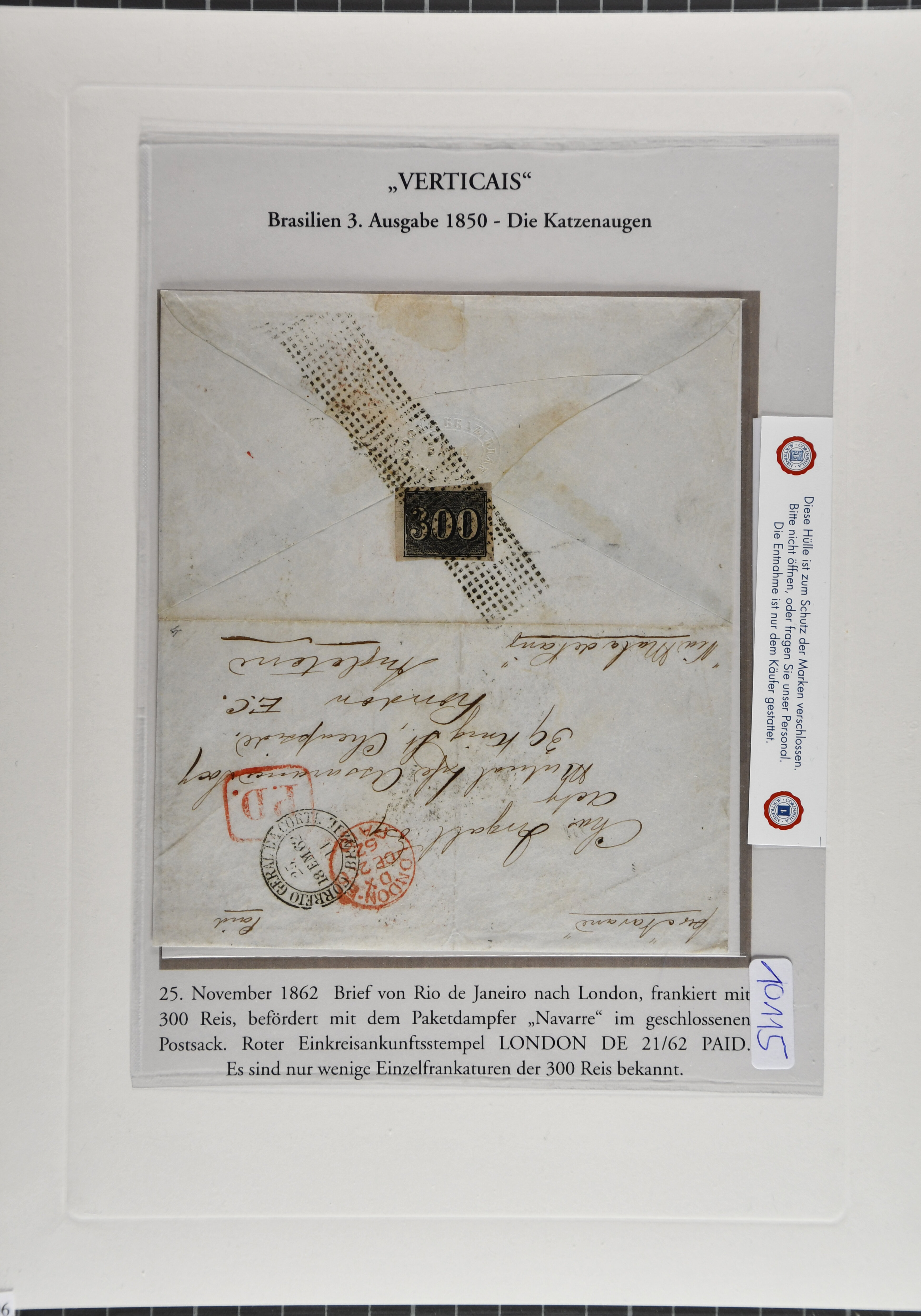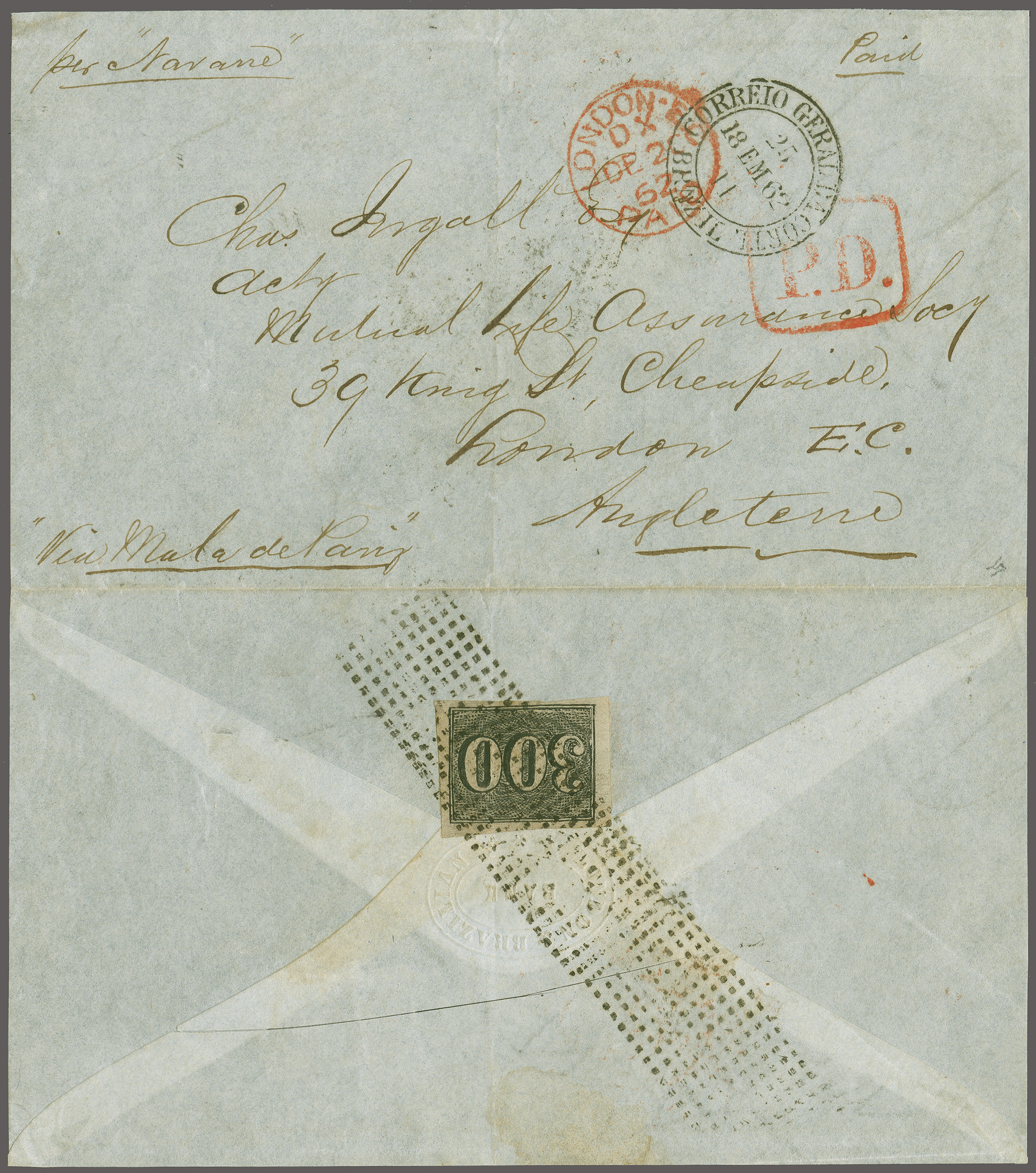 159 cover imageVerticais 1850: 300 r. black, a very fine used example on reverse of 1862 cover from Rio de Janeiro to London endorsed "Paid" and "per Navarre" and "Via Mala de Paris" in manuscript, tied by large dotted roller handstamp of Rio de Janeiro in black with "CORREIO GERAL DA CORTE" despatch cds on obverse (Nov 25) with red framed "P.D." below. "London / Paid" arrival cds (Dec 21) in red. Sensibly opened for Exhibit display, a magnificent and rare cover with just three such single frankings recorded. Provenance: Collection Marcos Chusyd, Soler y Llach, Barcelona, 5 Dec 2017, lot 2111. (Image 1) (Image 2)