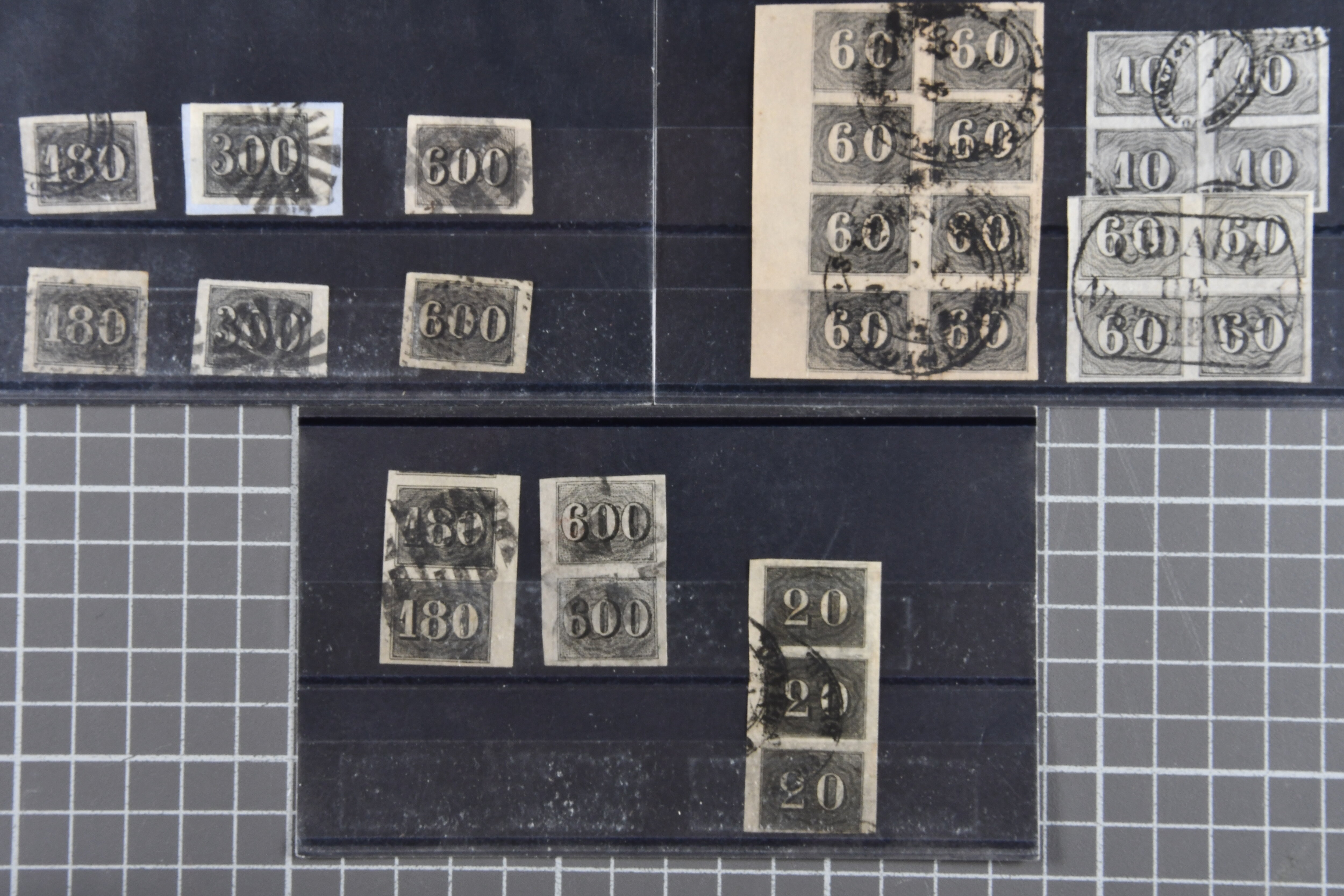 157 bof image1850: Verticais: group of used blocks, pairs and singles, comprising block of four of the 10 r., vertical strip of three of the 20 r., side marginal block of eight and block of four of the 60 r., vertical pair and two singles of the 180 r., two singles of the 300 r. including one tied to small piece and a vertical pair and two singles of the 600 r. value, all with four margins, most with large to very large, some faults, although several fine, a scarce and useful assembly Scott = $1'350 as singles. Ex the Brian Moorhouse Estate. (Image 1)