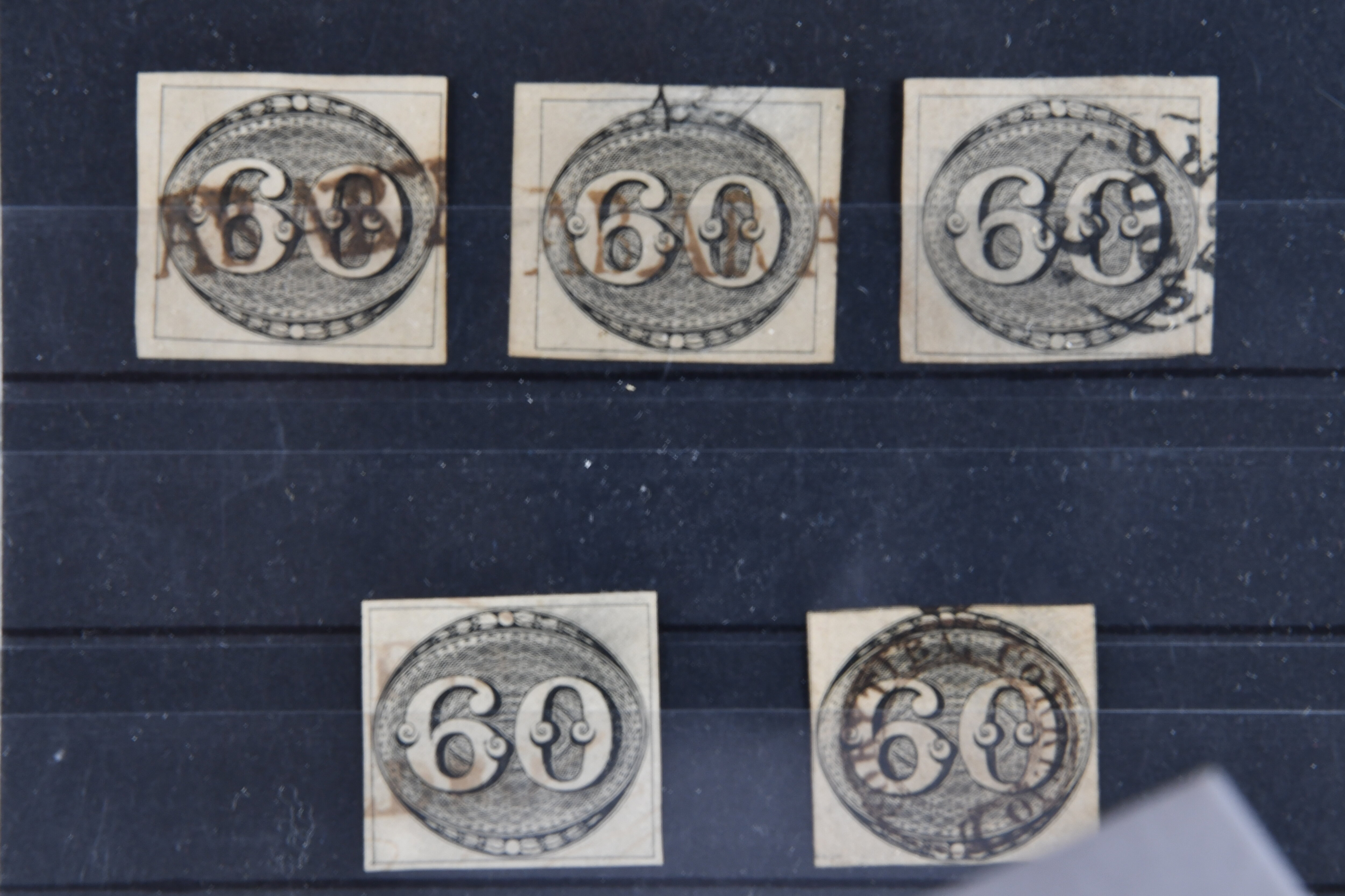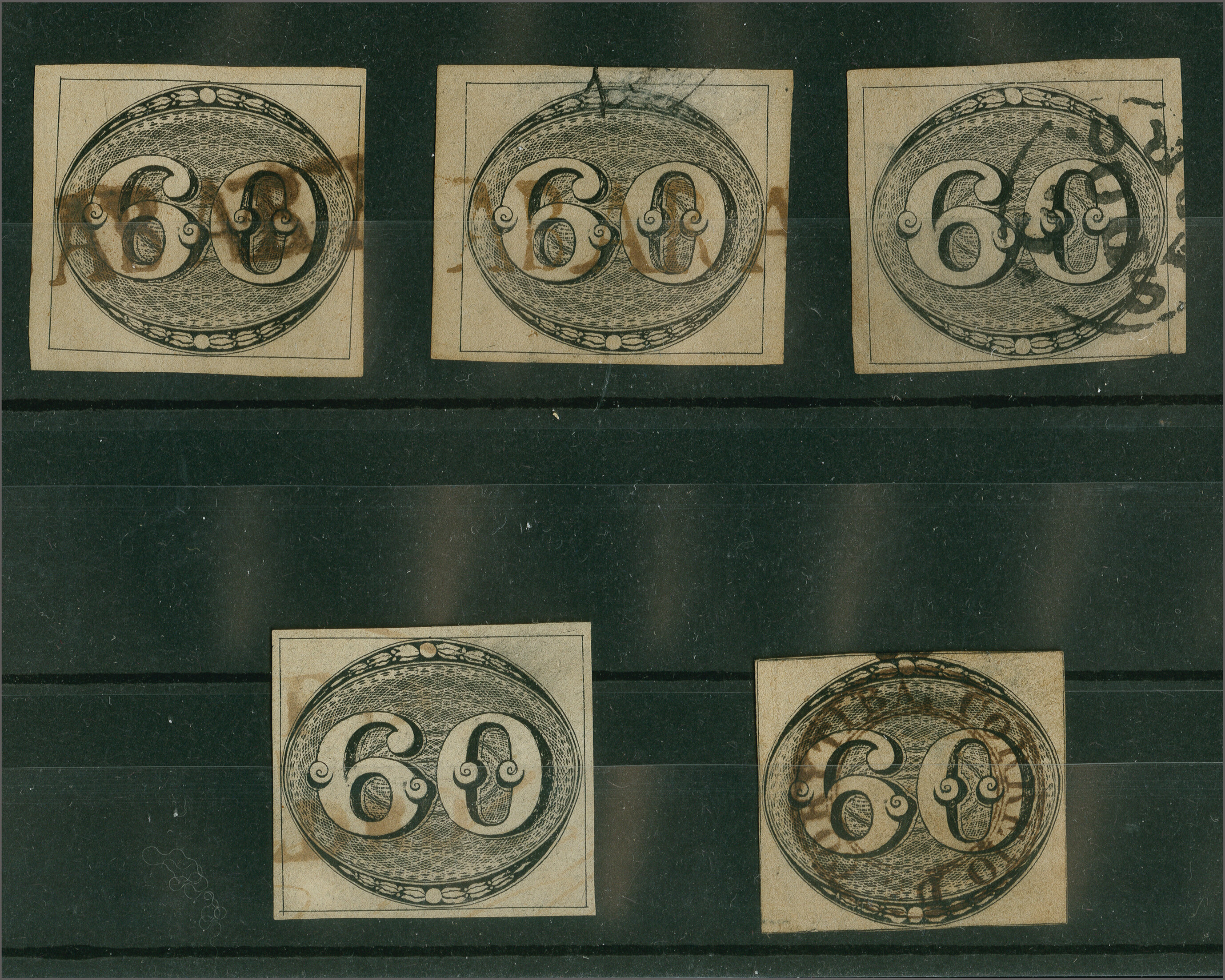 148 image60 reis black or grey-black, used examples (5), with two showing straight line SABARA" handstamp in brown, another with fine strike of "C. DO SERRO" circular handstamp in black, fourth with faint "ALDEIA DA PEDRA" handstamp and a narrow margined example with "CORREIO DE CORYTIBA" in brown; all have faults but a scarce group. (Image 1) (Image 2) (Image 3)