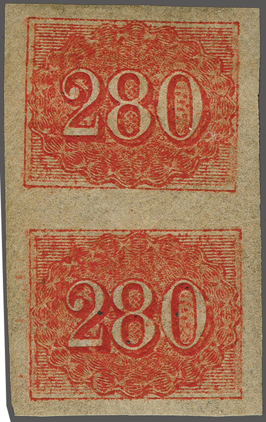 160 * image1861: Coloridos 280 r. vermilion, an unused vertical pair with large margins allround, minor bends due to crackling of original gum. Signed A. Diena Scott = $ 320+. (Image 1) (Image 2)