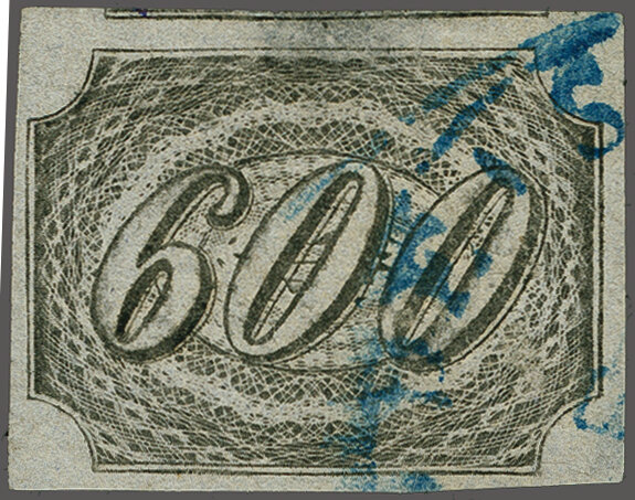 155 image1844/46: Inclinado 600 r. black, a used example with good to large margins and showing portion of adjoining stamp at top, lightly cancelled by pair circular hanstamp struck in blue (and rare thus). Small hinge thin bit a rare usage Scott = $ 2'200. (Image 1) (Image 2)