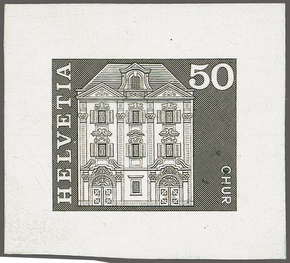 1960: Baudenkmäler, 50 Rp., ungezähnte Druckprobe in nicht ausgeführtem Motiv "Bischöfliches Schloss Chur" in schwarz auf weissem Kartonpapier ohne Gummierung. Rücks. violetter Firmenstp. "K. BICKEL-COURTIN / GRAVEUR U. MALER