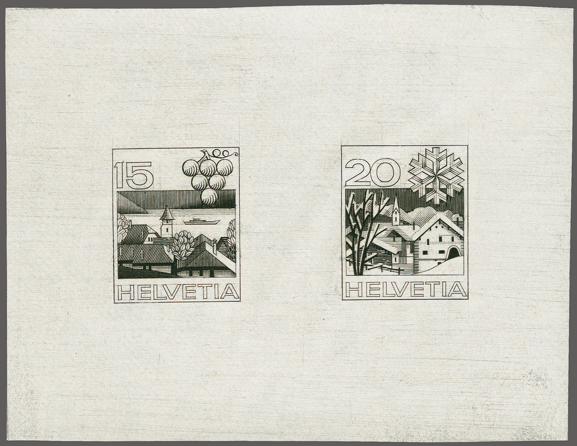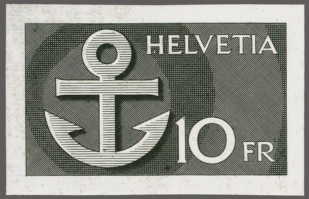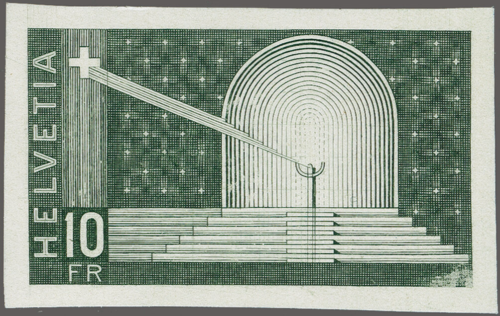 schraffiertem, rückseitig bedrucktem Ausschusspapier ohne Gummierung (51x77mm). Links zwei Prägestellen zur Befestigung. Ein interessanter und sehr seltener, ebenfalls von Hans Erni gezeichneter Alternativentwurf aus dem Bickel-Archiv. Anmerkung: