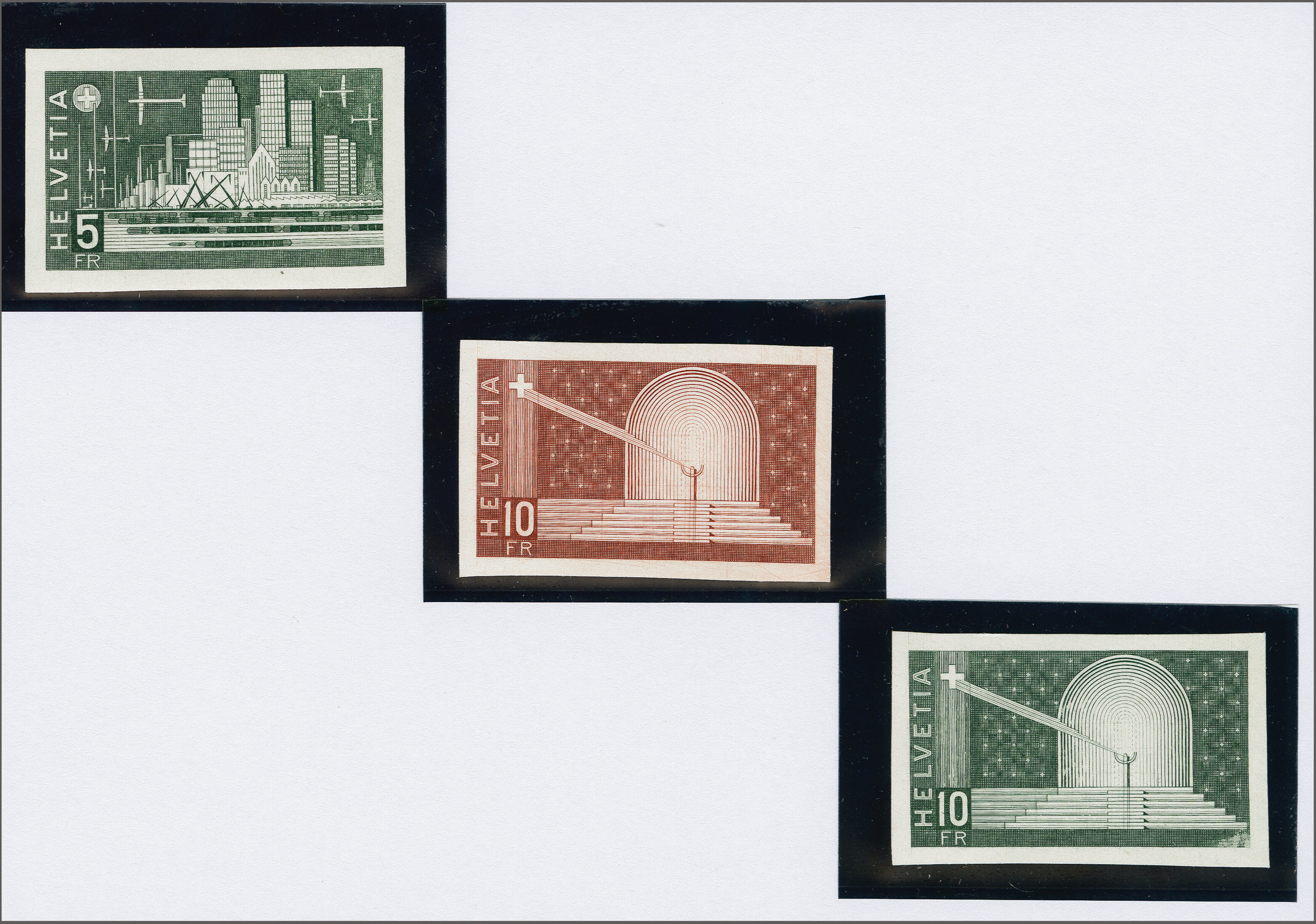 1961: Freimarken hohe Wertstufen, drei ungezähnte Druckproben in nicht ausgeführten, futuristischen städtebaulichen Motiven und Wertinschrift "5 Fr." resp. "10 Fr." (2) in schwärzlichgrün (2) resp. rotbraun, je einzeln auf