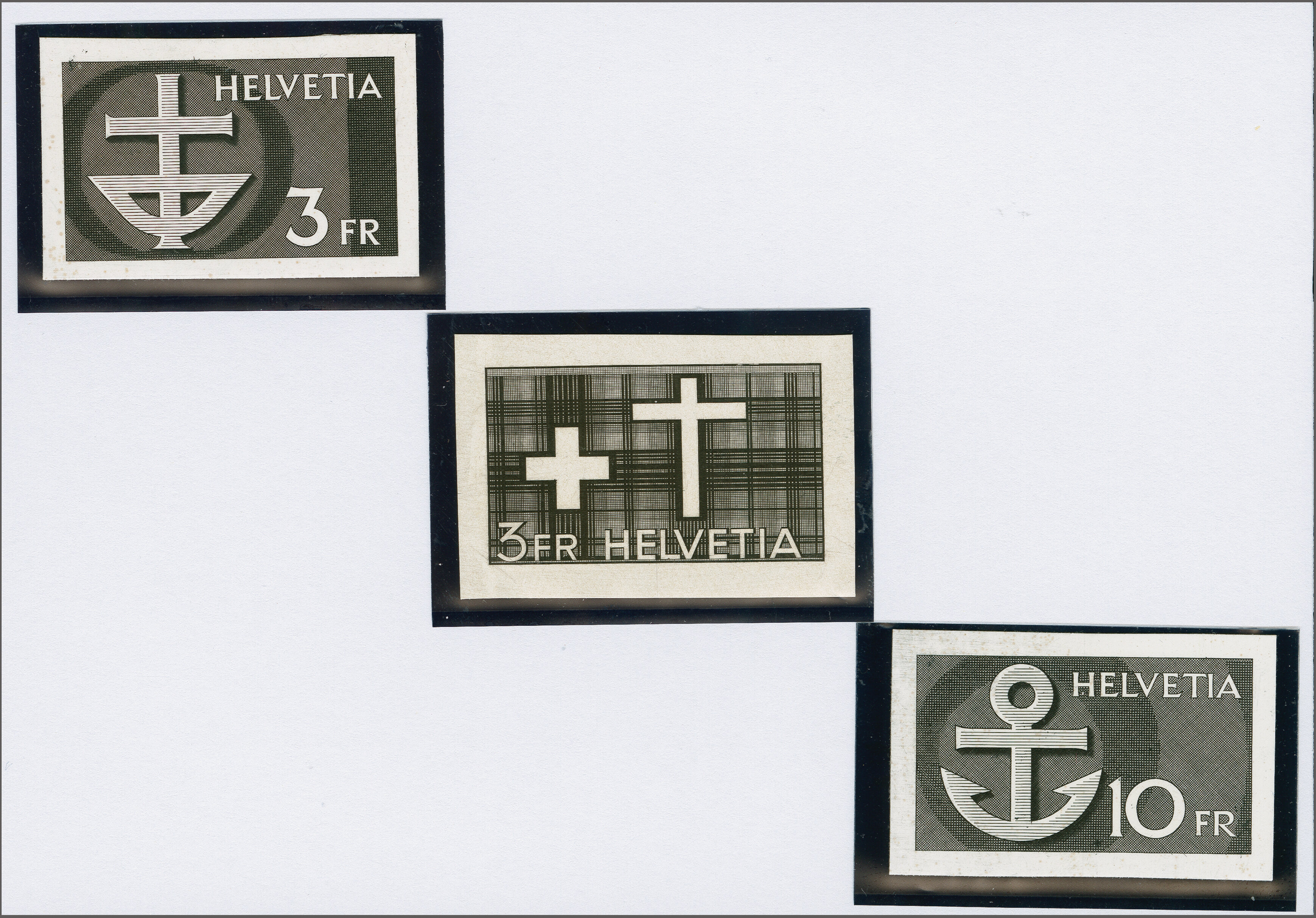 1961: Freimarken, hohe Wertstufen, drei ungezähnte Druckproben mit nicht-ausgeführten religiösen Motiven und Wertinschriften zu "3" resp. "10 Fr.", je einzeln in schwarz auf weissem Kartonpapier ohne Gummierung. Drei