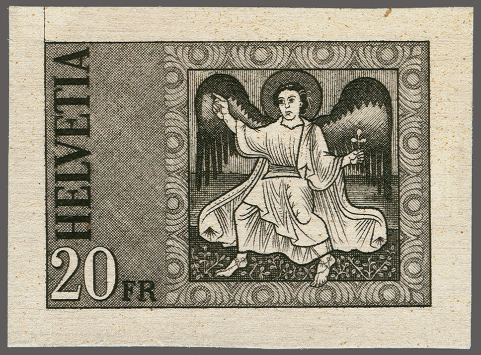 1961: Freimarken hohe Wertstufen, 20 Fr., ungezähnte Druckprobe in nicht ausgeführtem Engel-Motiv in schwarz auf weissem Kartonpapier ohne Gummierung. Eine attratkive und seltene Probe aus dem Bickel-Archiv. (Image 1)