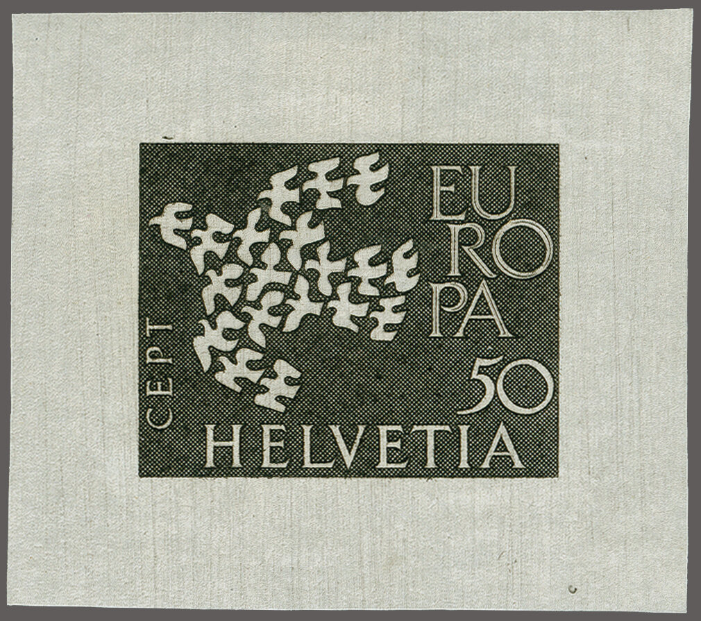 1961: EUROPA-Marken 50 Rp. "Taubenschwarm", ungezähnte Druckprobe in schwarz auf ungummiertem weissem Papier mit rücks. Bandeindruck "WERTZEICHENDRUCKEREI GD PTT" und Kugelschreibernotiz "PS". (37x41mm). Eine seltene Probe aus