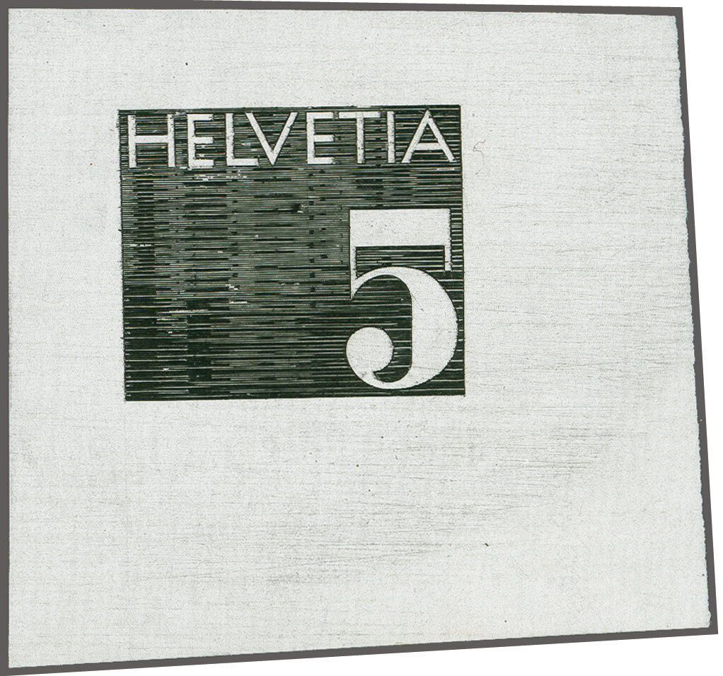 1970: Ziffermarken, ungezähnte Druckprobe für einen nicht verausgabten 5 Rp.-Wert in einer weitgehend der definitiven Ausführung entsprechenden Zeichnung in schwarz auf weissem, rückseitig bedrucktem Ausschusspapier ohne