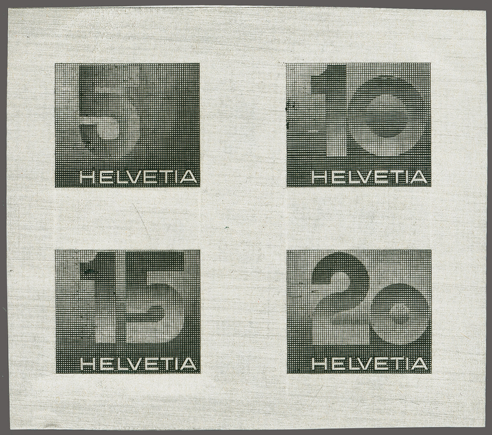 1970: Ziffermarken, vier ungezähnte Druckproben in einer nicht ausgeführten Zeichnung der Wertstufen 5, 10, 15 und 20 Rp., als Viererblock angeordnet, in schwarz auf rückseitig bedrucktem, weissem Ausschusspapier ohne