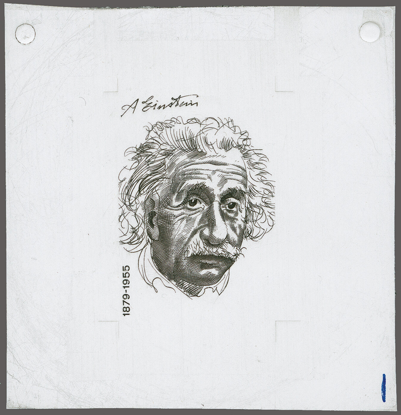 1972: Portraitmarken III, 40 Rp. Albert Einstein, Einzelabzug des von Hans Erni gezeichneten definitiven Portraits mit Unterschrift und Lebensdaten aber noch ohne Landesbezeichnung und Wertangabe in schwarz auf weissem