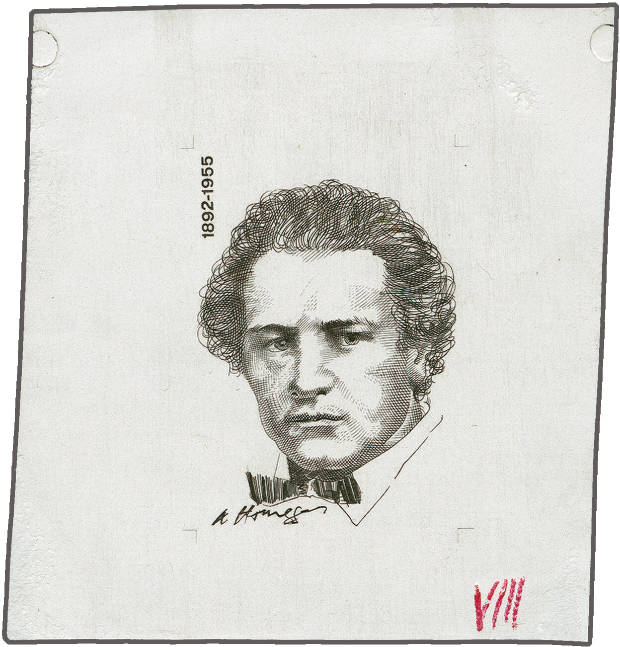 1972: Portraitmarken 80 Rp. Arthur Honegger, Einzelabzug des von Hans Erni gezeichneten definitiven Portraits mit Unterschrift und Lebensdaten aber ohne Wertangabe oder Landesbezeichnung in schwarz auf weissem, rückseitig