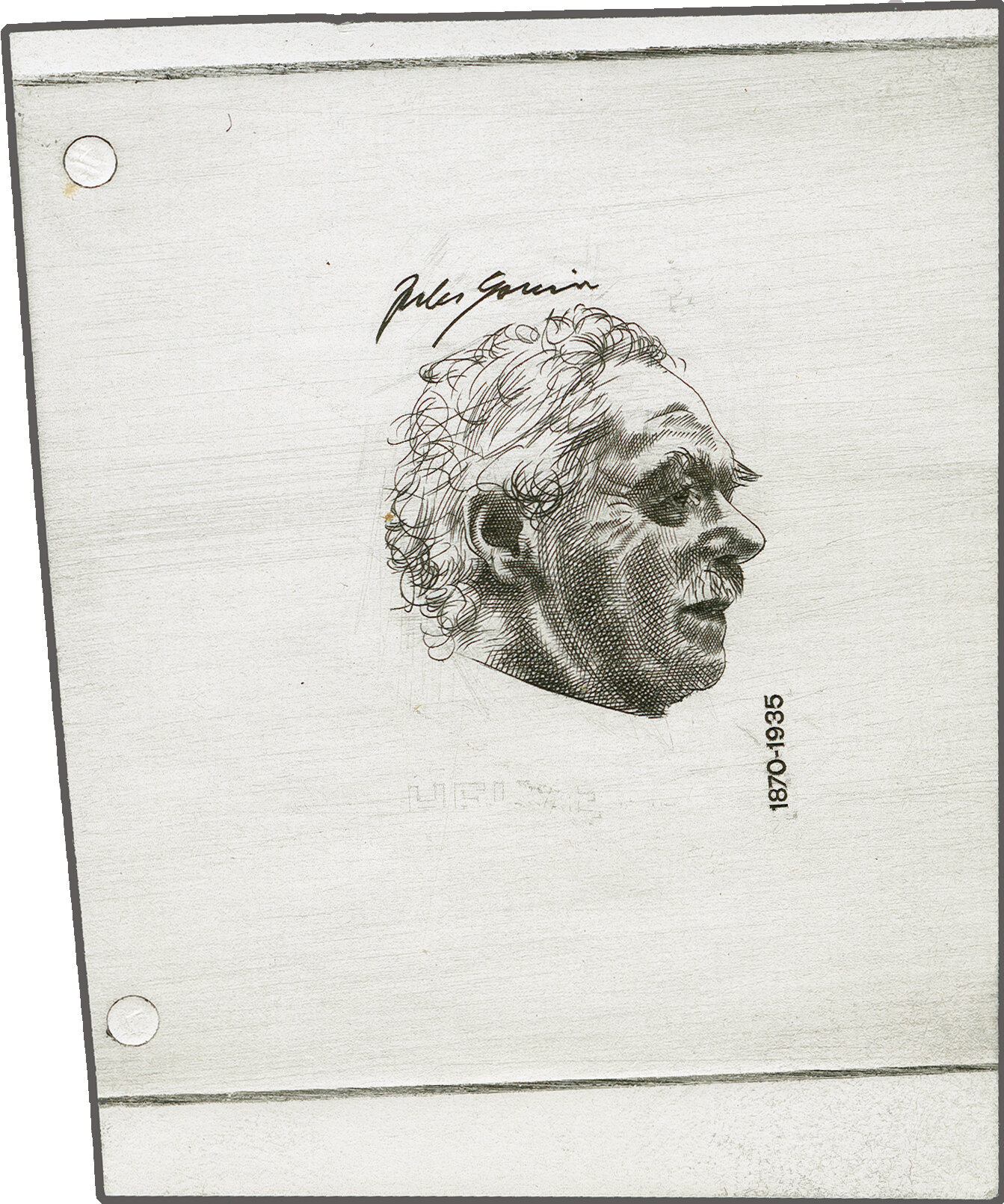 1972: Portraitmarken III, Einzelabzug eines nicht ausgeführten Portraits von Jules Gonin mit Unterschrift und Lebensdaten sowie schemenhaft auszumachender Landesbezeichnung aber ohne Wertangabe in schwarz auf mit Kohlestift