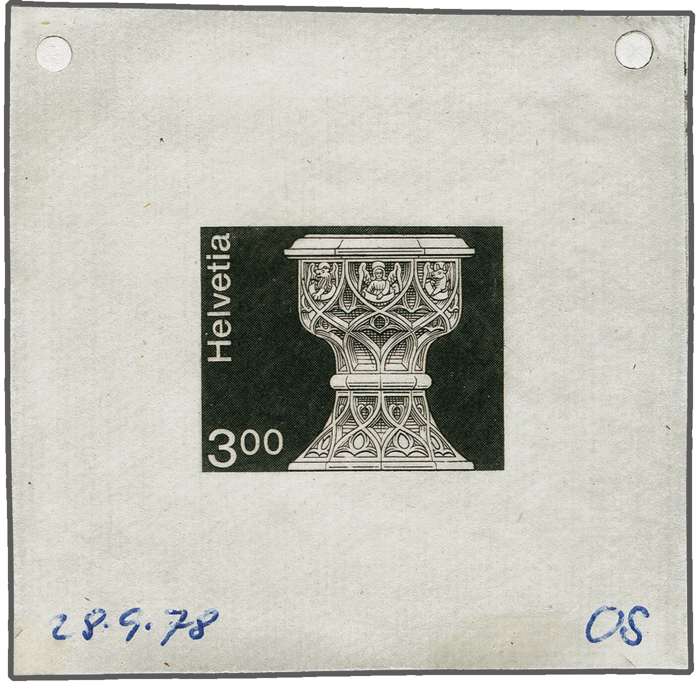1978: Architektur und Kunsthandwerk 3 Fr. Taufstein, Einzelabzug in schwarz auf weissem Kunstdruckpapier ohne Gummierung (56x58mm). Links unten in blauem Kugelschreiber datiert "28.9.78" sowie rechts unten Notiz "OS" und oben