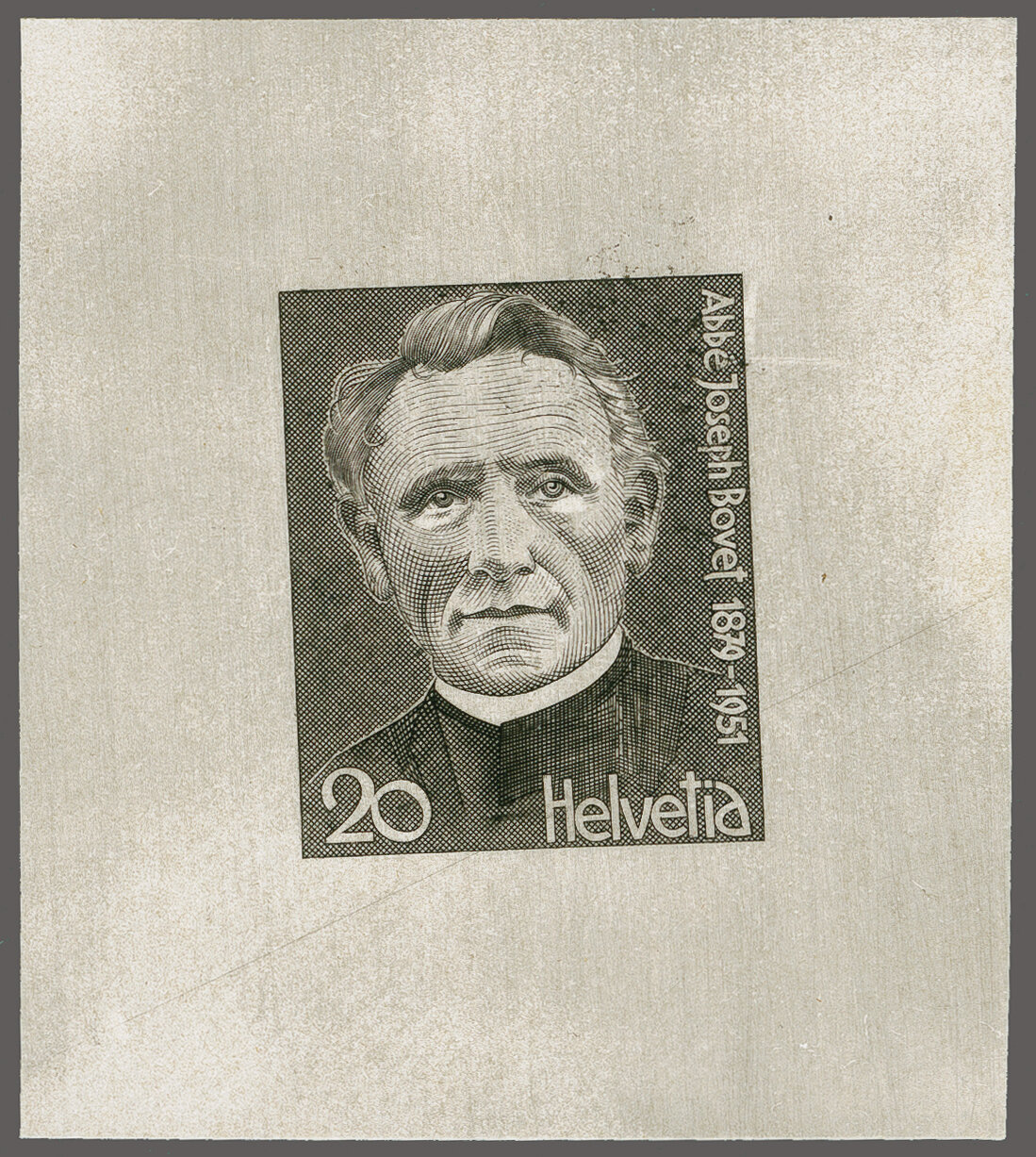 1978: Portraitmarken V, 20 Rp. Abbé Joseph Bovet, Einzelabzug in schwarz auf vorders. eingeschwärztem und rücks. bedrucktem, weissem Ausschusspapier ohne Gummierung (45x50mm). Eine seltene Probe aus dem Bickel-Archiv. (Image 1)