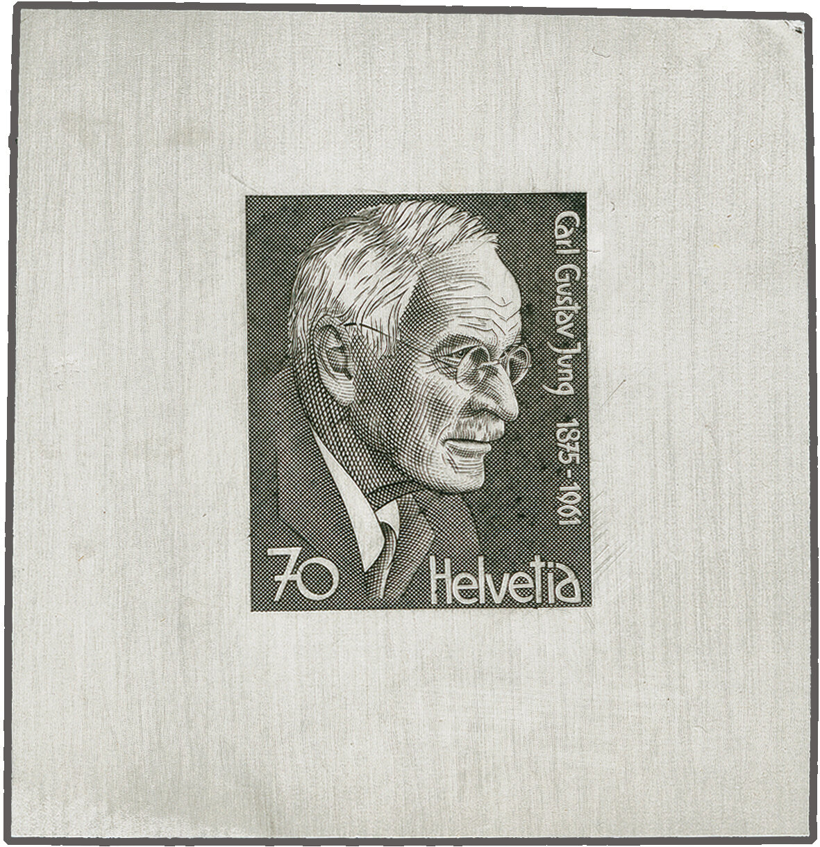 1978: Portraitmarken V, 70 Rp. Carl Gustav Jung, Einzelabzug in schwarz auf vorders. eingeschwärztem, weissem Kunstdruckpapier ohne Gummierung (49x51mm). Eine seltene Probe aus dem Bickel-Archiv. (Image 1)