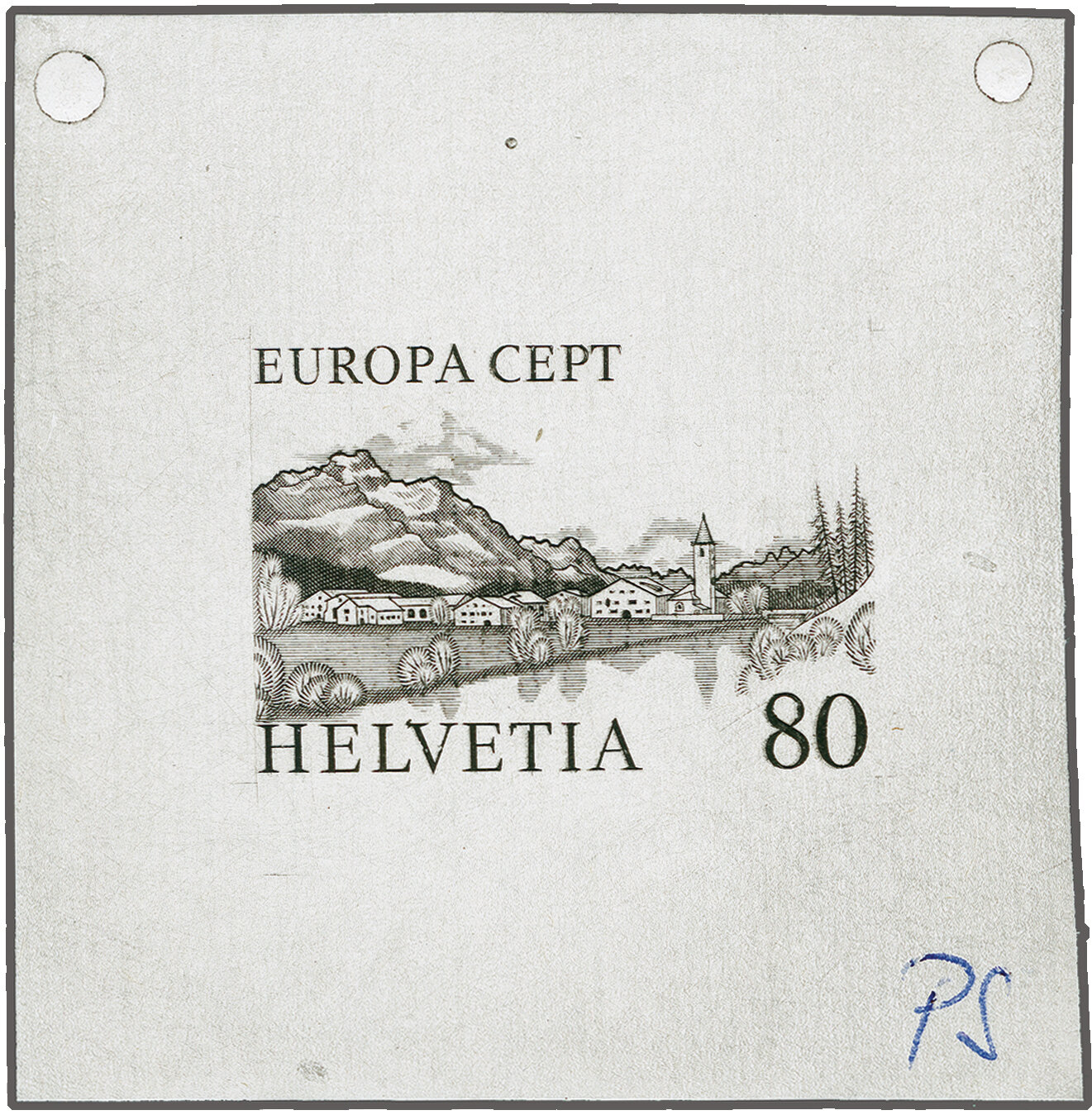 1977: EUROPA-Marke 80 Rp. Sils Baselgia, Einzelabzug in schwarz auf weissem Kunstdruckpapier ohne Gummierung (54x56mm). Rechts unten Kugelschreibernotiz "PS" in blau sowie oben zwei Prägepunkte zur Befestigung. Eine seltene