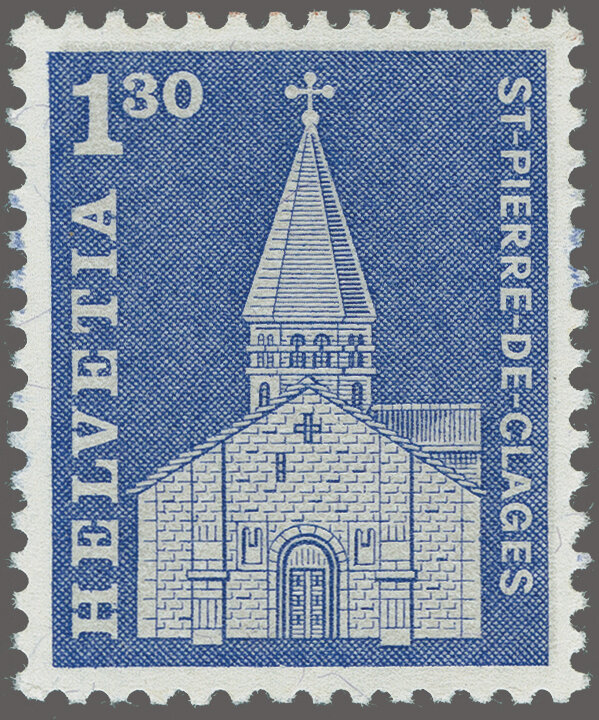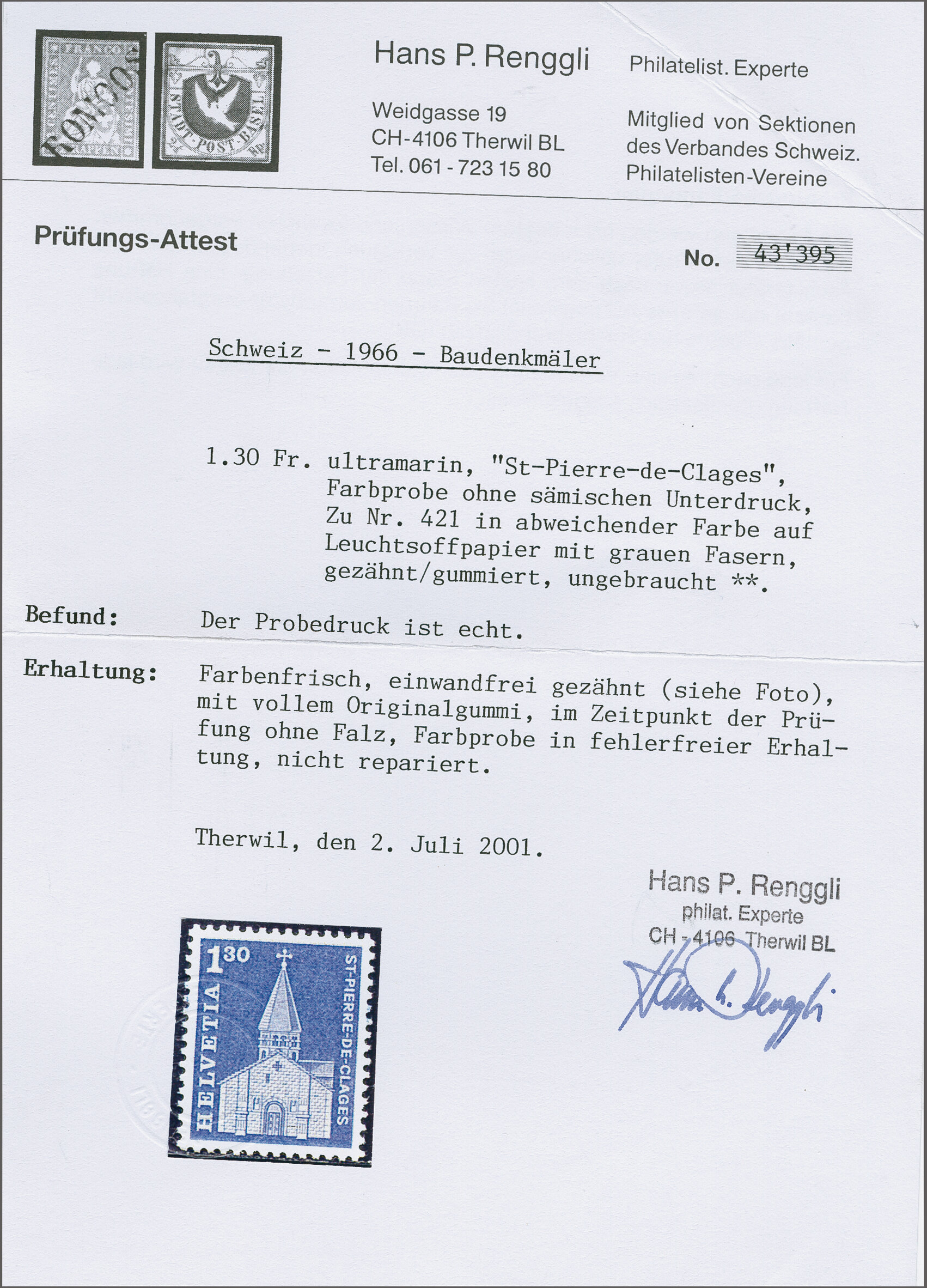 1964: Baudenkmäler Fr. 1.30 St. Pierre-de-Clages, gezähnte Farbprobe ohne sämischem Unterdruck auf gummiertem Leuchtstoffpapier mit grauen Fasern, gut gez., postfr. mit vollständigem Originalgummi. Attest Renggli (2001). (Image 1)
