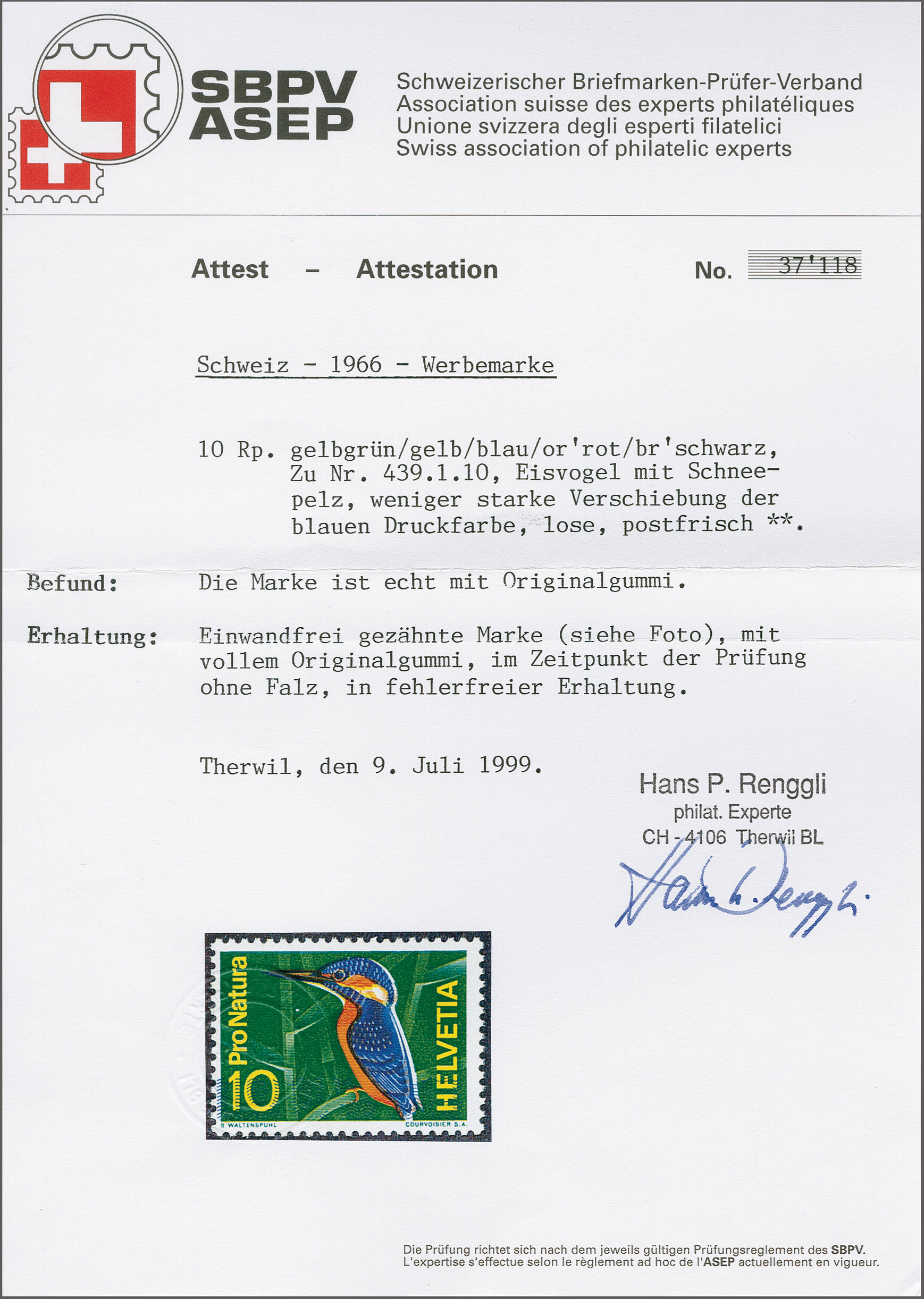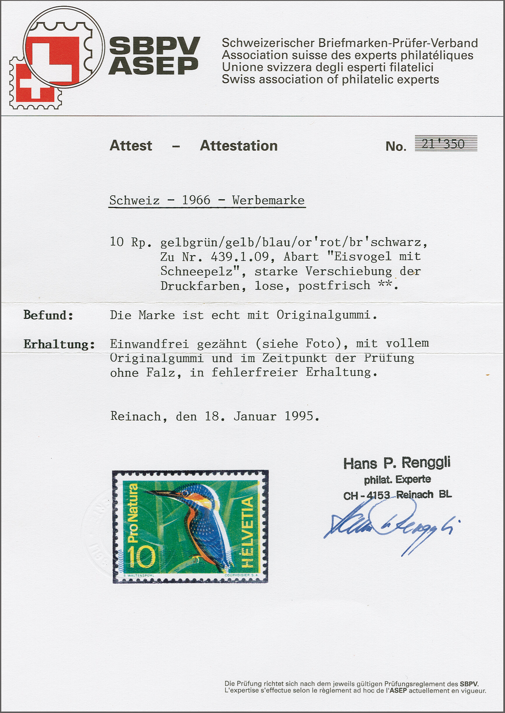 1966: 10 Rp. "Eisvogel im Schneepelz" mit schmaler Verschiebung der blauen Druckfarbe, gut gez., postfrisch und fehlerfrei. Attest Renggli (1999). SBK=CHF 800. (Image 1)