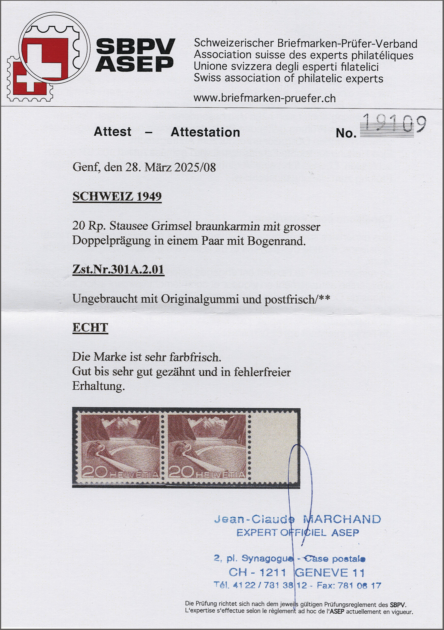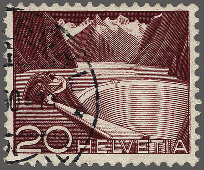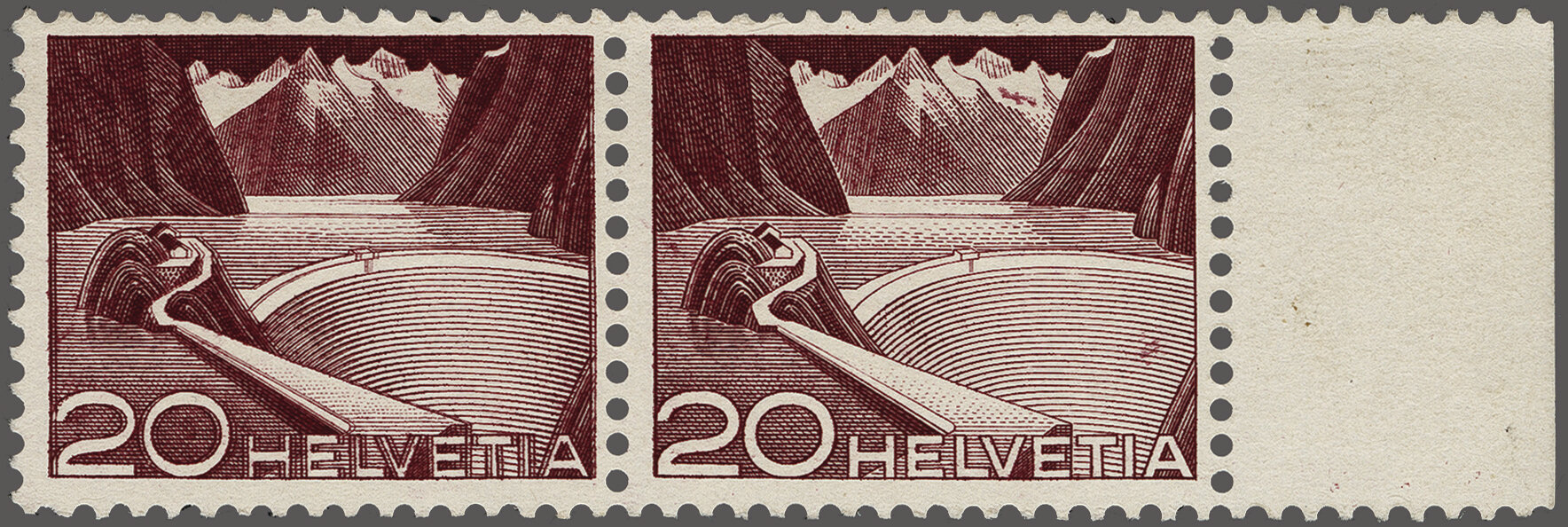 1949: Technik und Landschaft, 20 Rp. "Grimsel" mit Doppelprägung des ganzen Markenbildes (Bogen 2, Feld 29) im waagr. Paar mit Normalmarke (Feld 30), diese mit interessanter kl. Wischspur in der Staumauer, und mit Bogenrand