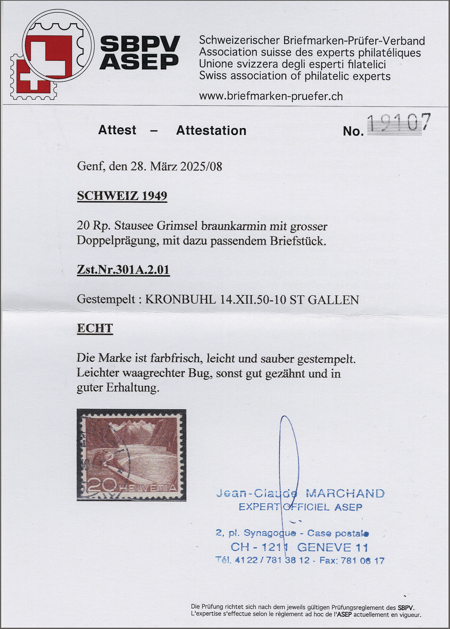 1949: Technik und Landschaft, 20 Rp. "Grimsel" von der nachgestochenen Platte mit Doppelprägung des ganzen Markenbildes, einwandfrei gez (leichte waagr. Bugspur), leicht und sauber gest. "[KRON]BÜHL (ST. GALLEN)