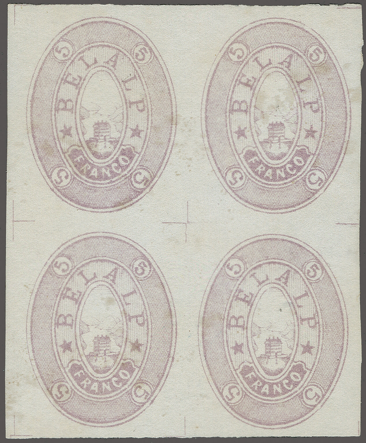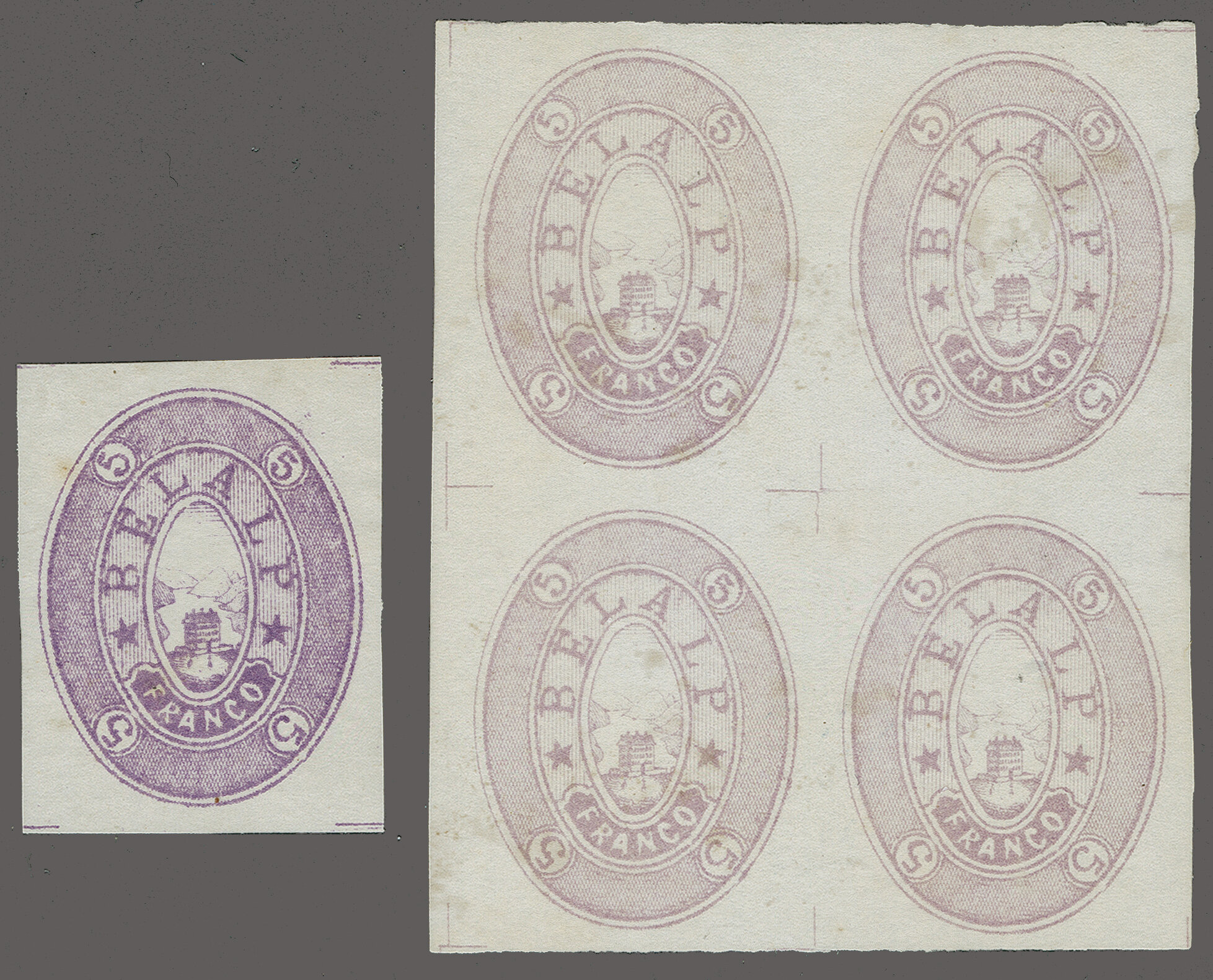 1883: Hotel Belalp, 5 Rp. blassviolett im ungebr. Viererblock sowie ungebr. Einzelwert 5 Rp. violett. Gute Erhaltung. SBK = CHF 1'100. (Image 1)