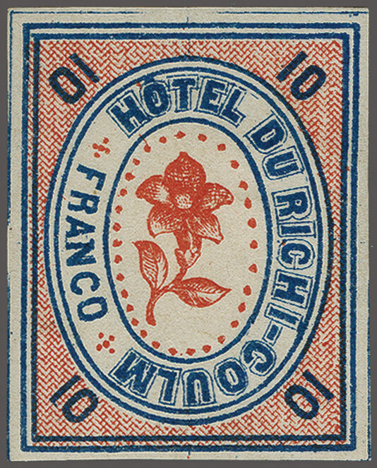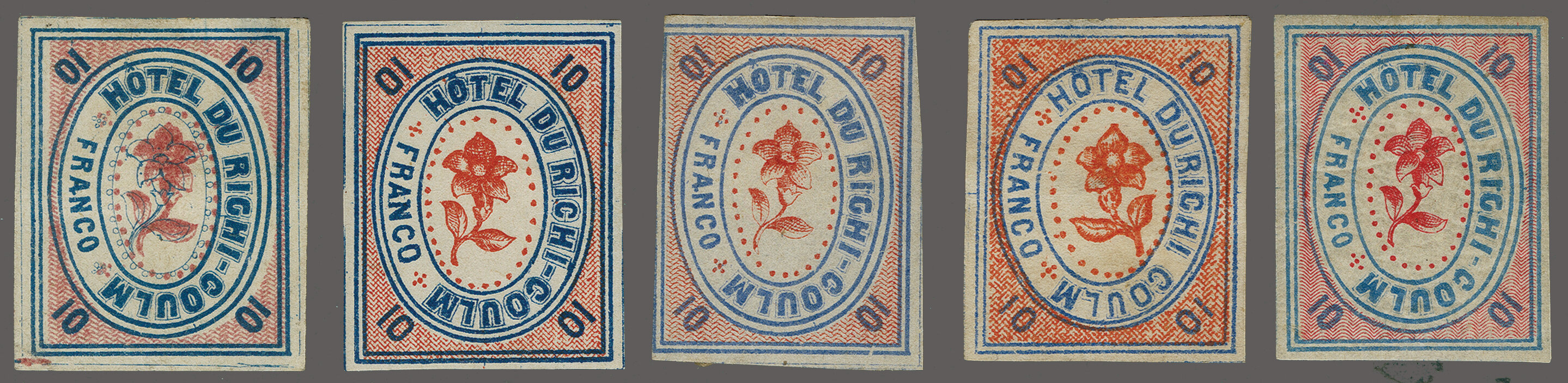 1870/78: Hotel Rigi-Kulm, 10 Rp. rot/blau in den fünf verschiedenen Ausführungen inklusive der seltenen Marke mit hellziegelroten, wellenförmigen Untergrundlinien, ungebraucht mit/ohne Gummi und in guter Erhaltung. SBK = CHF