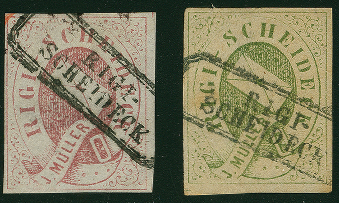 1868/70: Rigi-Scheideck: Lot 5 Rp. grün und 5 Rp. trübrosa, je schön entw. mit diagonal aufges. achteckigem Hotelstp., teils leichte Mängel aber ein attraktives Duo. SBK =CHF 300 (Image 1)