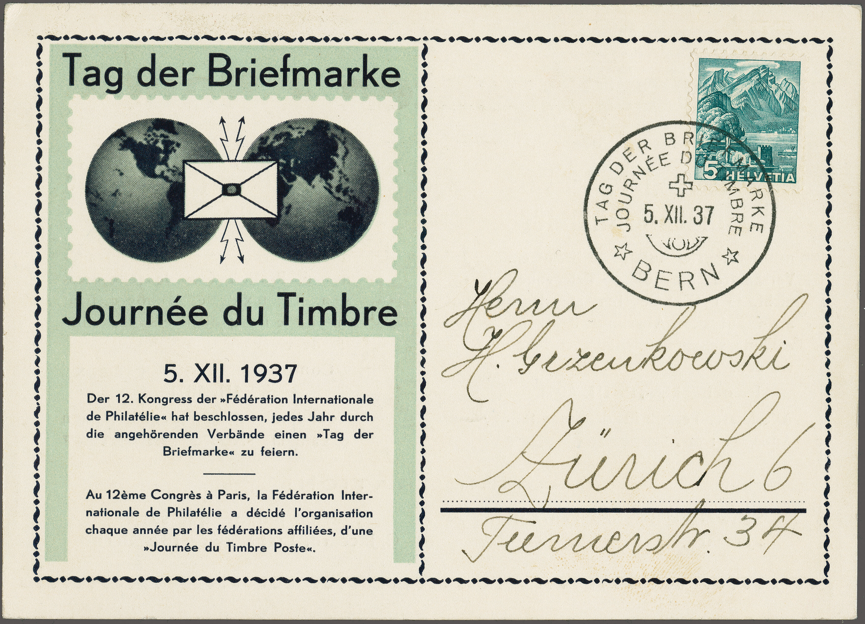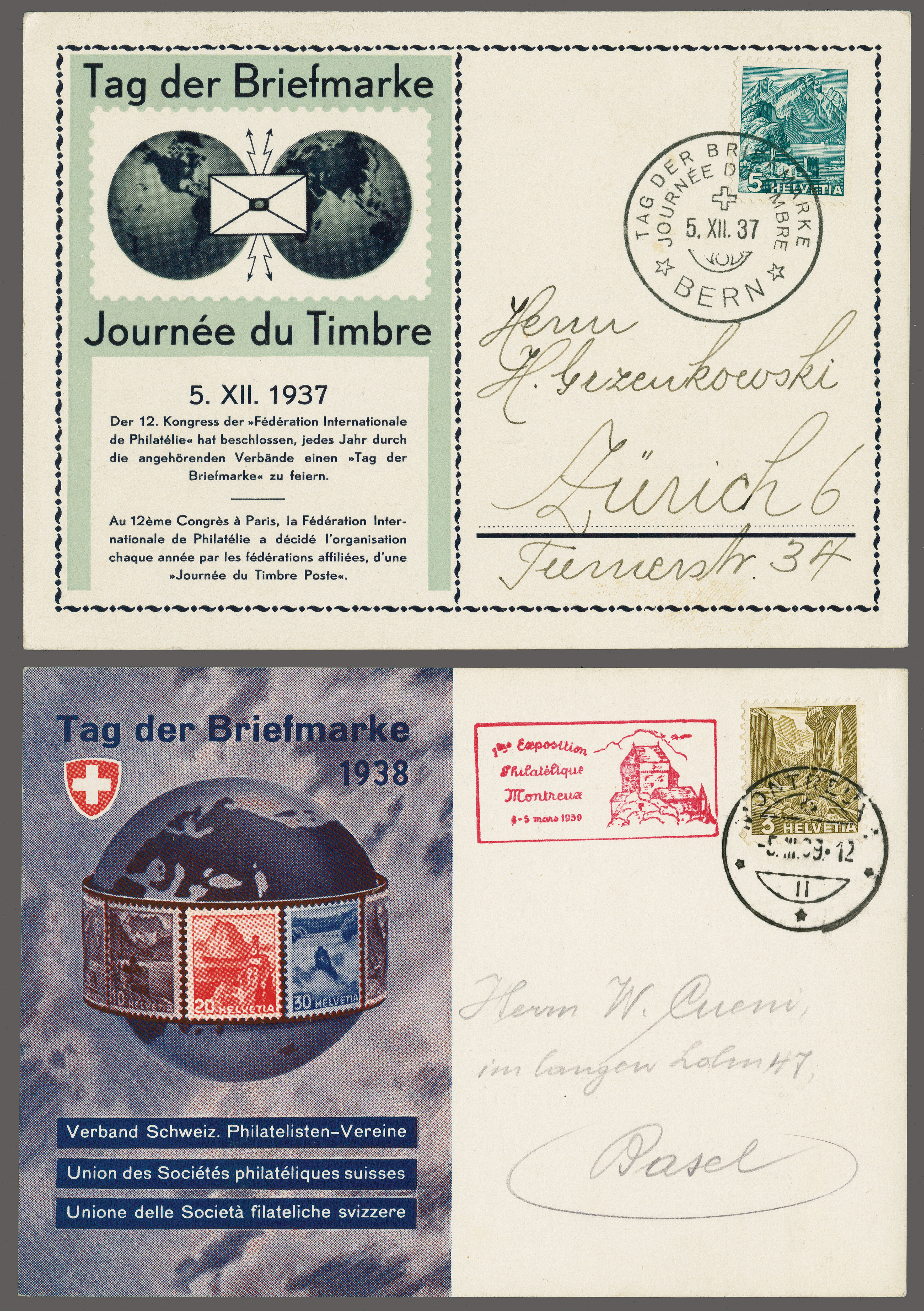 1937/38: Tag der Briefmarke, je offizielle Karte in dt., beide mit grossflächigem Zudruck auf der Rückseite 'Weihnachten' bzw. 'SBZ Inserat'. Tadellos erhalten. SBK = CHF 1'000. (Image 1)