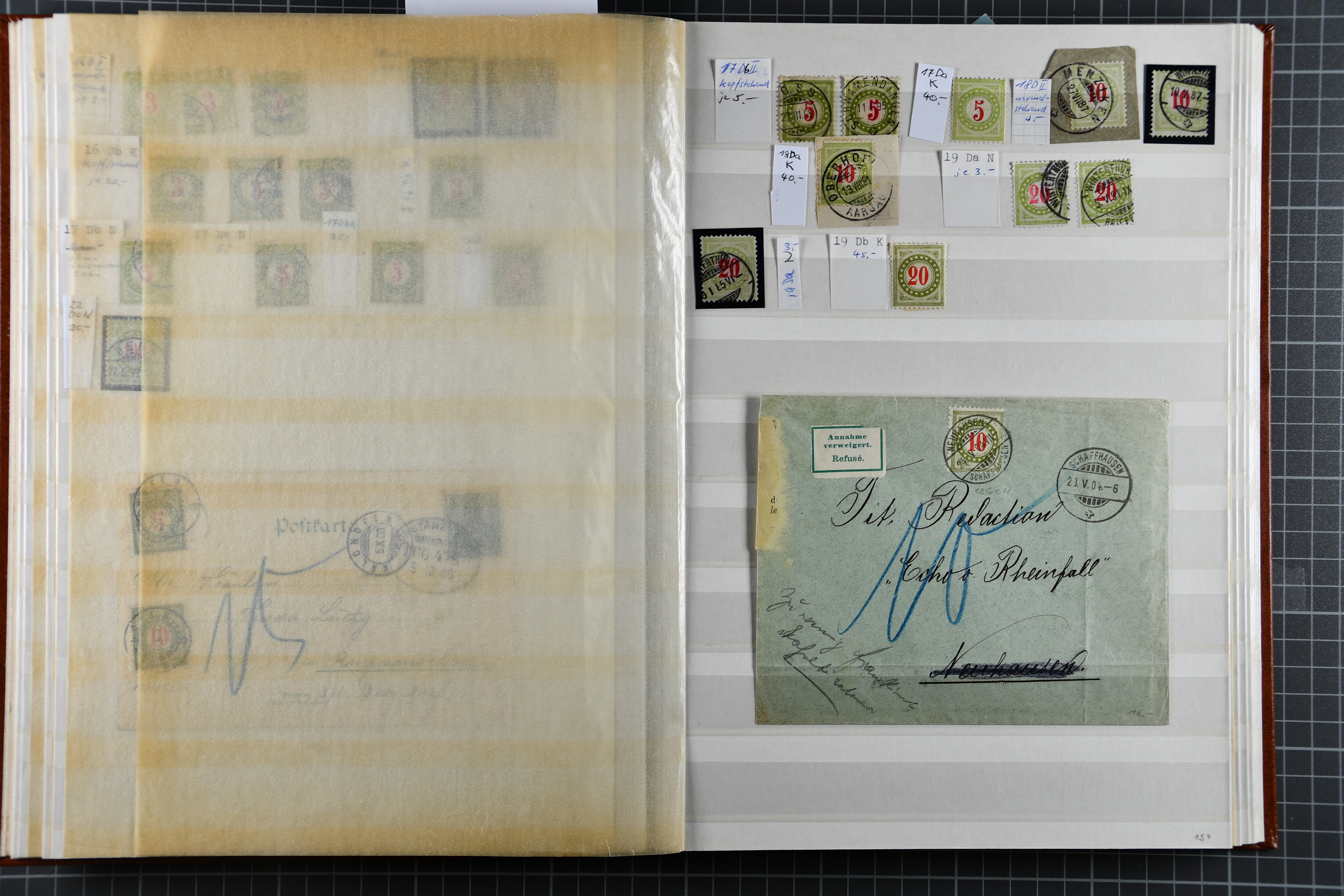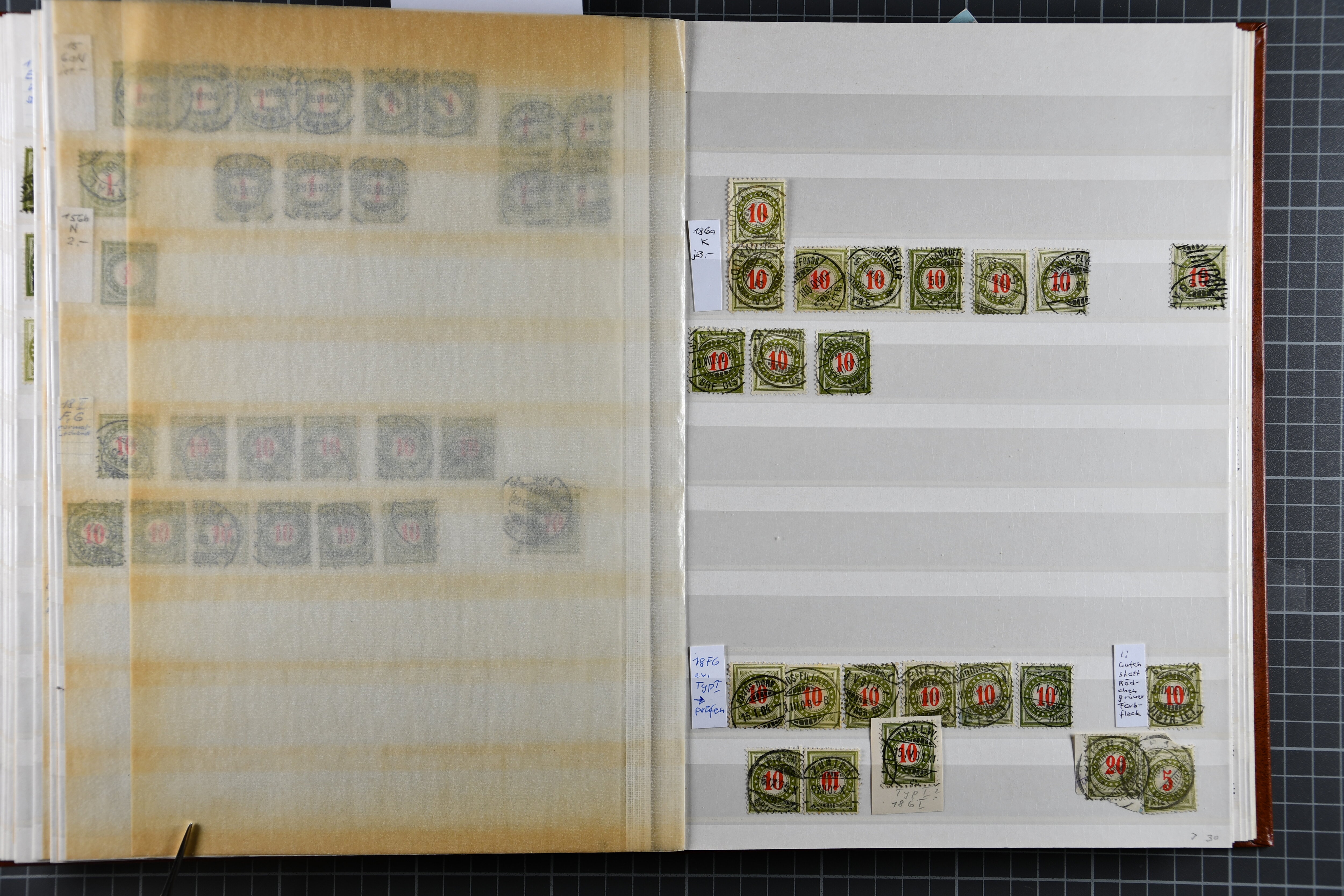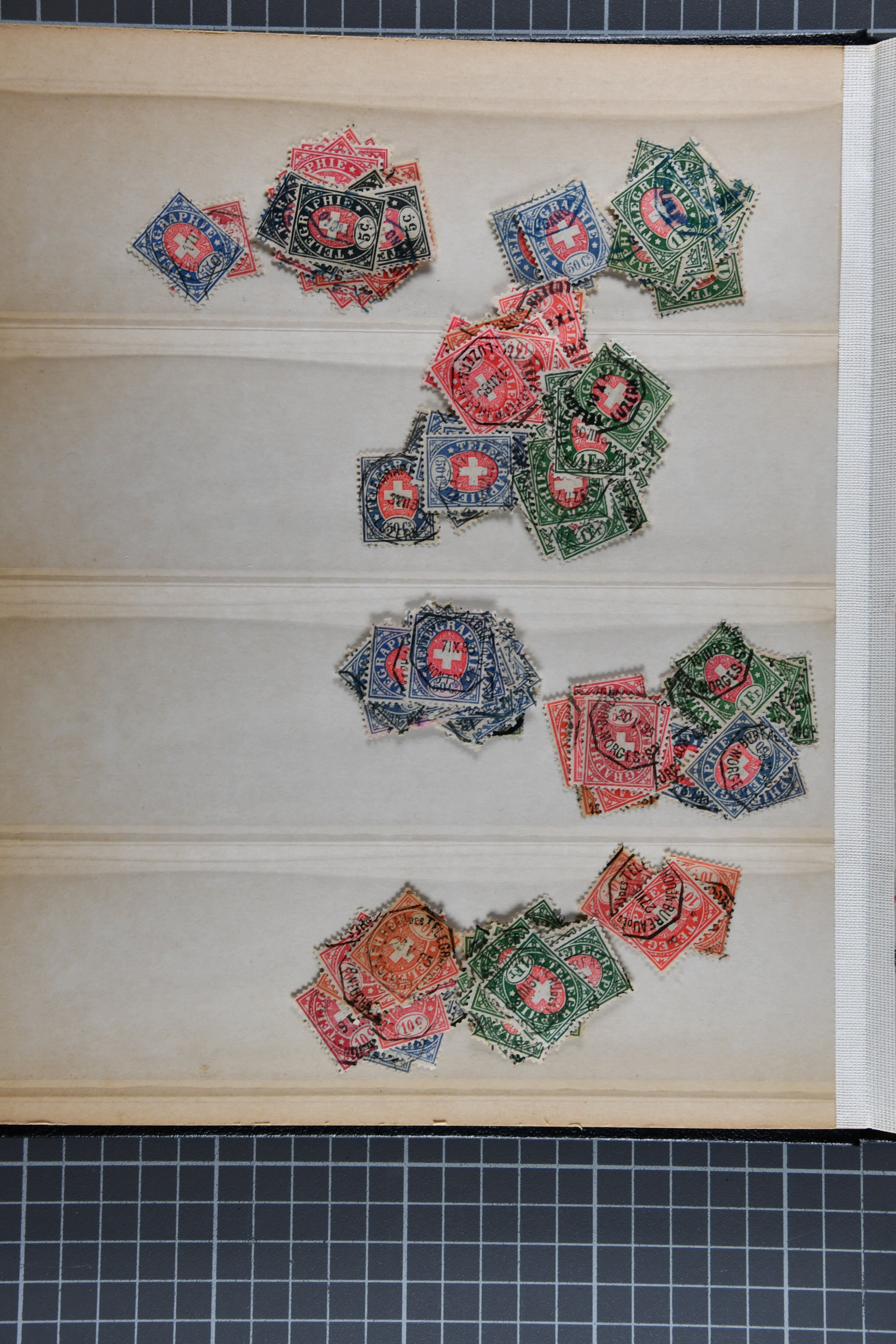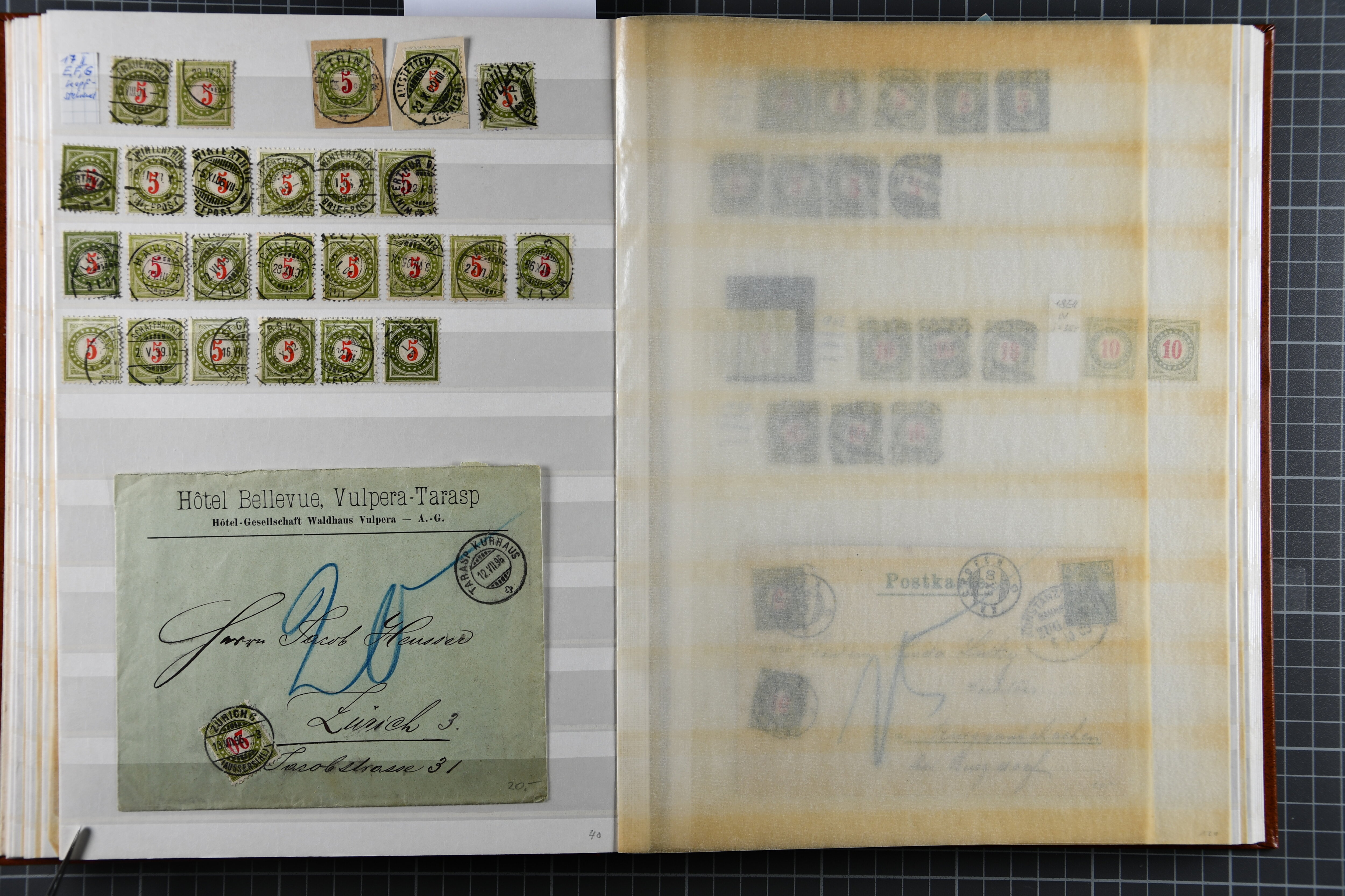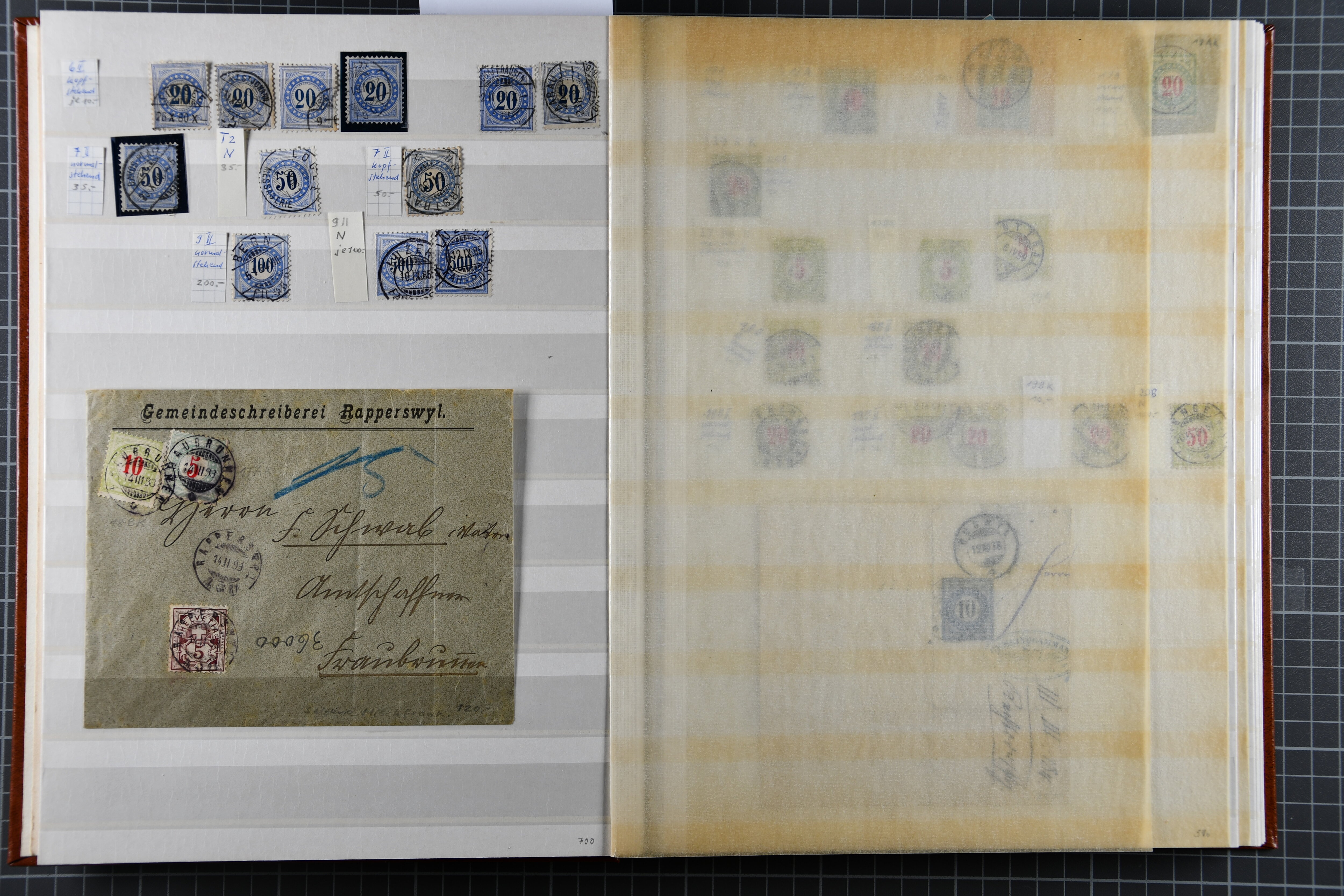 1878/1910: Einsteckbuch mit recht spezialsiert geordnetem Bestand gebraucht und ungebraucht mit Blocks Briefen, enthalten ein bisher ungelisteter Zwergstempel "THÖRIGEN" auf 10 Rp. blau. Geschätzter Katalogwert