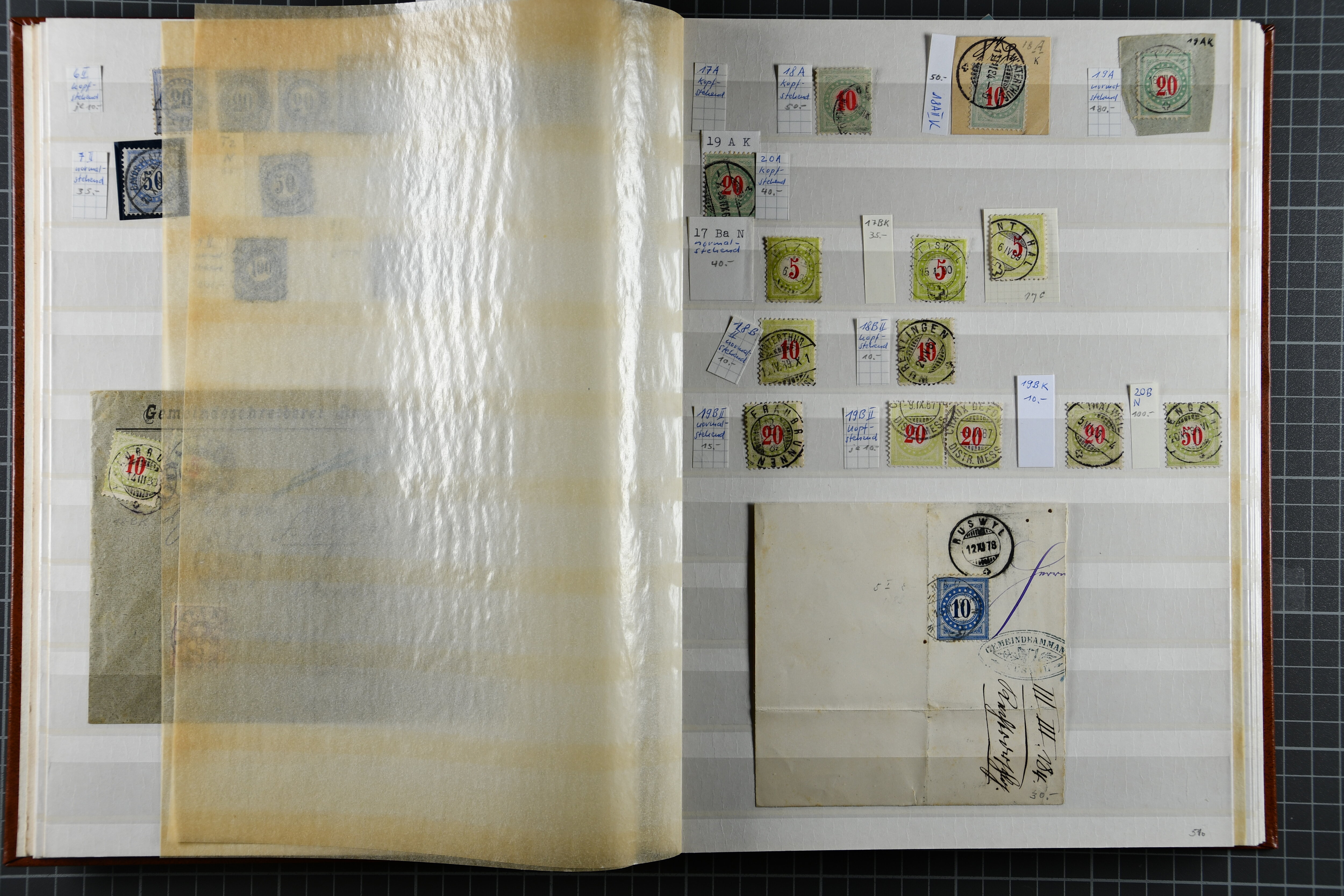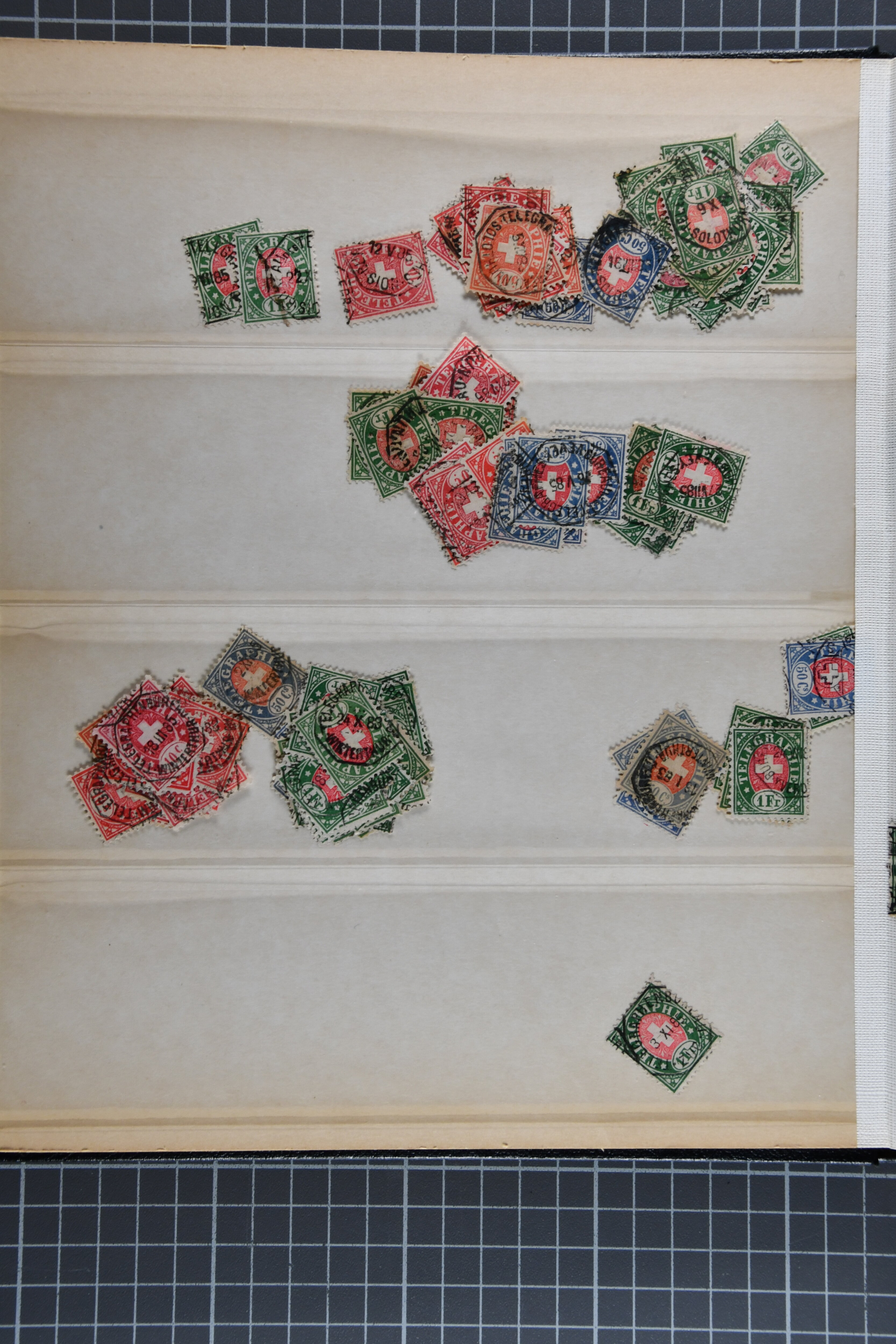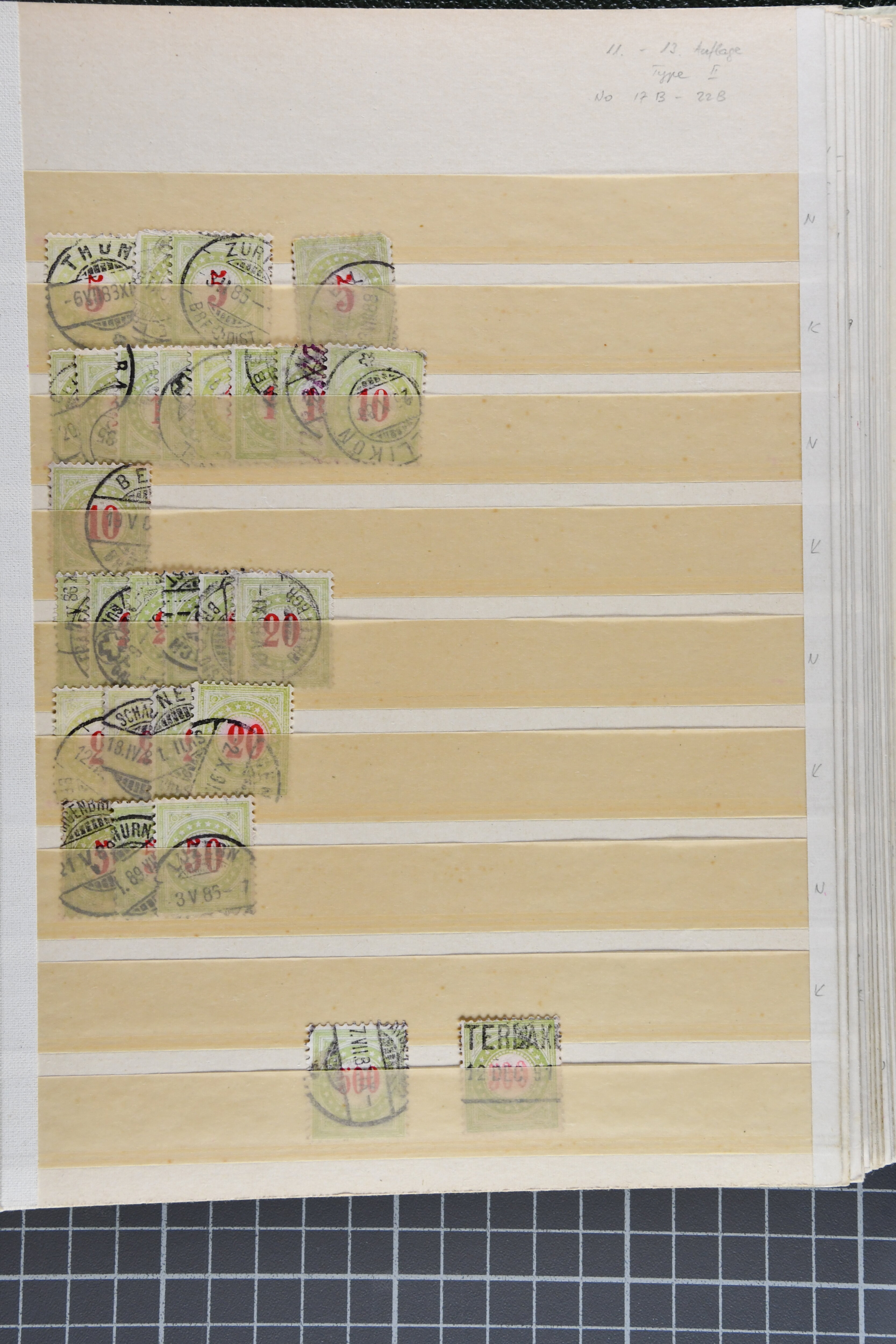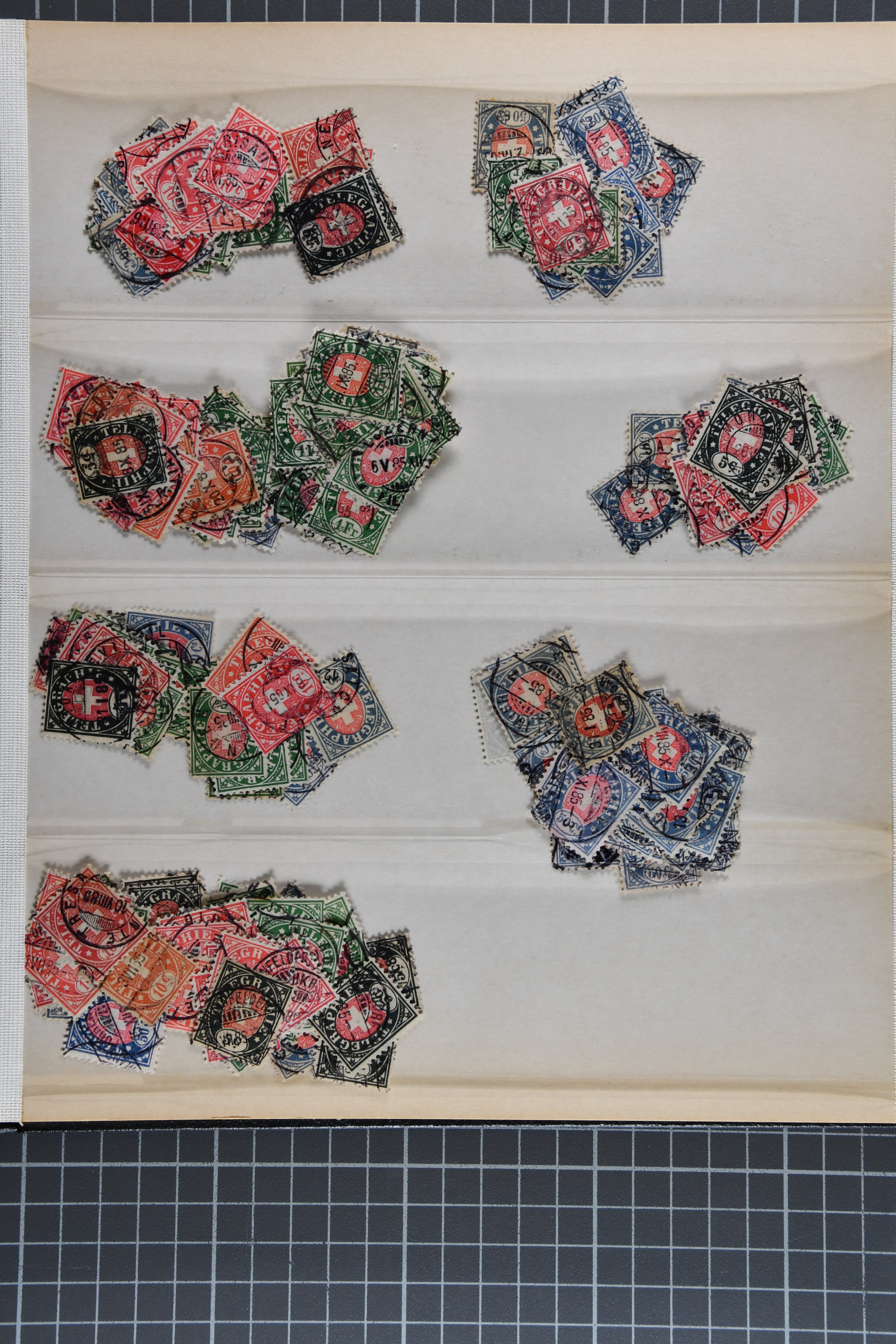 1878/1910: Einsteckbuch mit recht spezialsiert geordnetem Bestand gebraucht und ungebraucht mit Blocks Briefen, enthalten ein bisher ungelisteter Zwergstempel "THÖRIGEN" auf 10 Rp. blau. Geschätzter Katalogwert