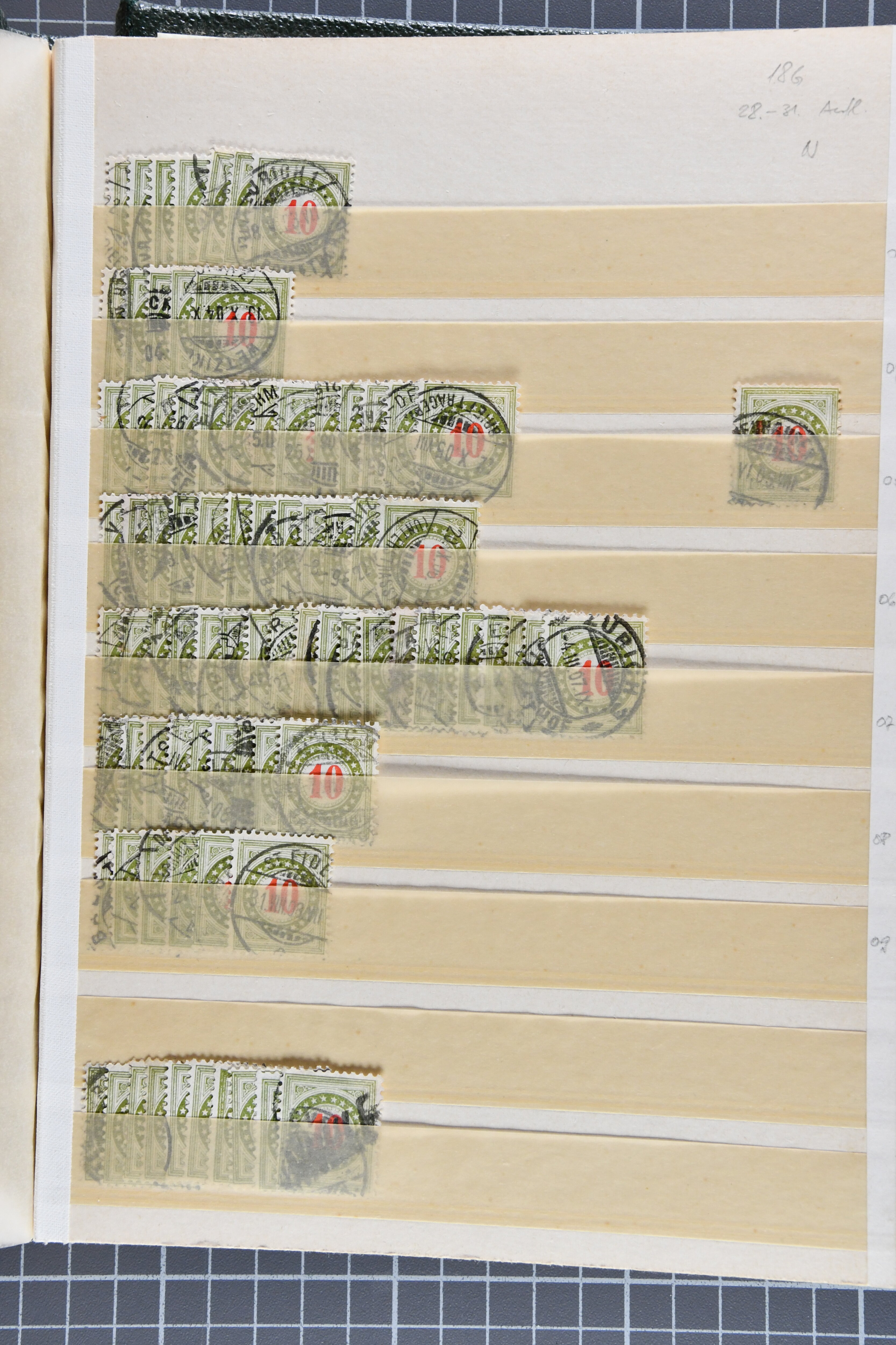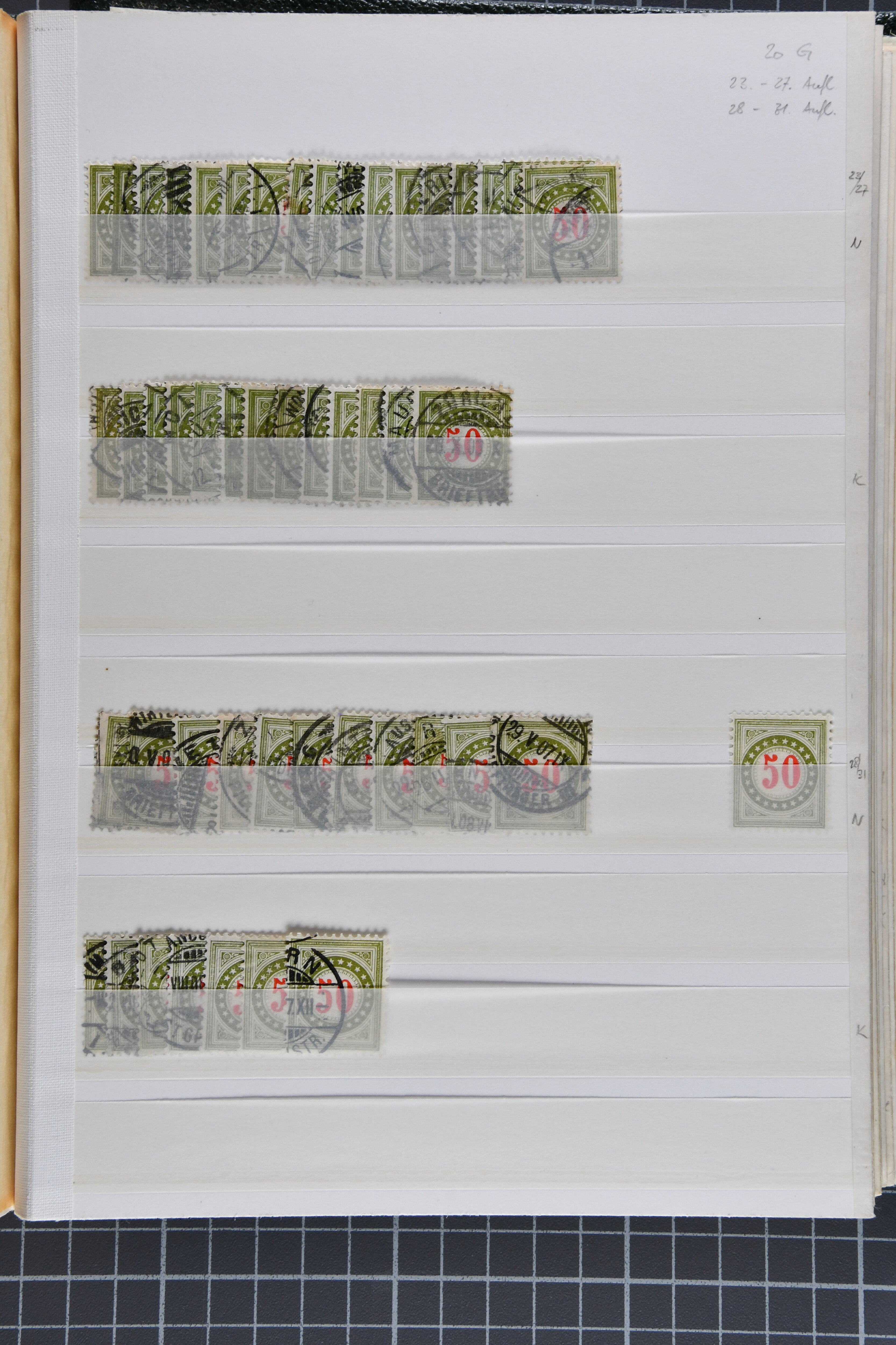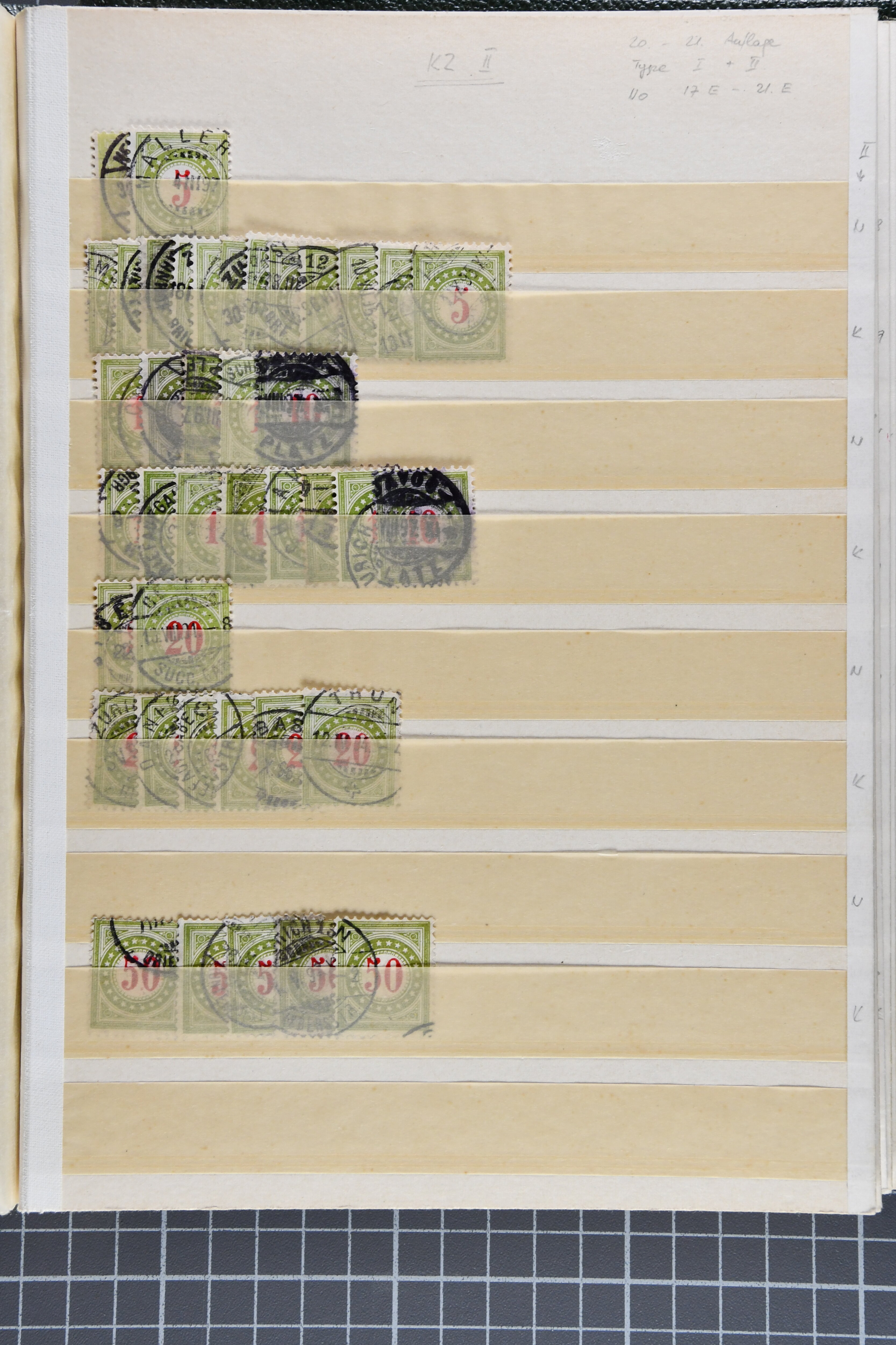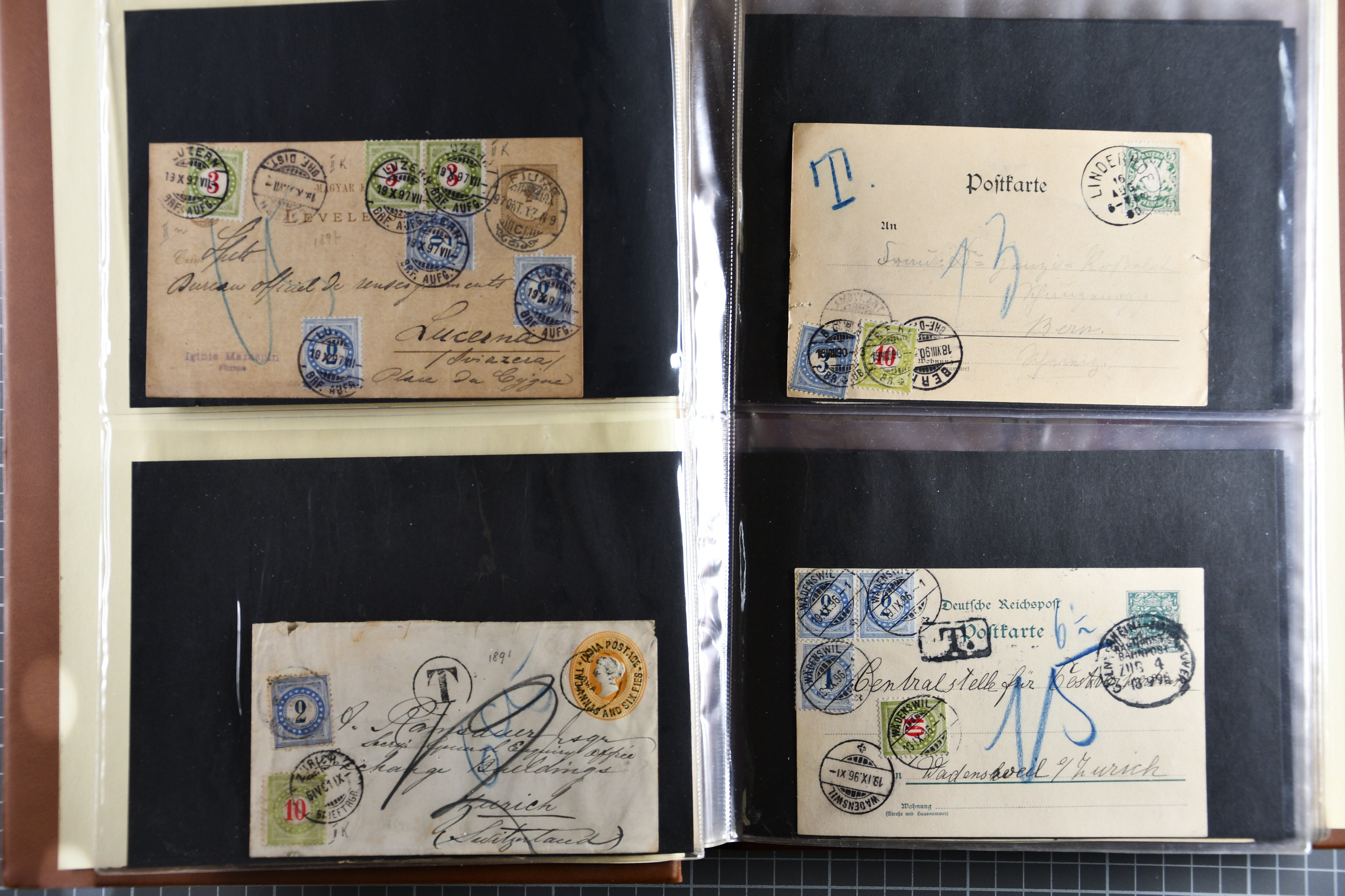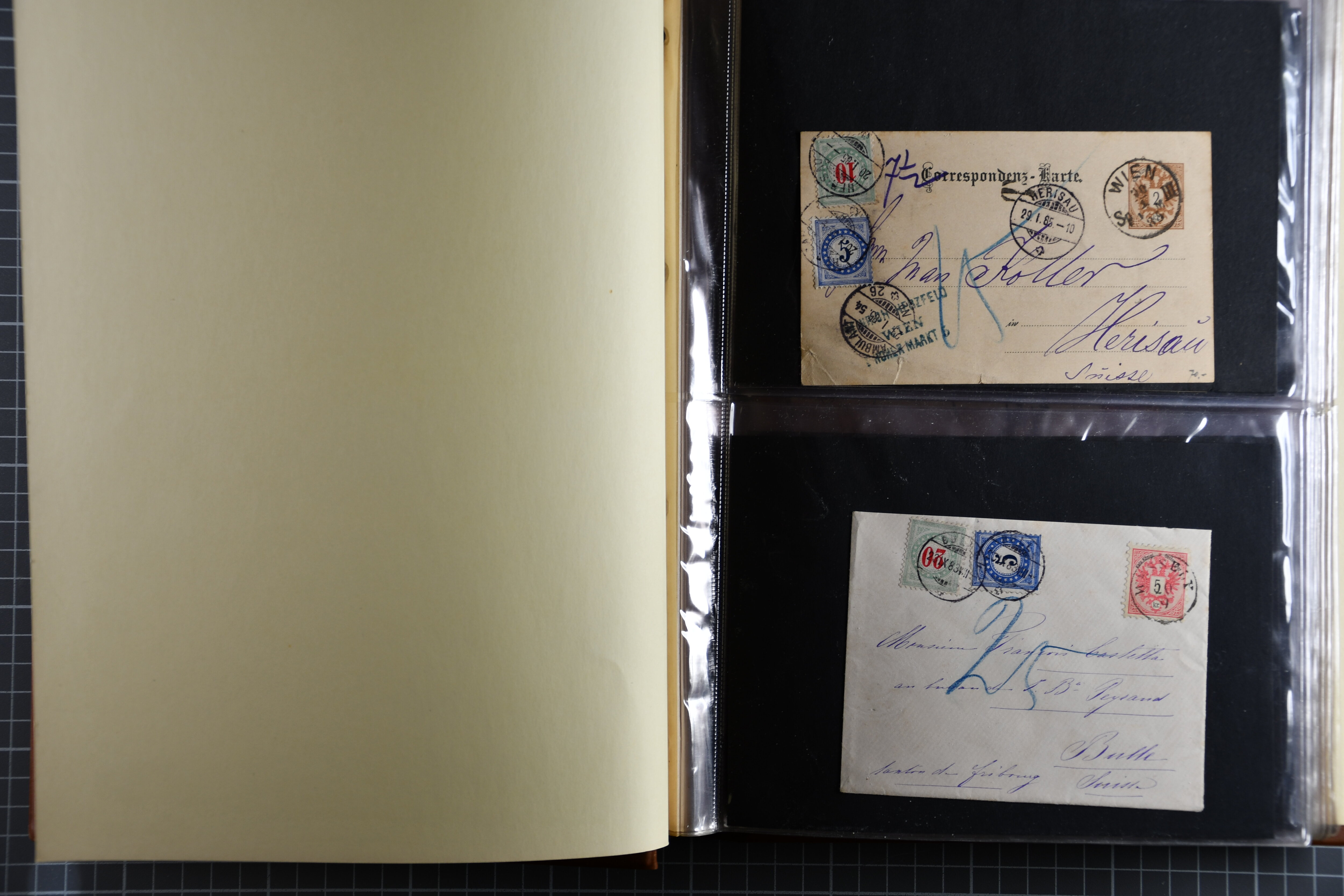1883/34: ca. 60 Partie Nachportobelege ab der blauen Zifferausgabe auf Beleg, untergebracht in einem Briefalbum. Enthalten sind neun Mischfrankaturen blau/grün sowie bei den späteren Ausgaben einige interessante