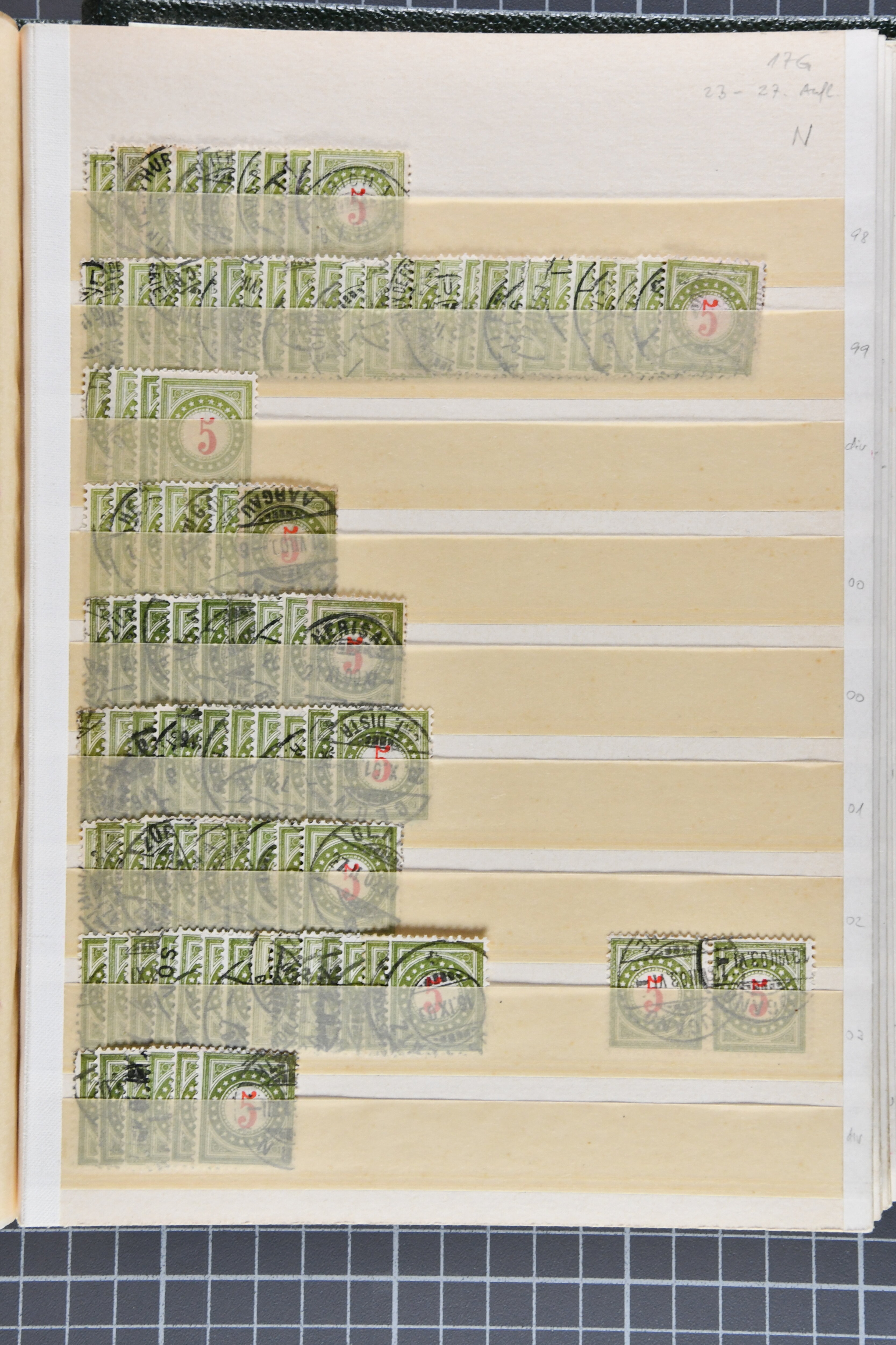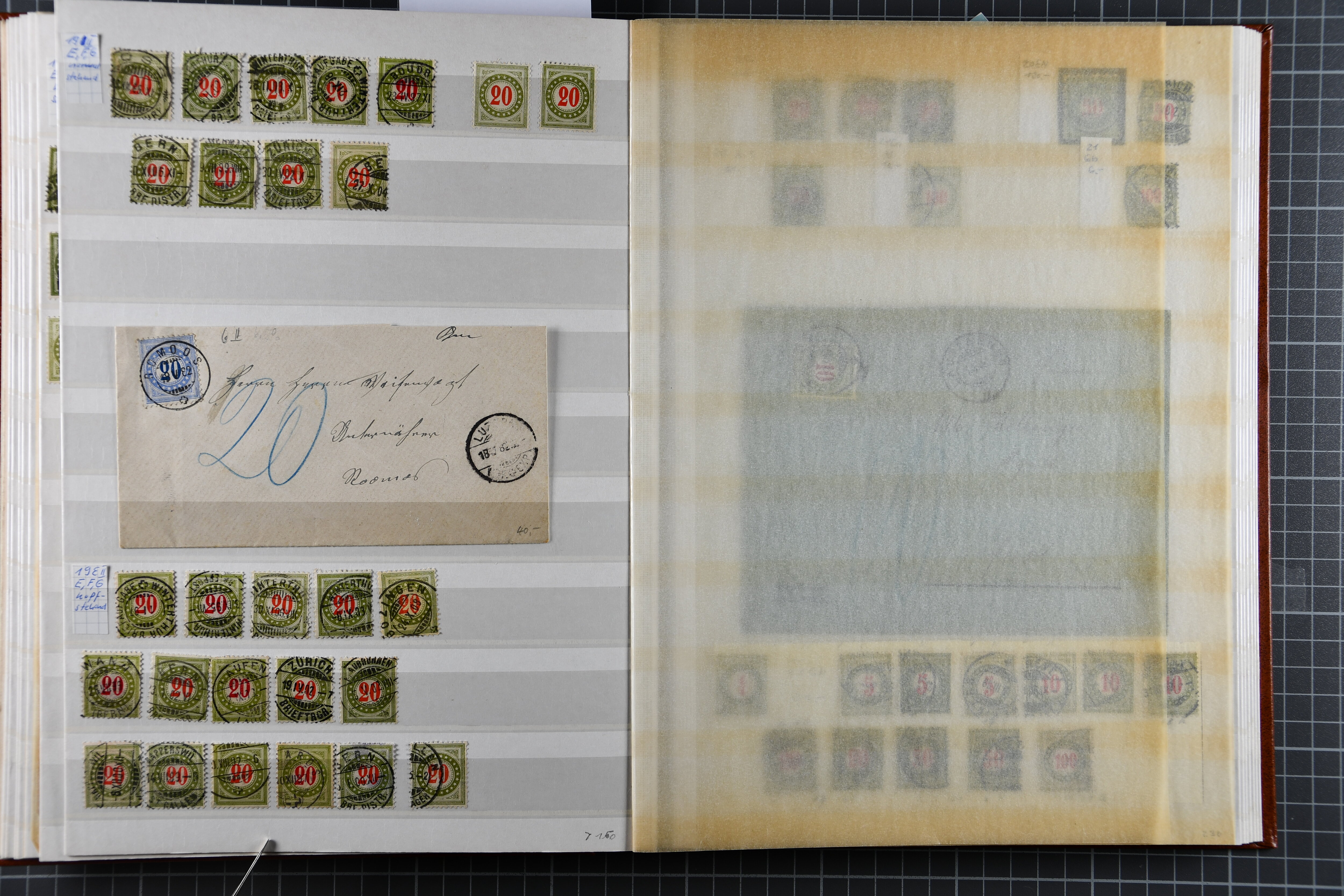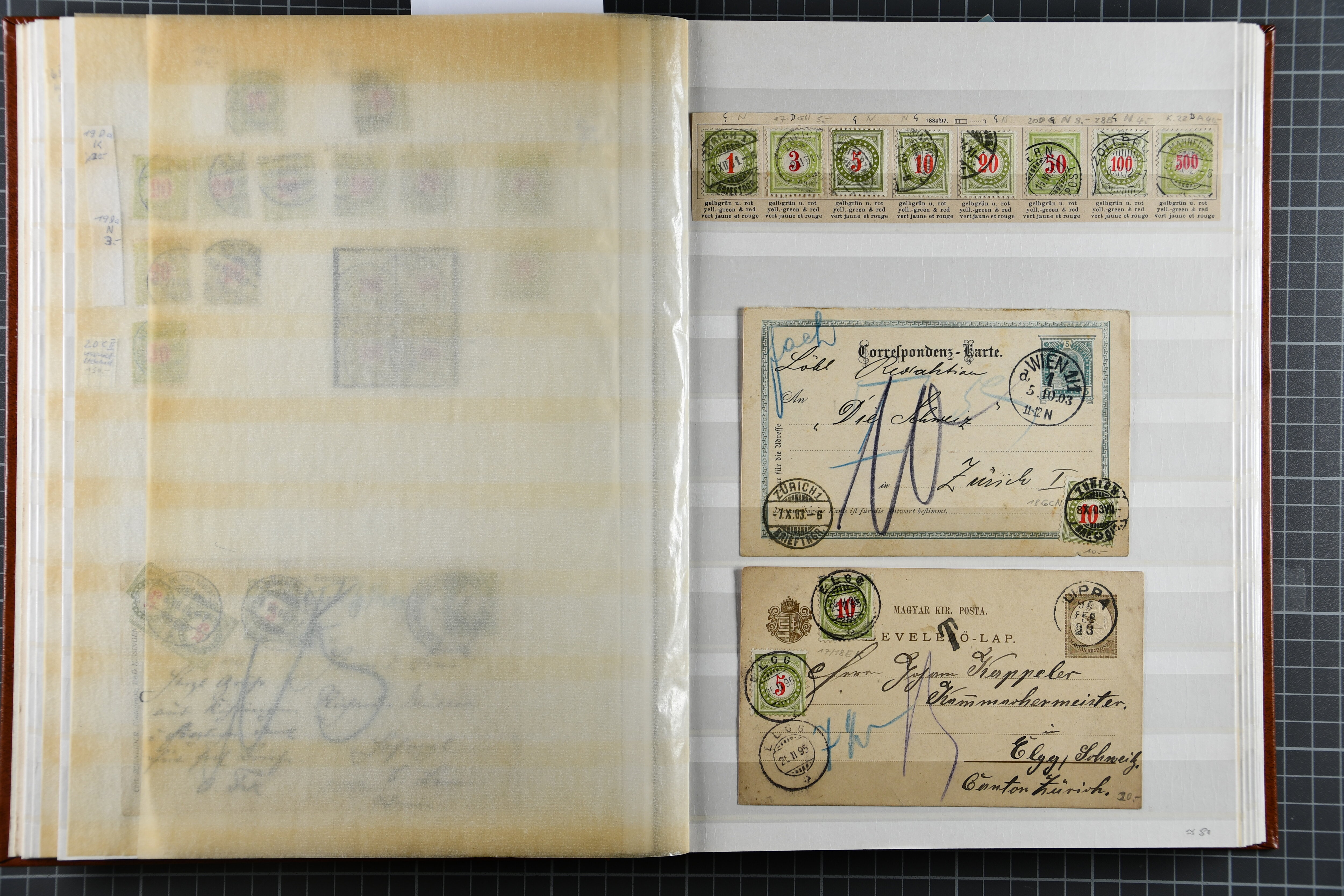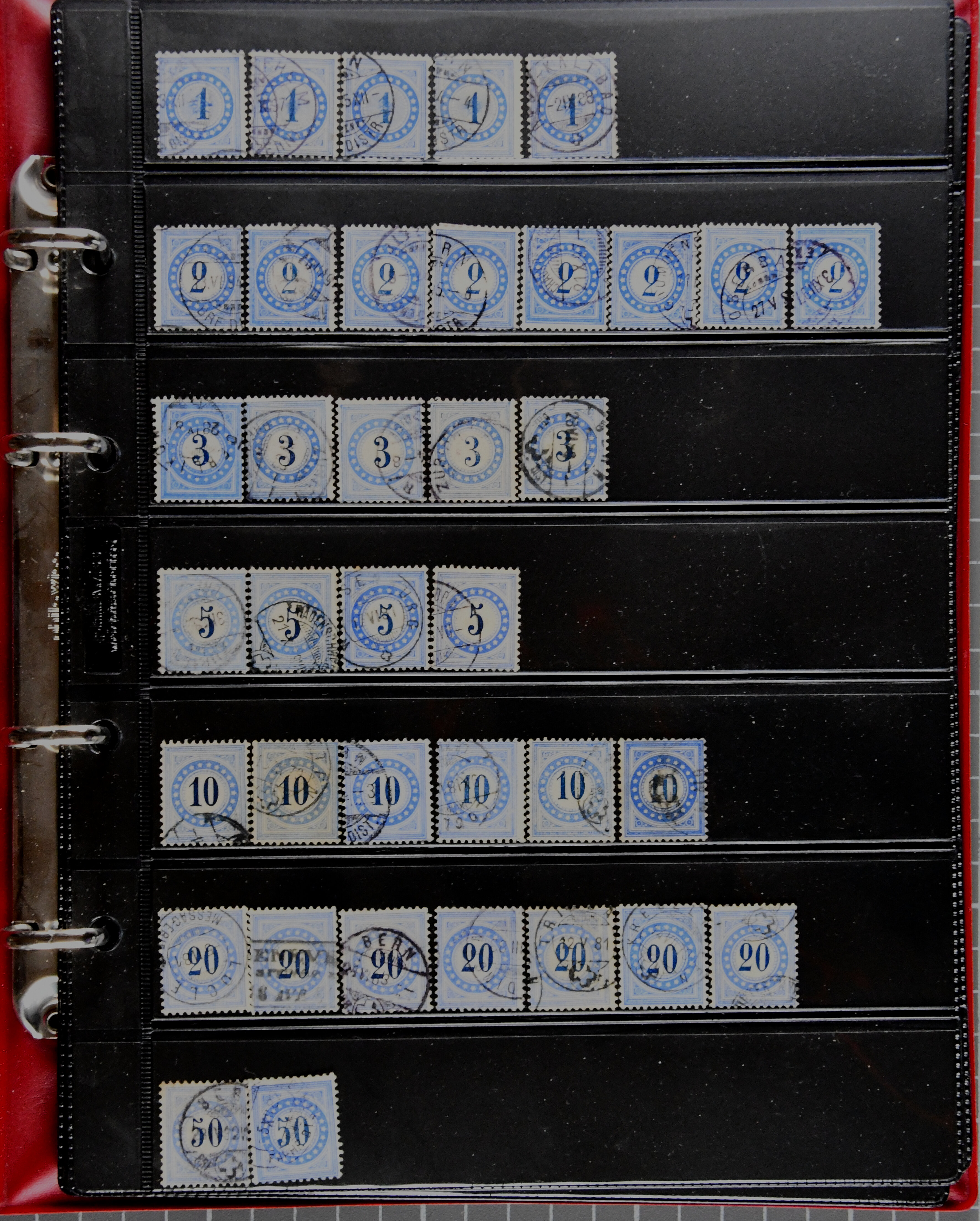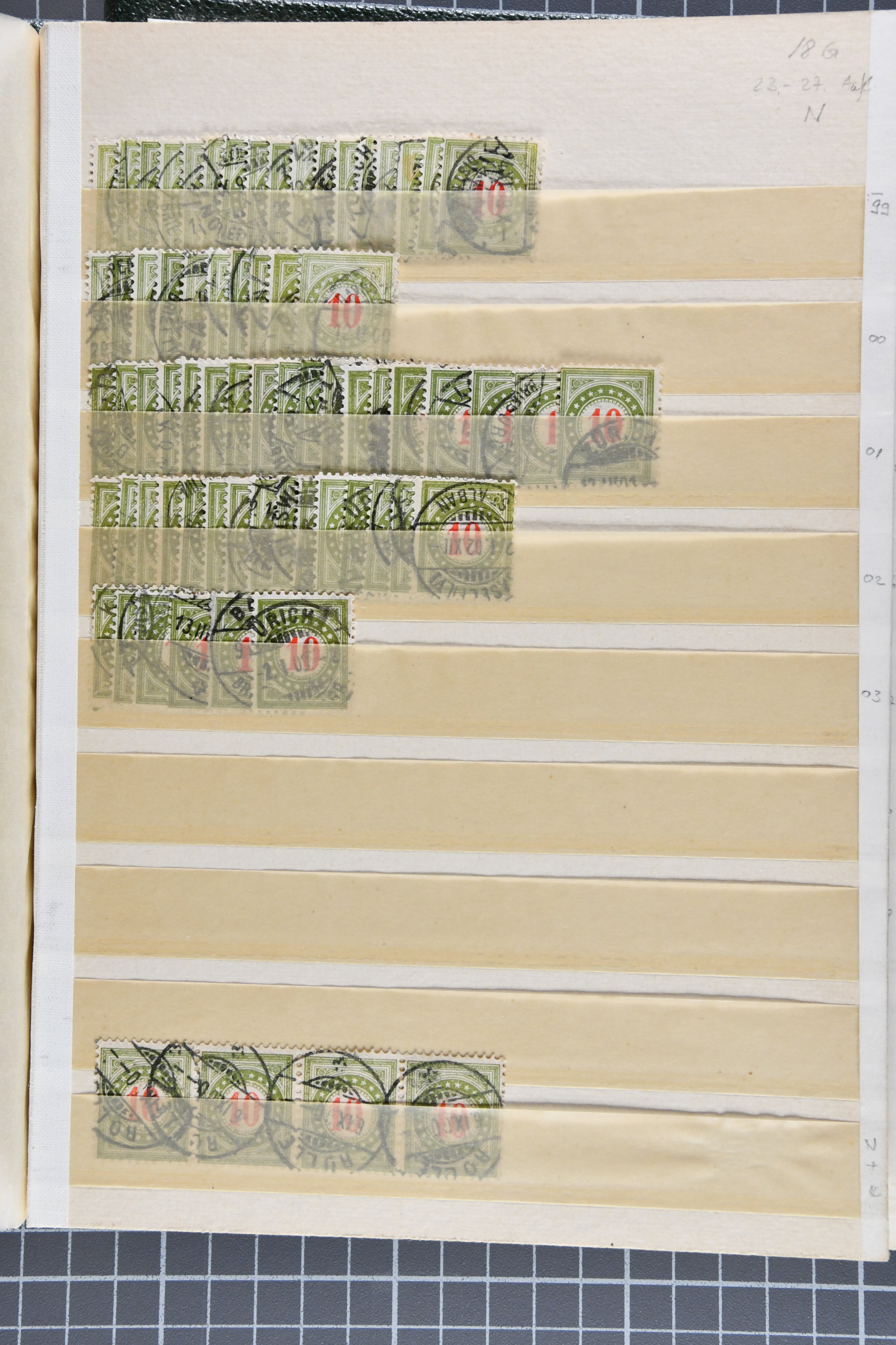 1883/34: ca. 60 Partie Nachportobelege ab der blauen Zifferausgabe auf Beleg, untergebracht in einem Briefalbum. Enthalten sind neun Mischfrankaturen blau/grün sowie bei den späteren Ausgaben einige interessante