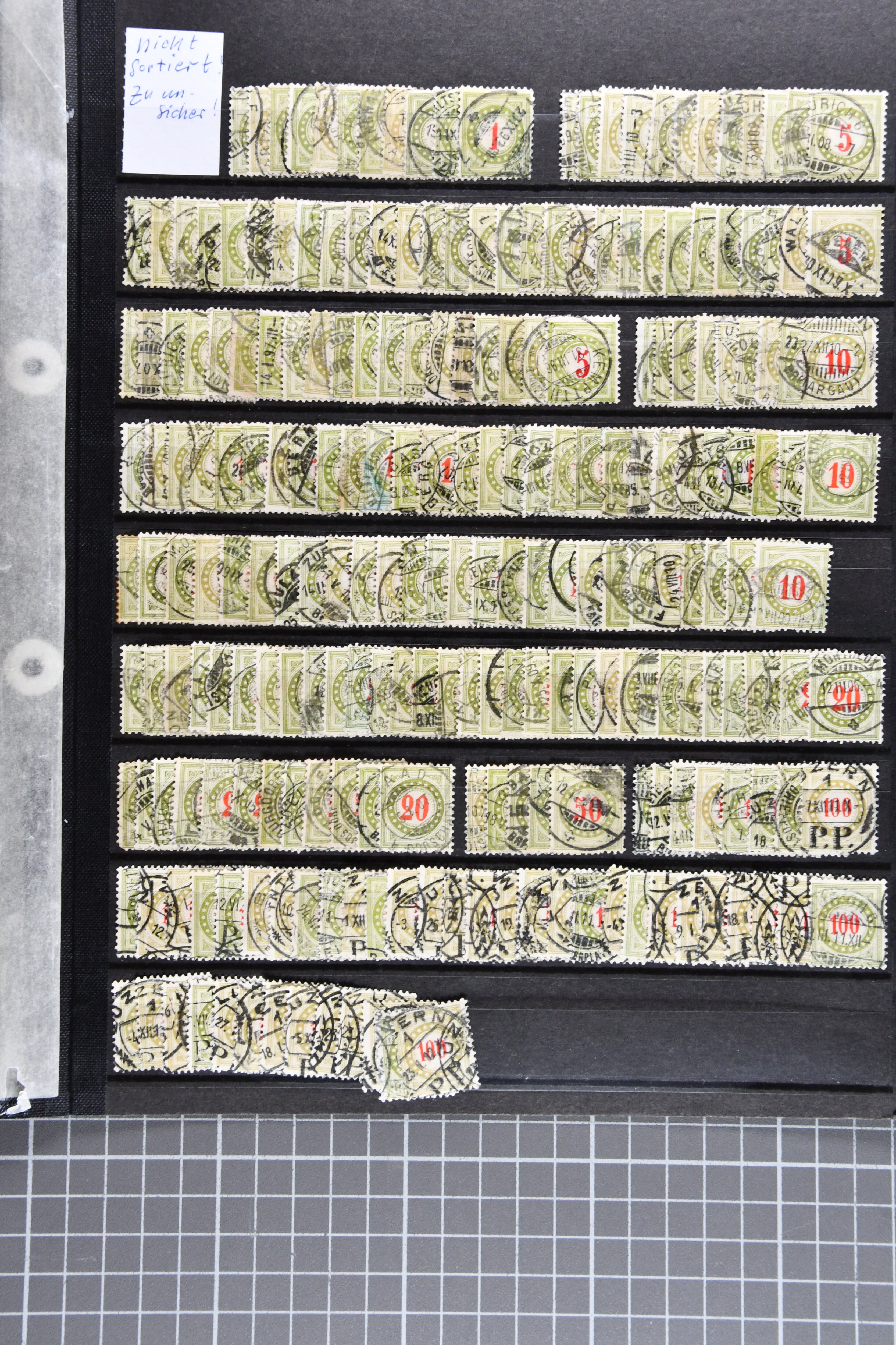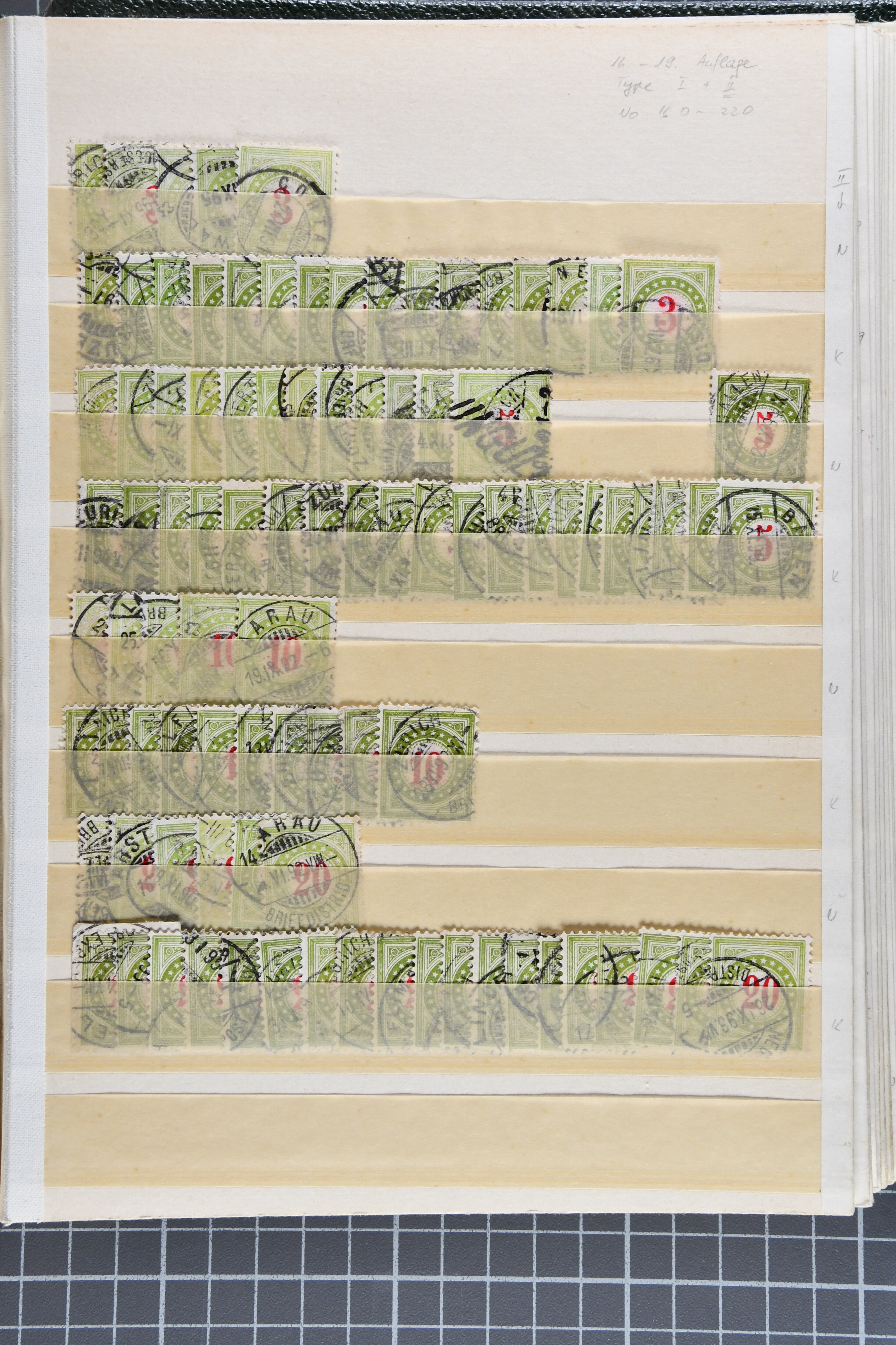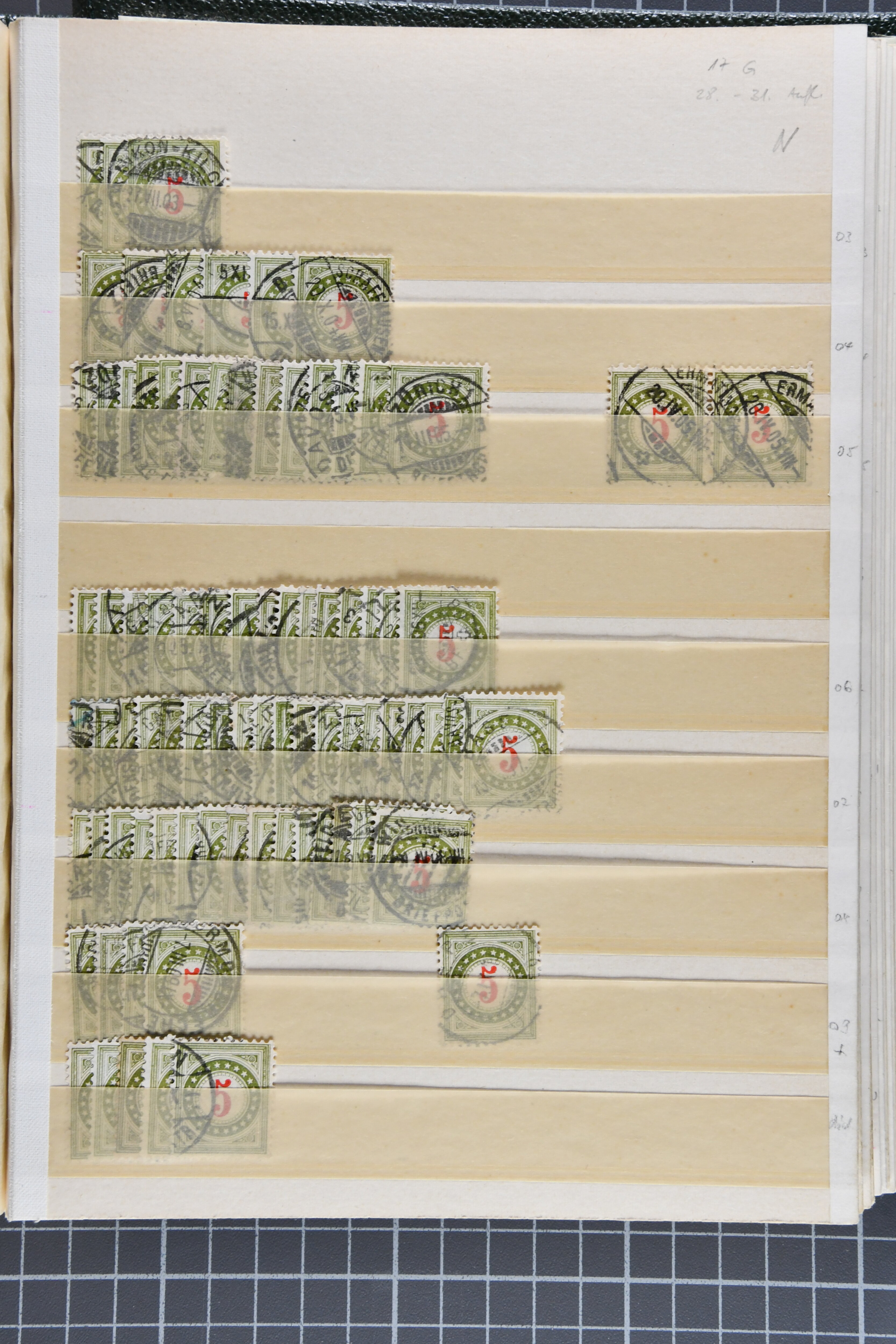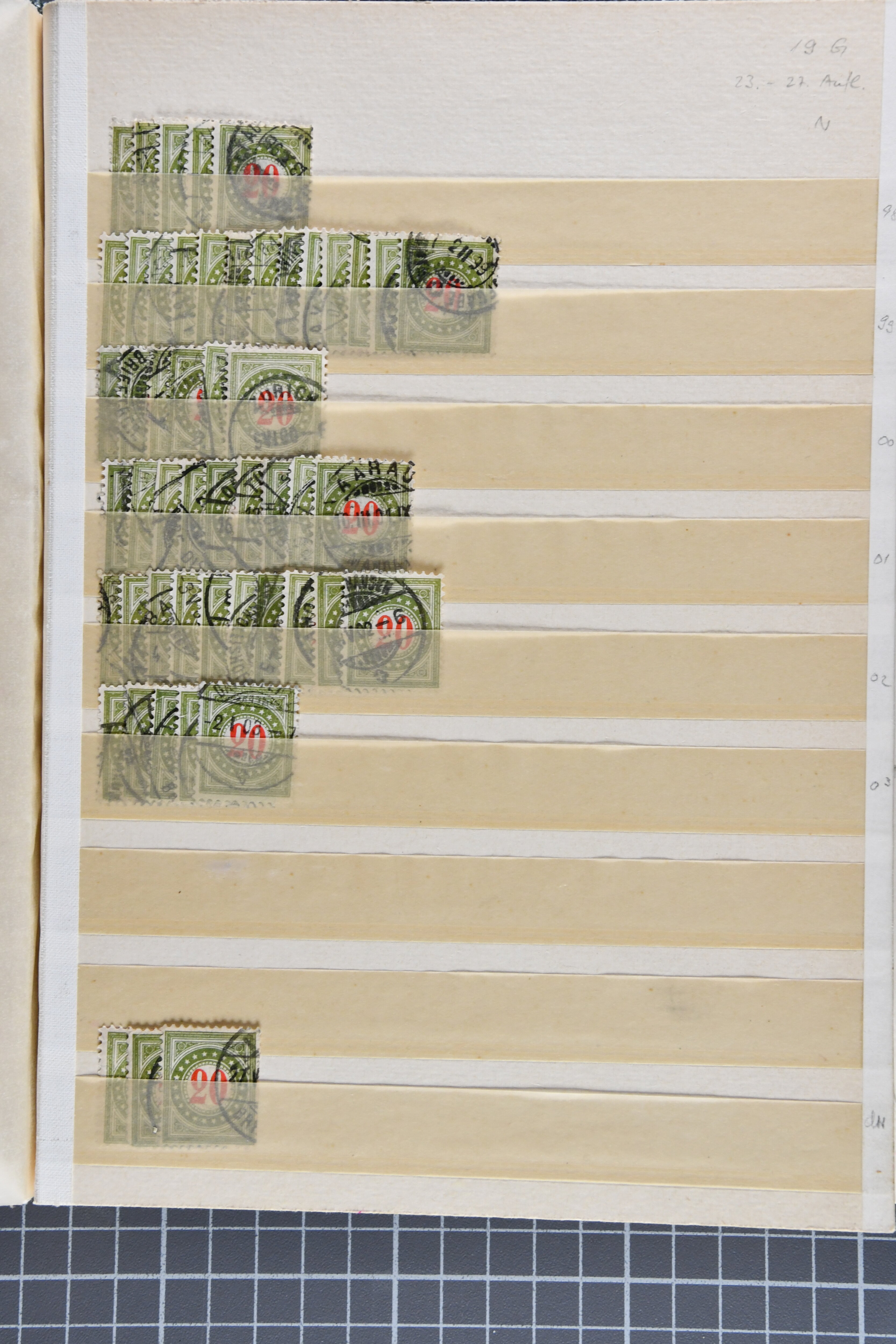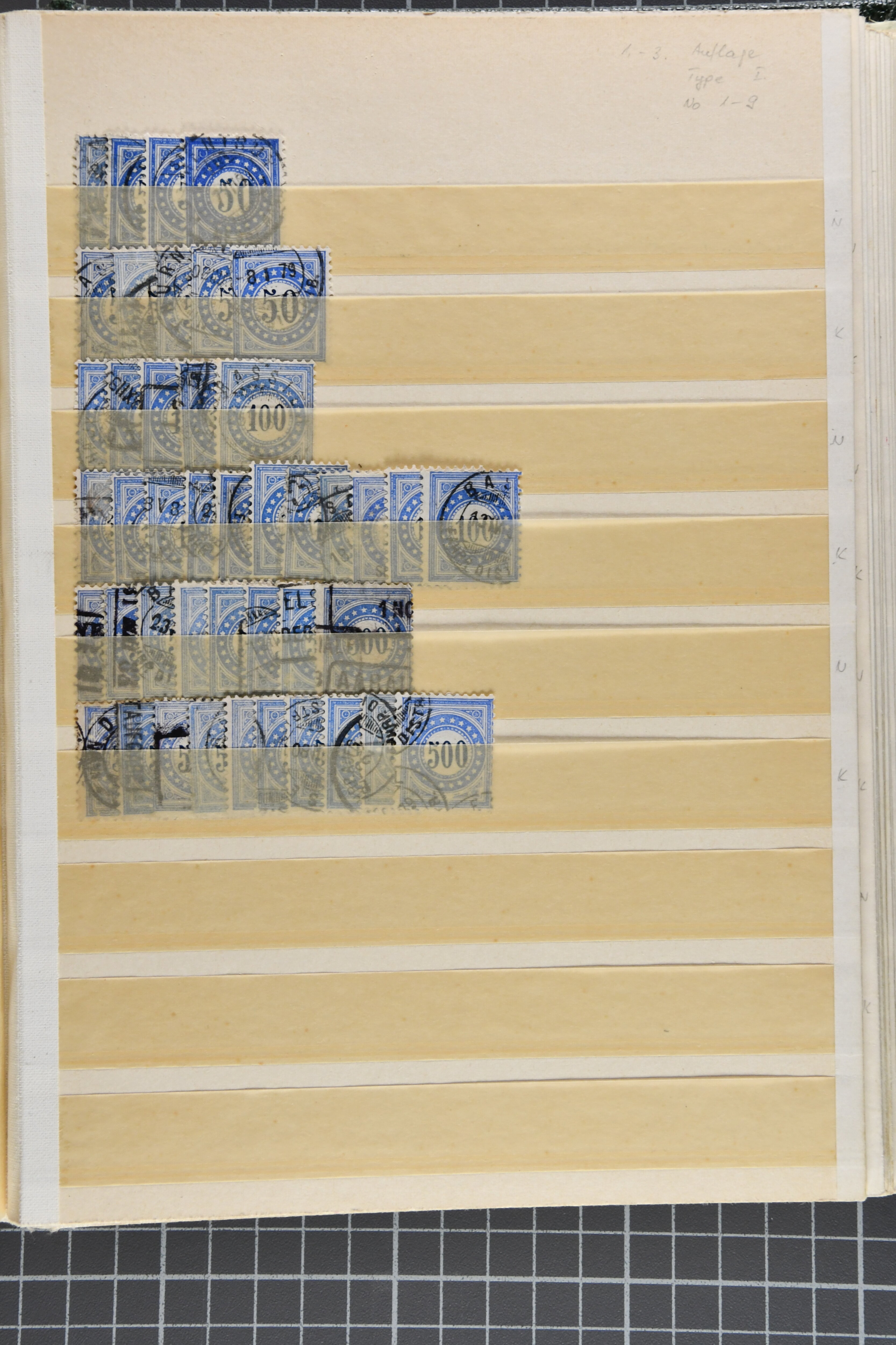 1883/34: ca. 60 Partie Nachportobelege ab der blauen Zifferausgabe auf Beleg, untergebracht in einem Briefalbum. Enthalten sind neun Mischfrankaturen blau/grün sowie bei den späteren Ausgaben einige interessante