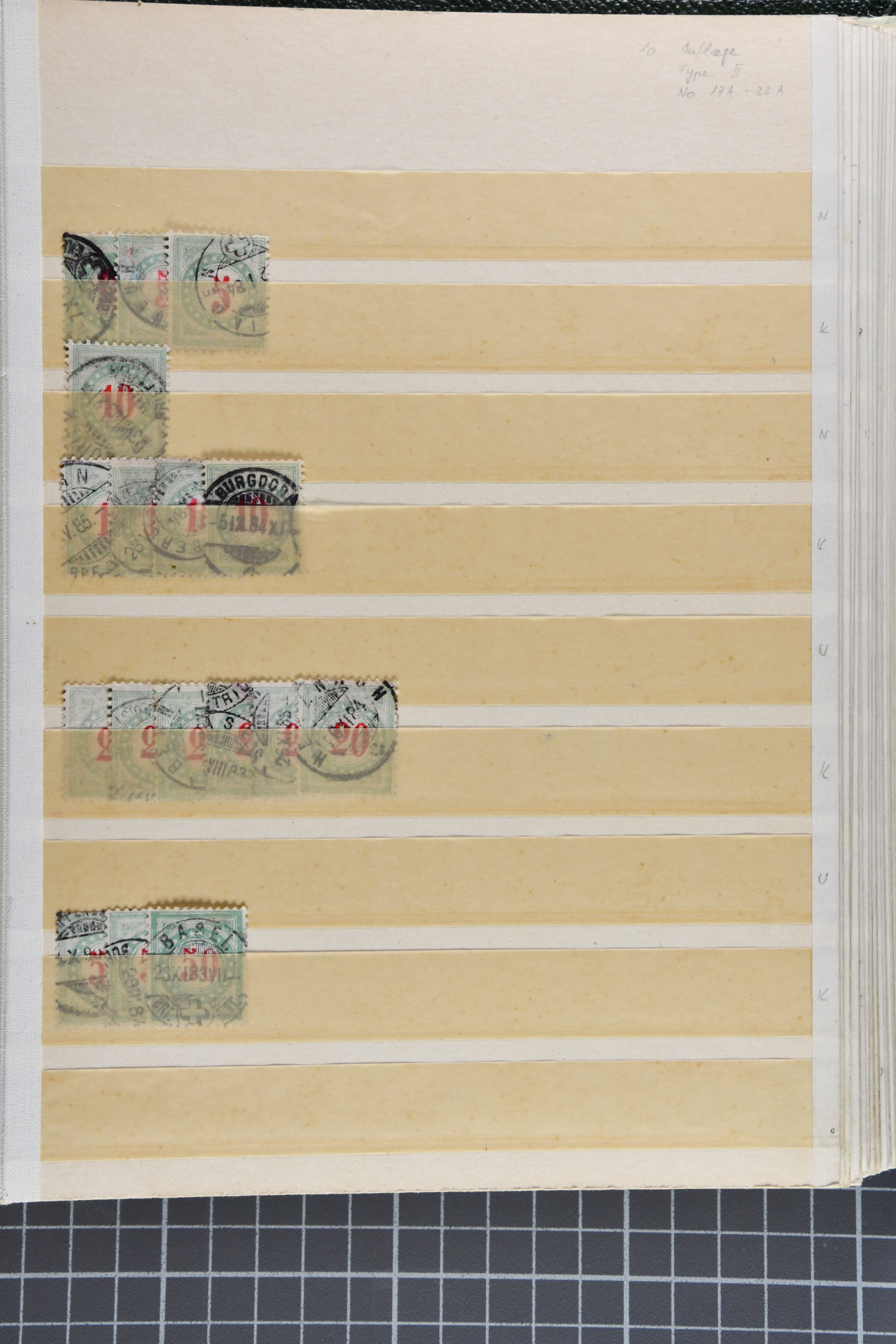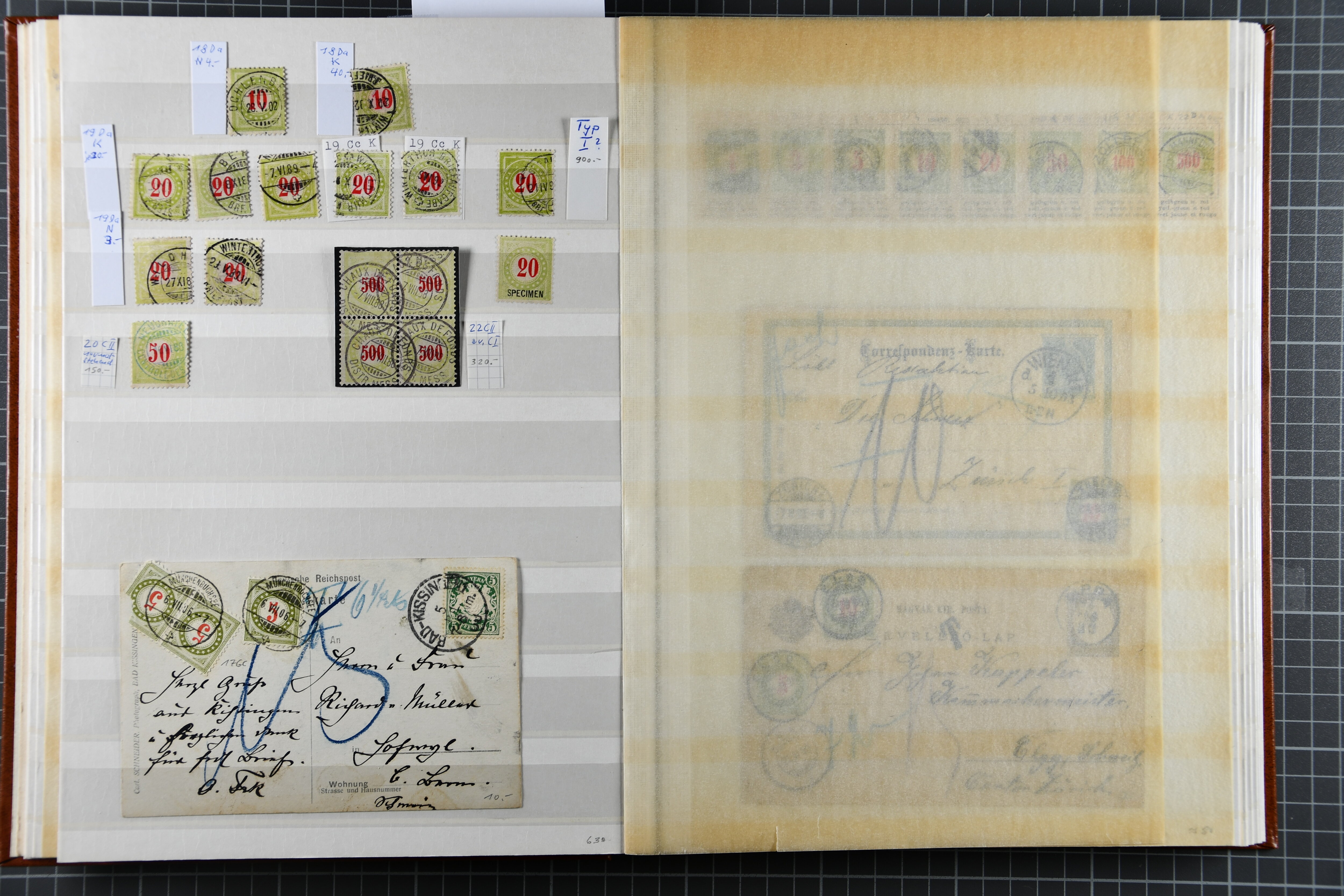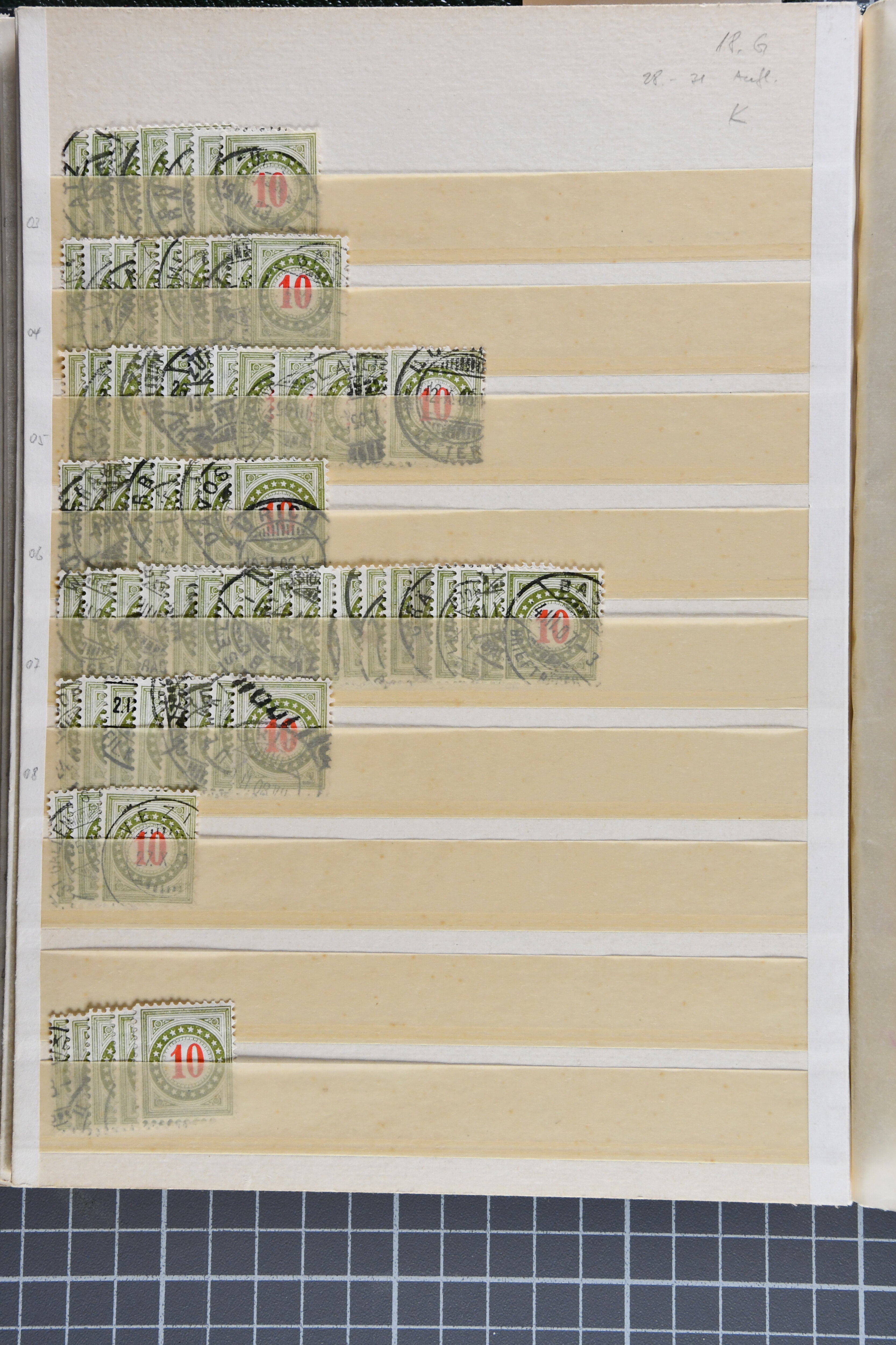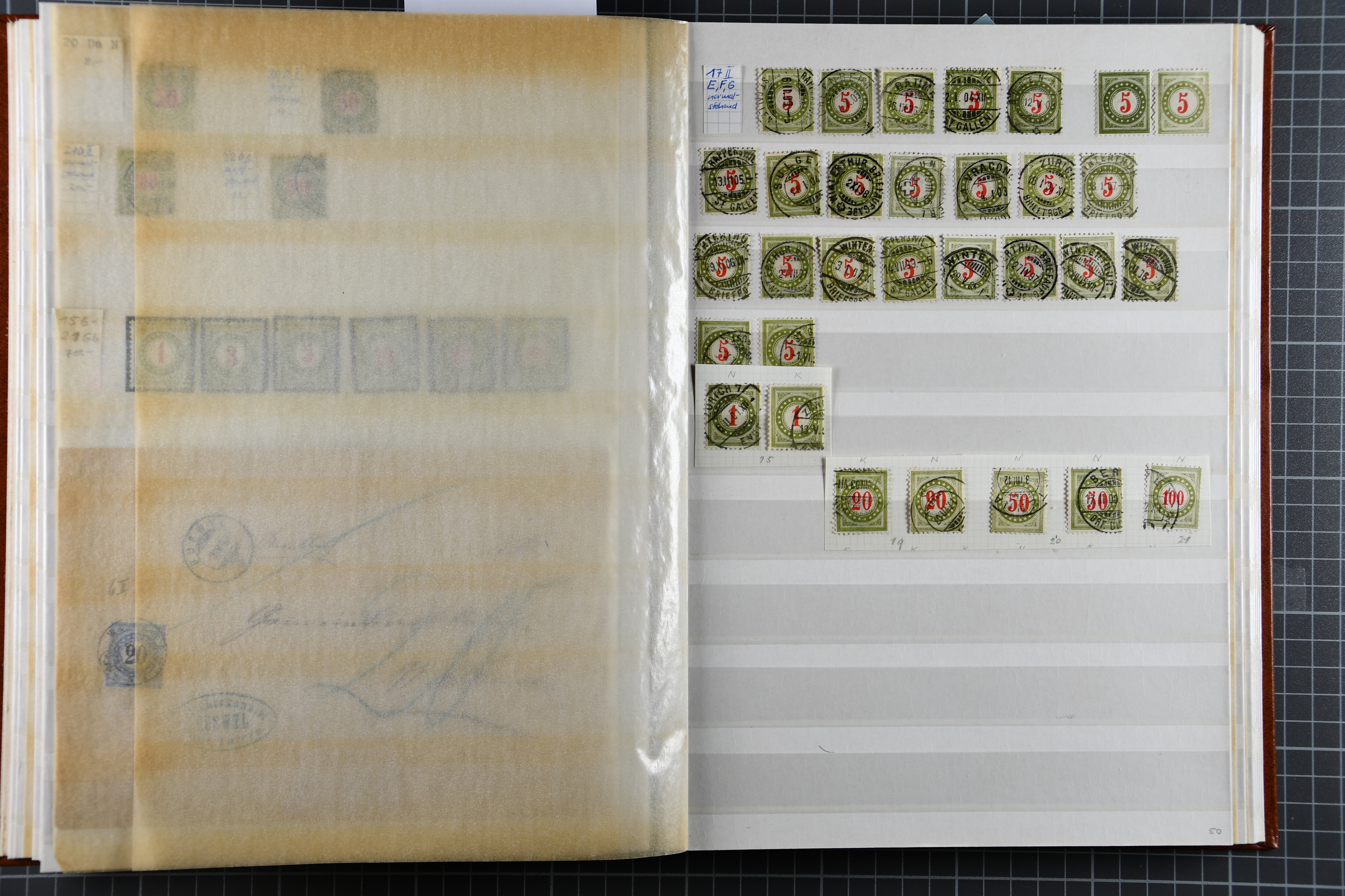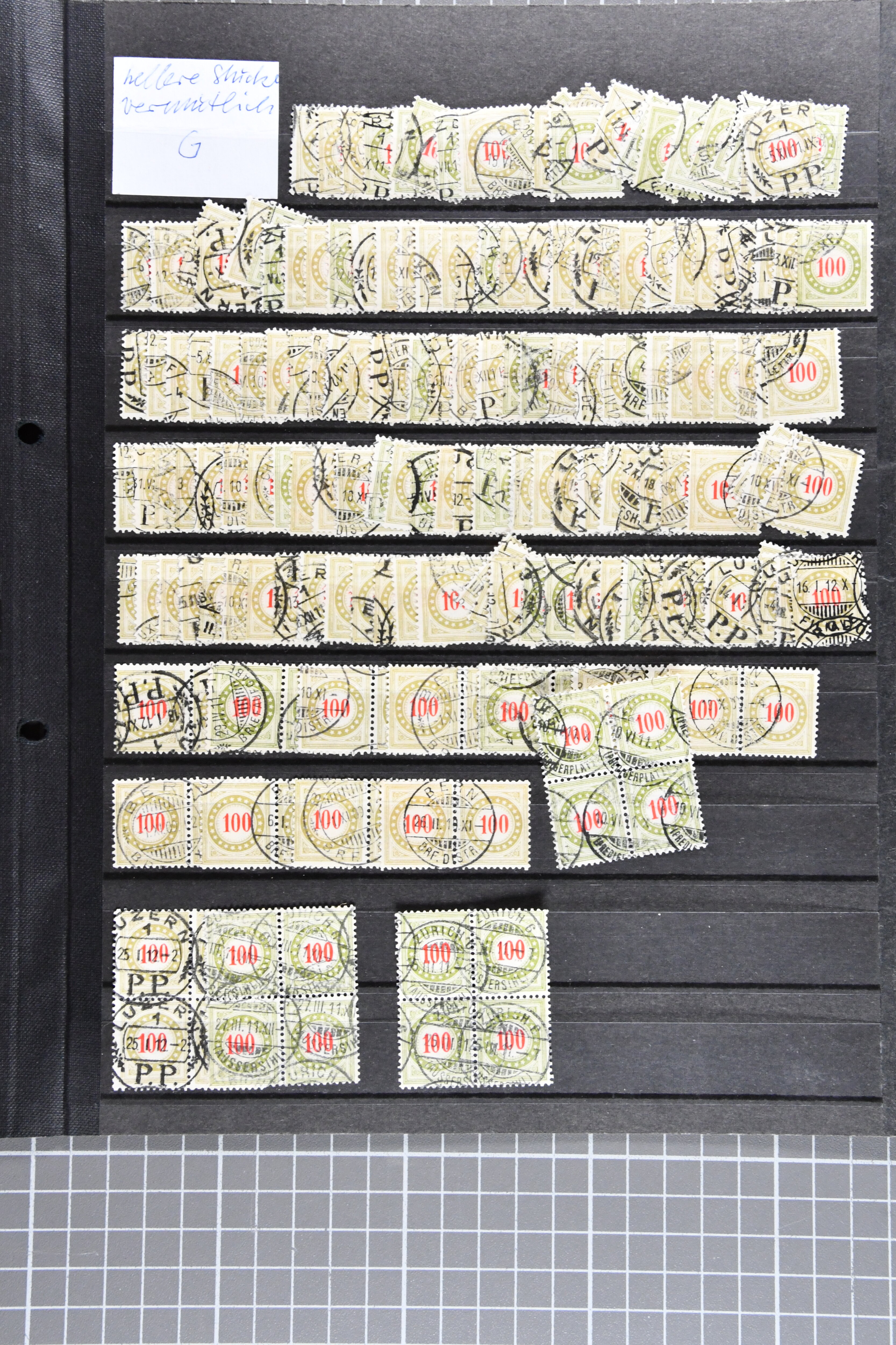 1883/34: ca. 60 Partie Nachportobelege ab der blauen Zifferausgabe auf Beleg, untergebracht in einem Briefalbum. Enthalten sind neun Mischfrankaturen blau/grün sowie bei den späteren Ausgaben einige interessante