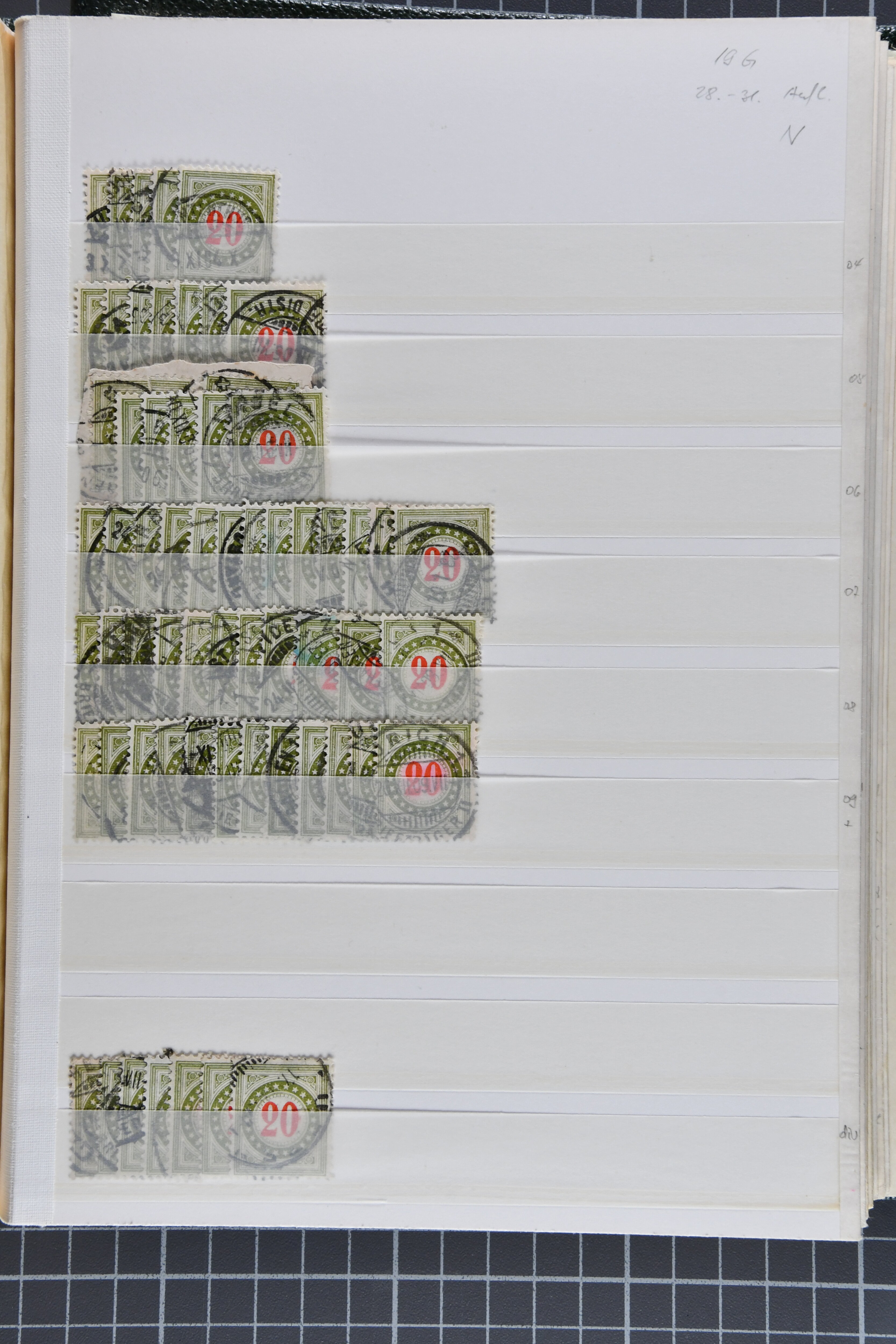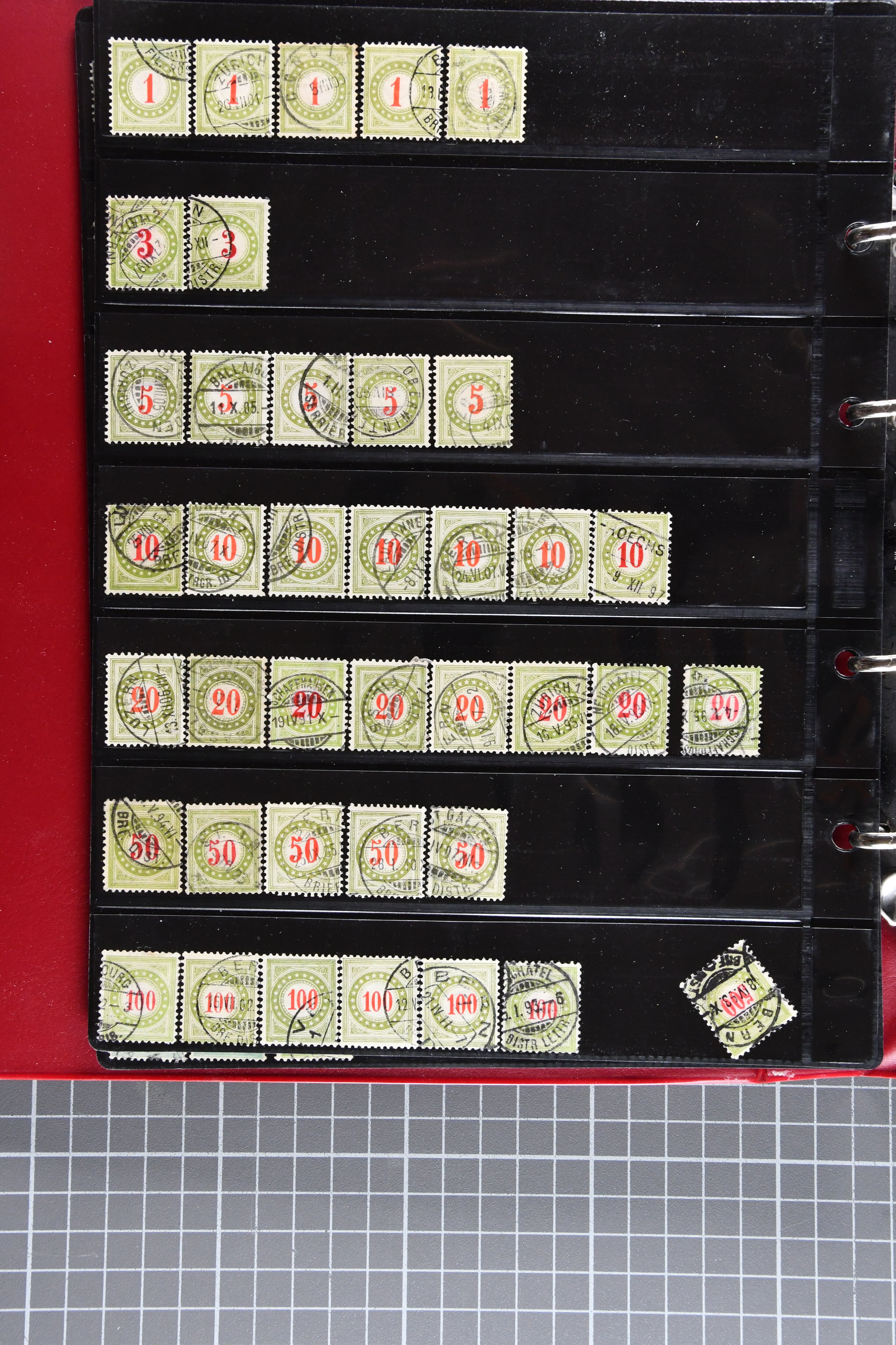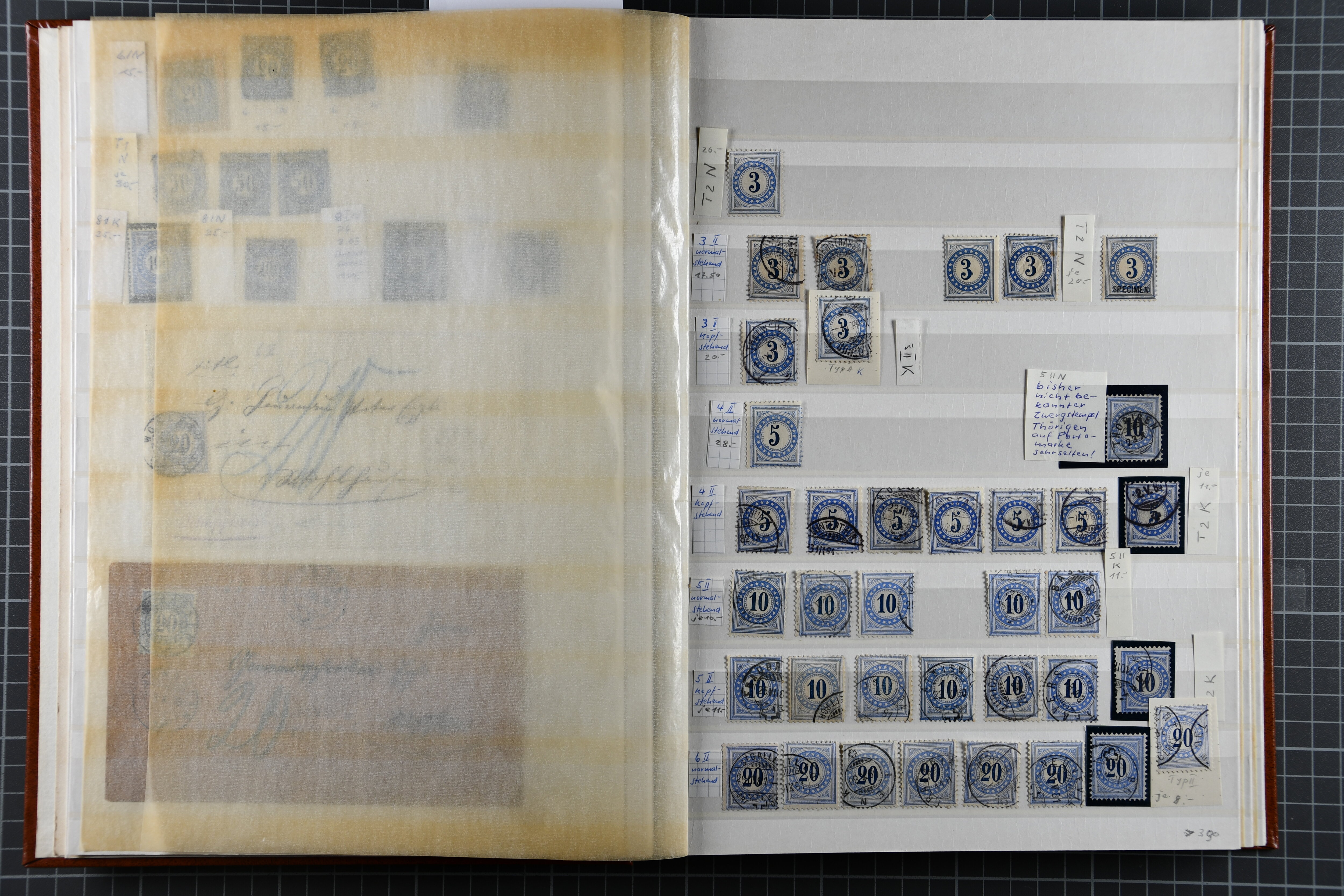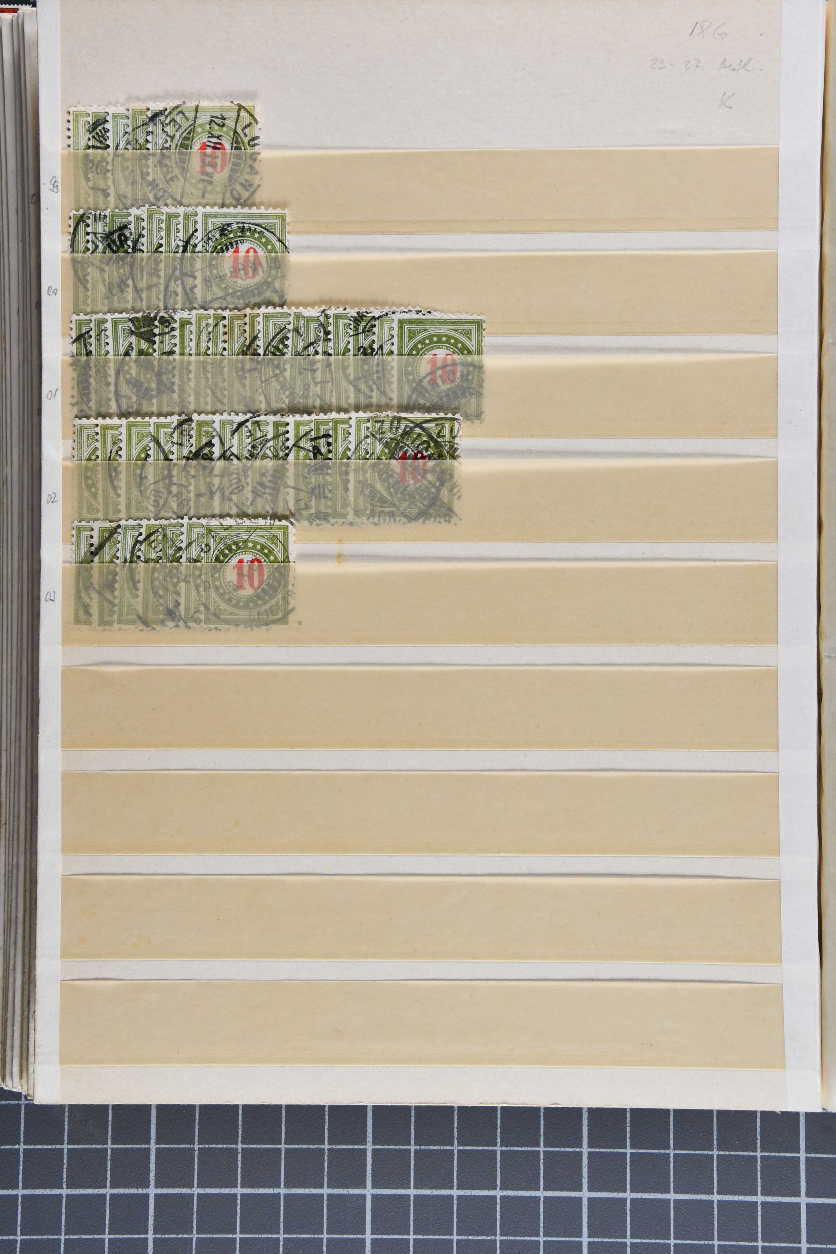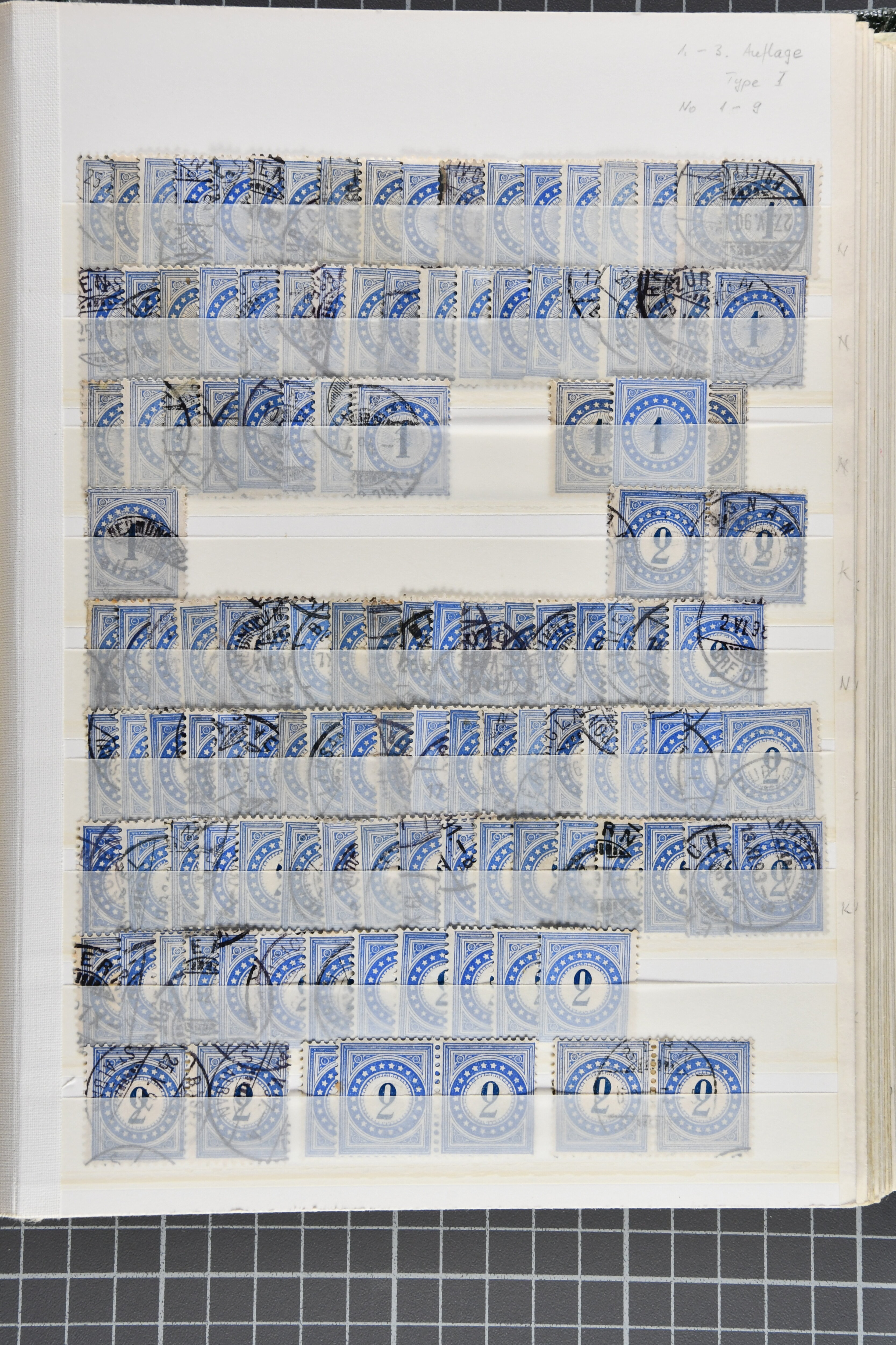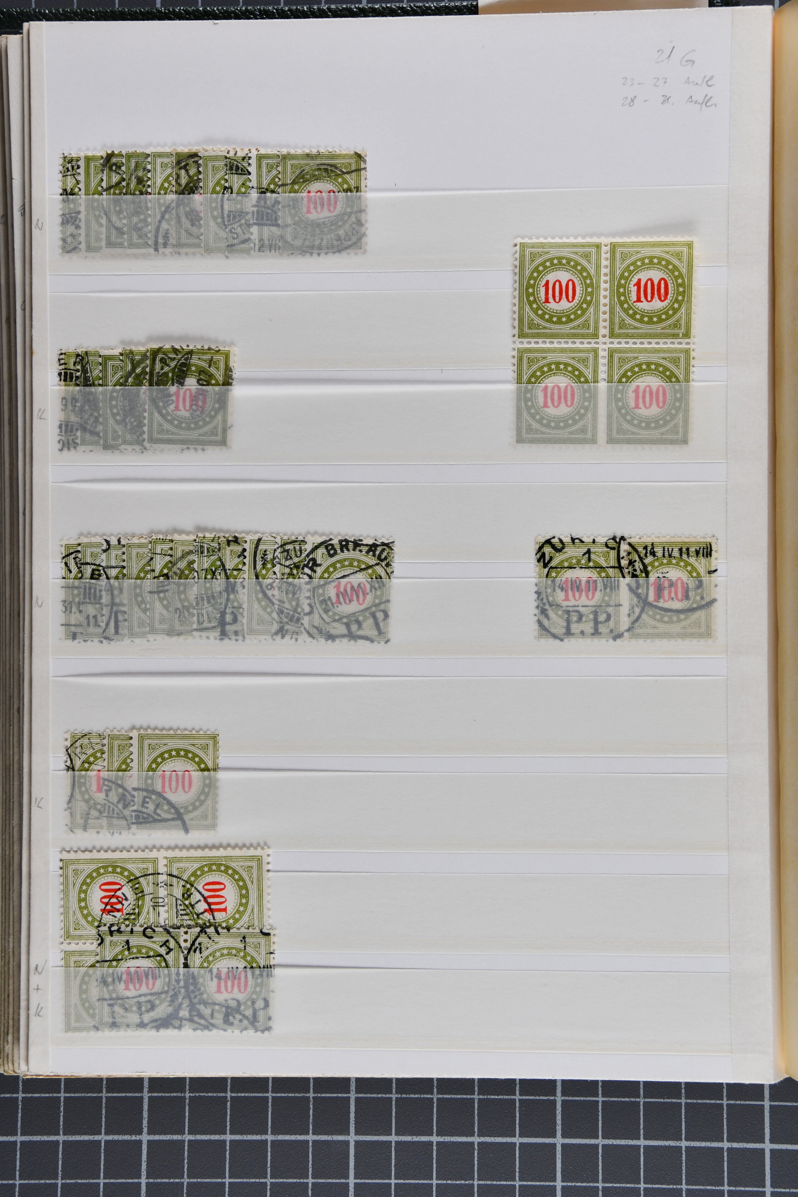 1883/34: ca. 60 Partie Nachportobelege ab der blauen Zifferausgabe auf Beleg, untergebracht in einem Briefalbum. Enthalten sind neun Mischfrankaturen blau/grün sowie bei den späteren Ausgaben einige interessante