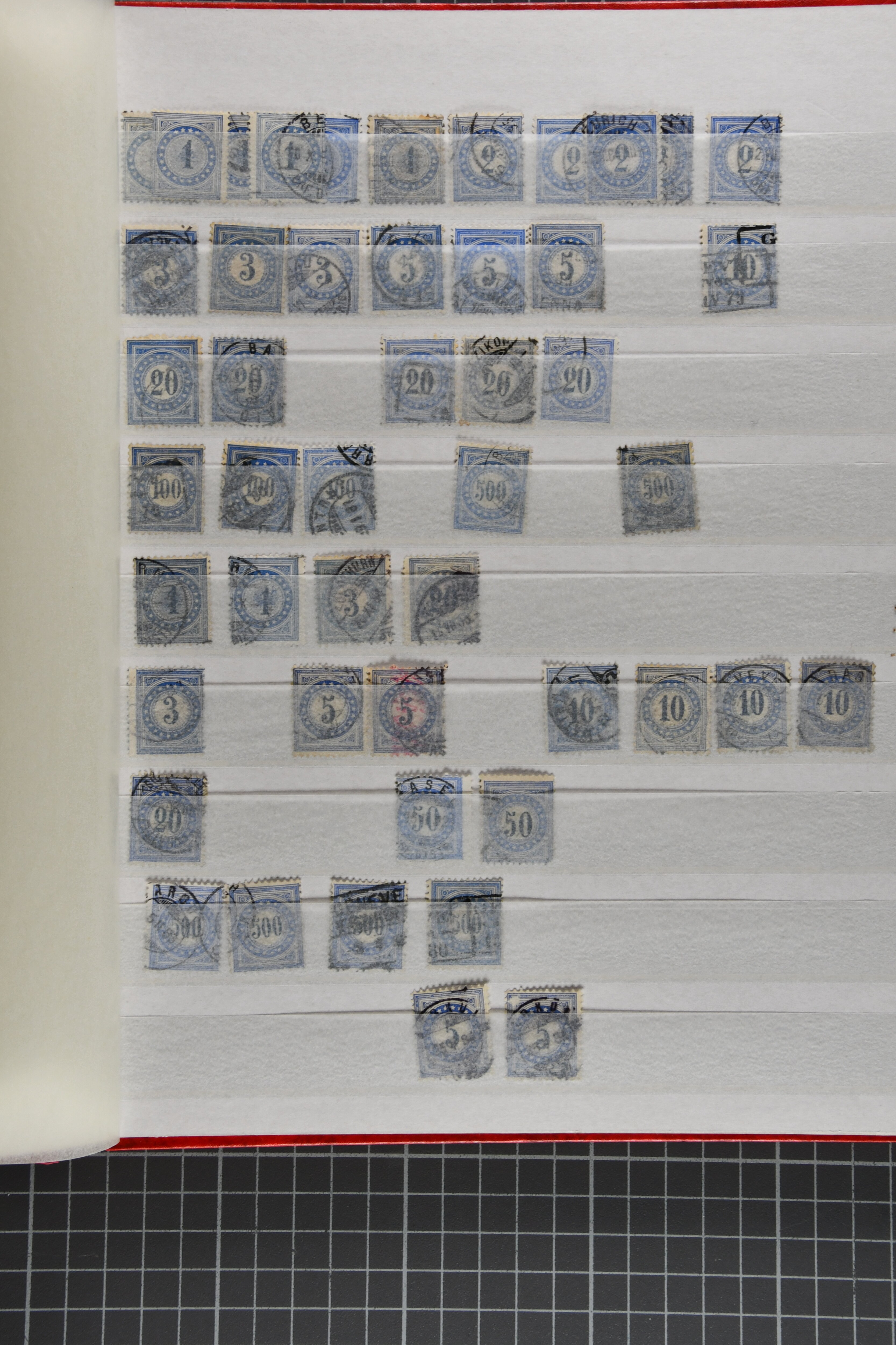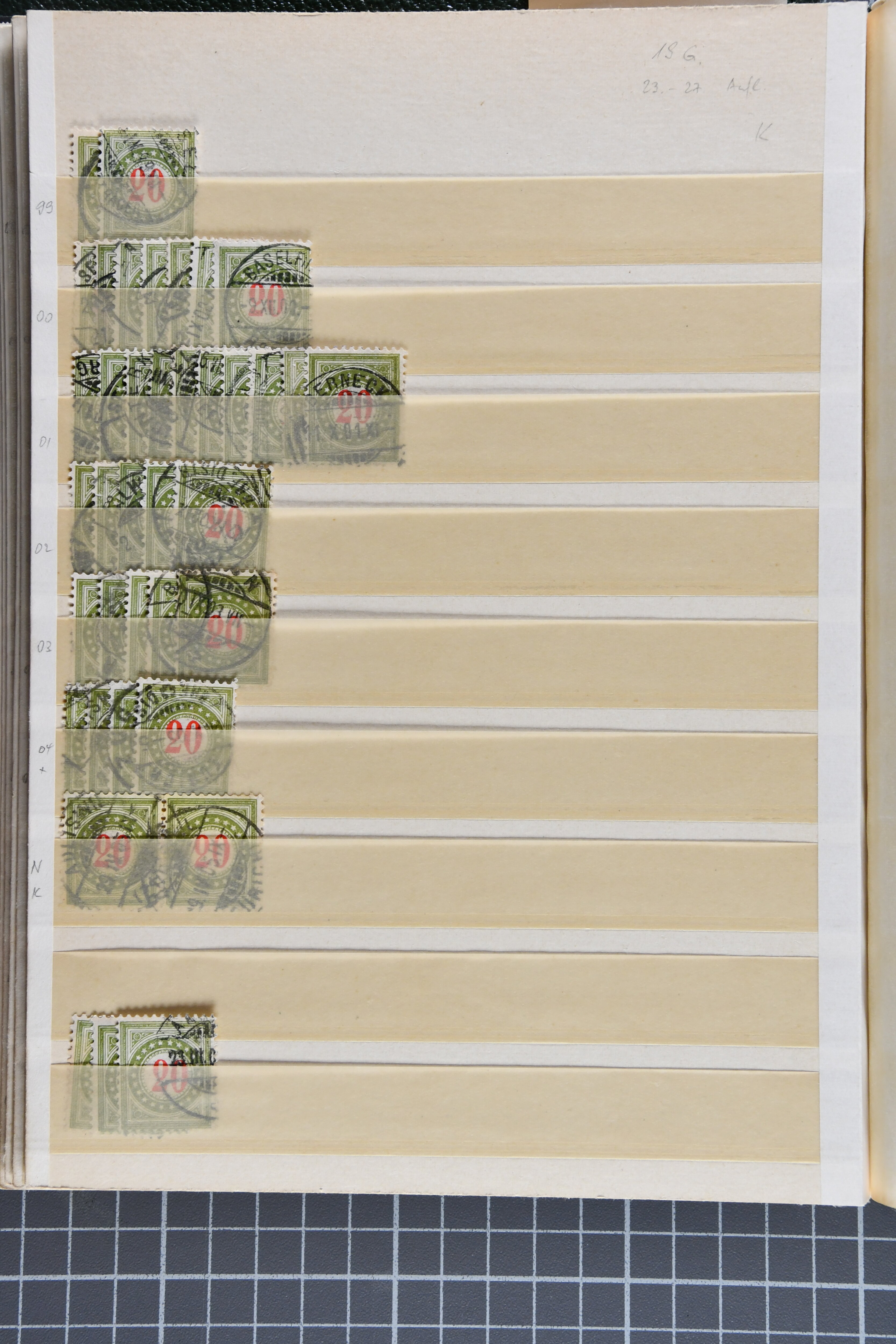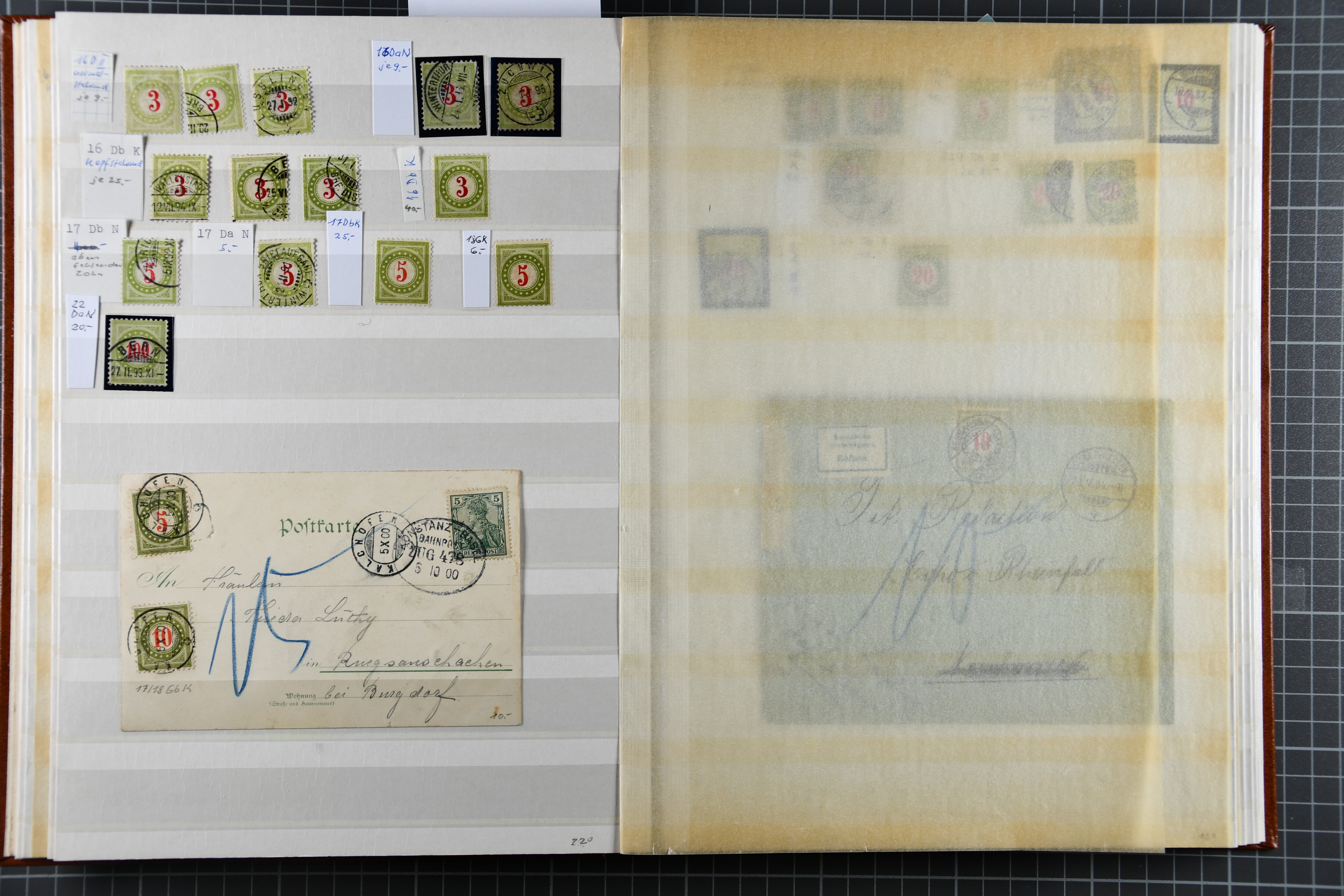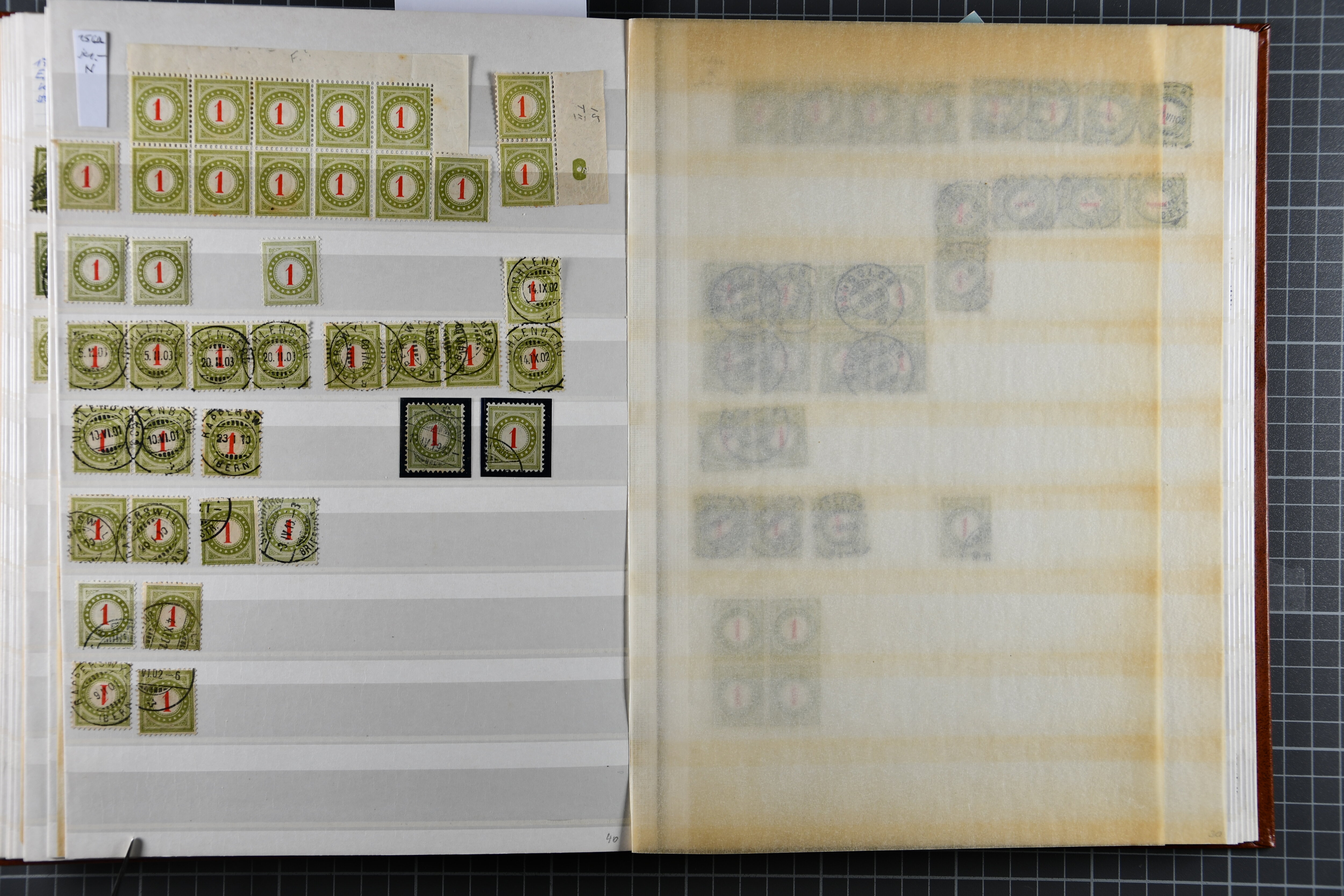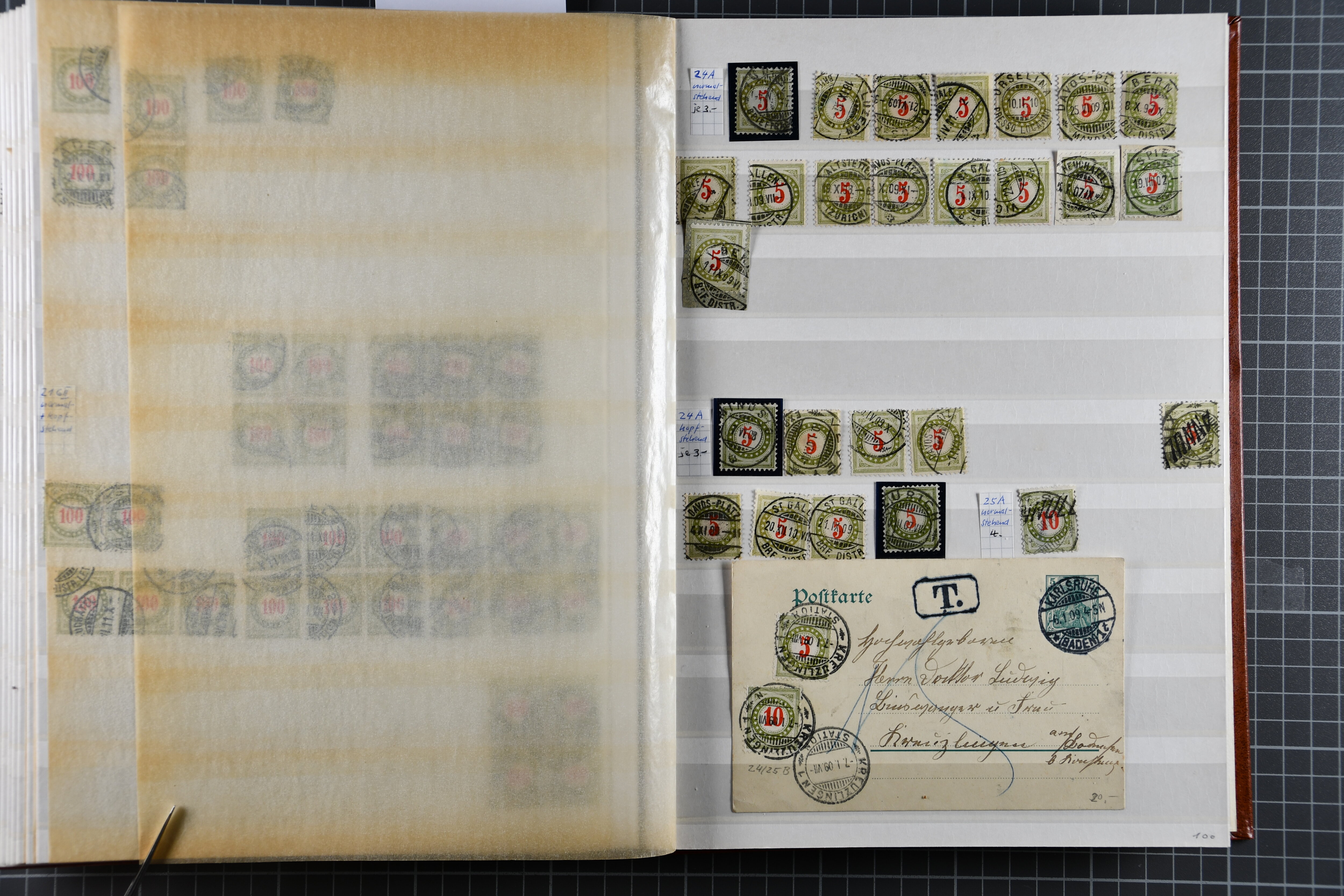 1883/34: ca. 60 Partie Nachportobelege ab der blauen Zifferausgabe auf Beleg, untergebracht in einem Briefalbum. Enthalten sind neun Mischfrankaturen blau/grün sowie bei den späteren Ausgaben einige interessante