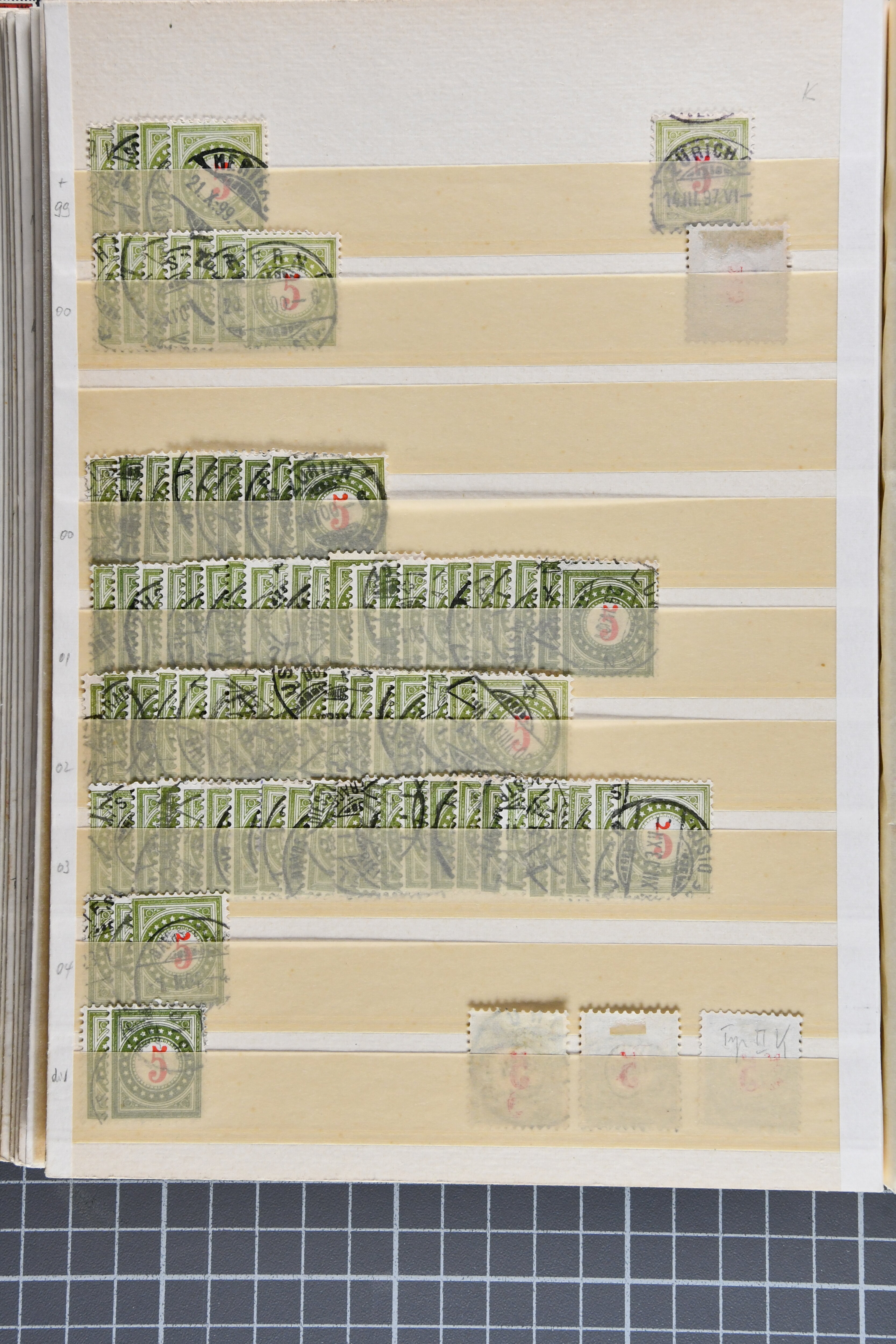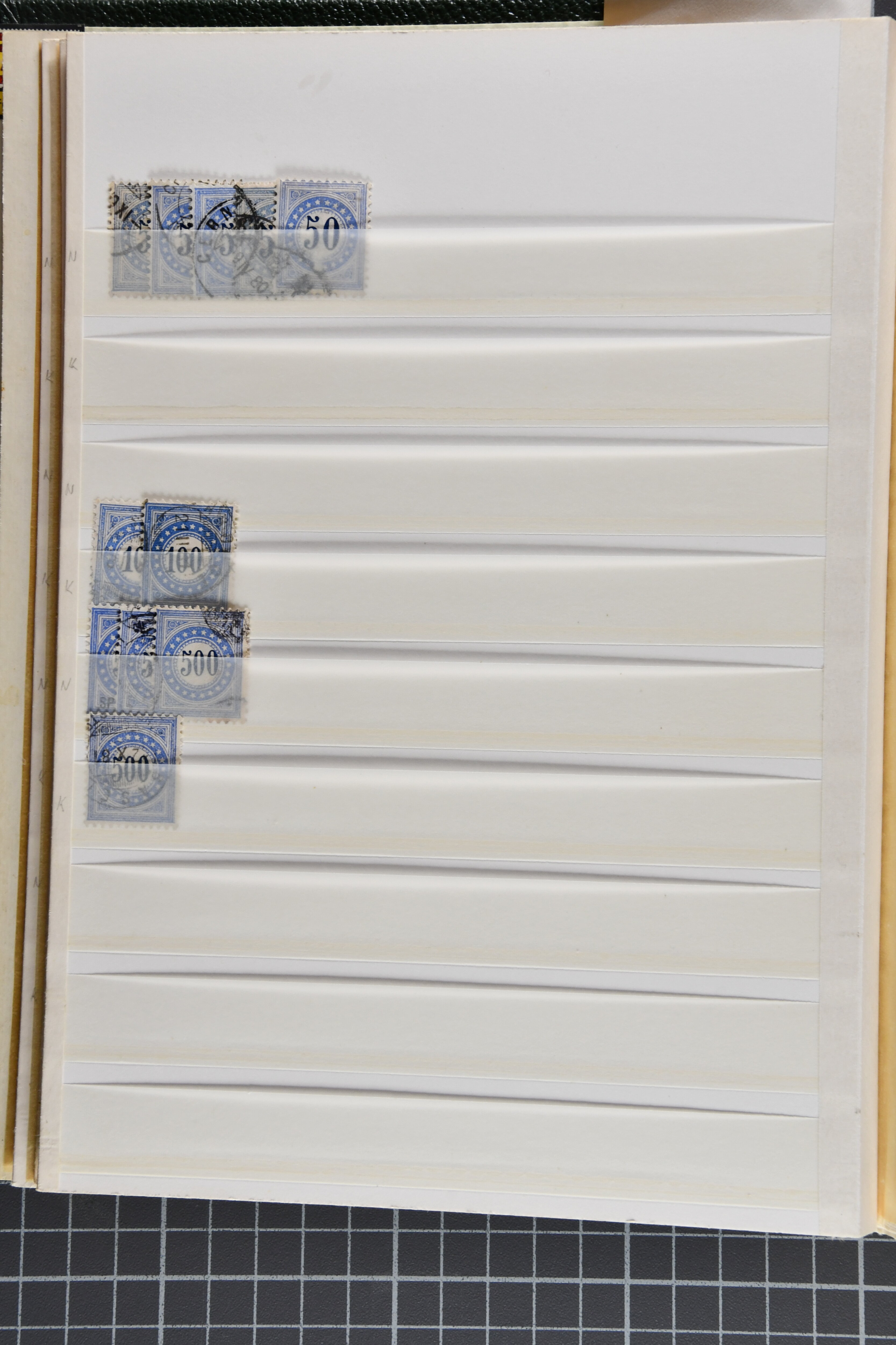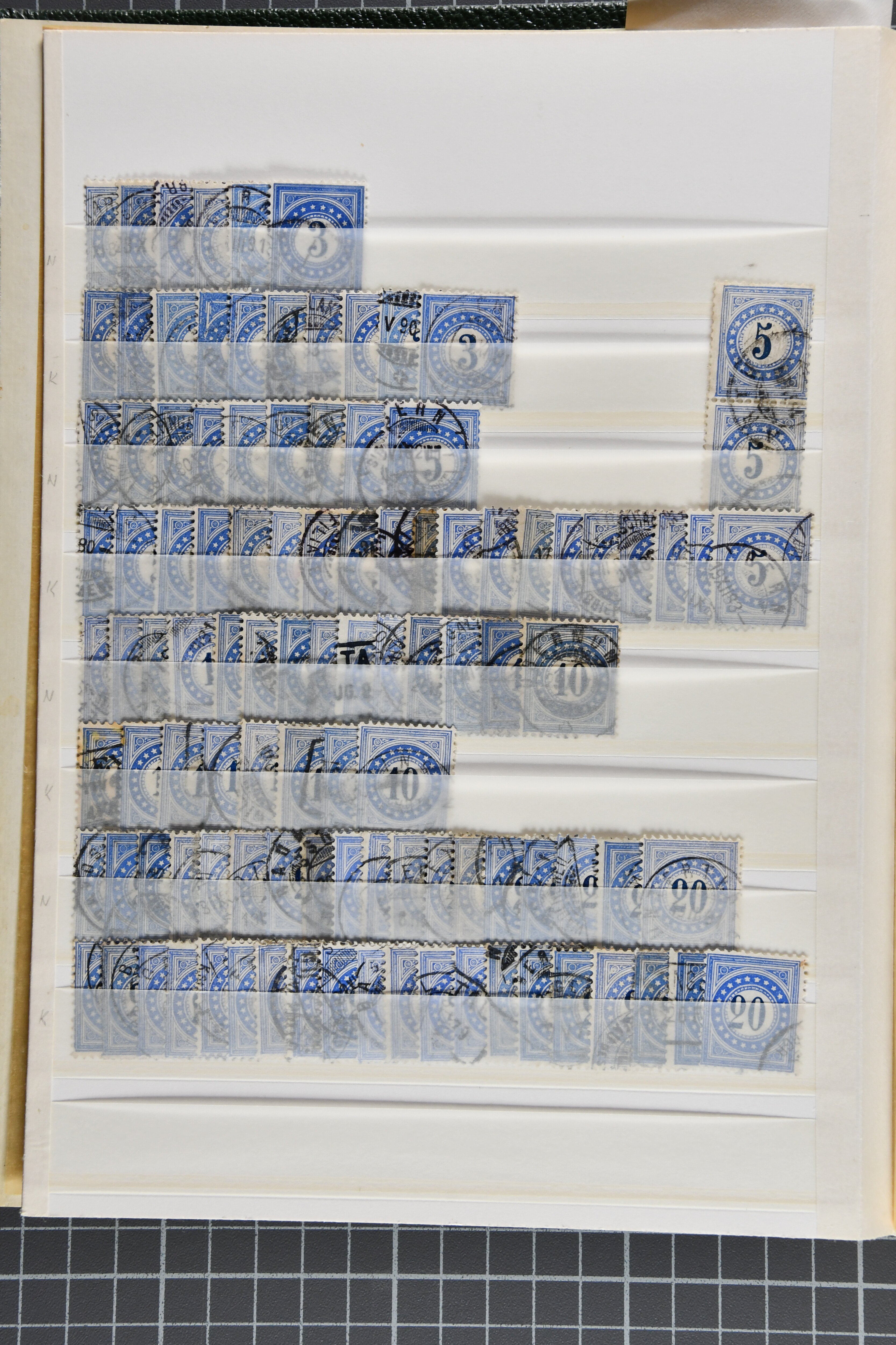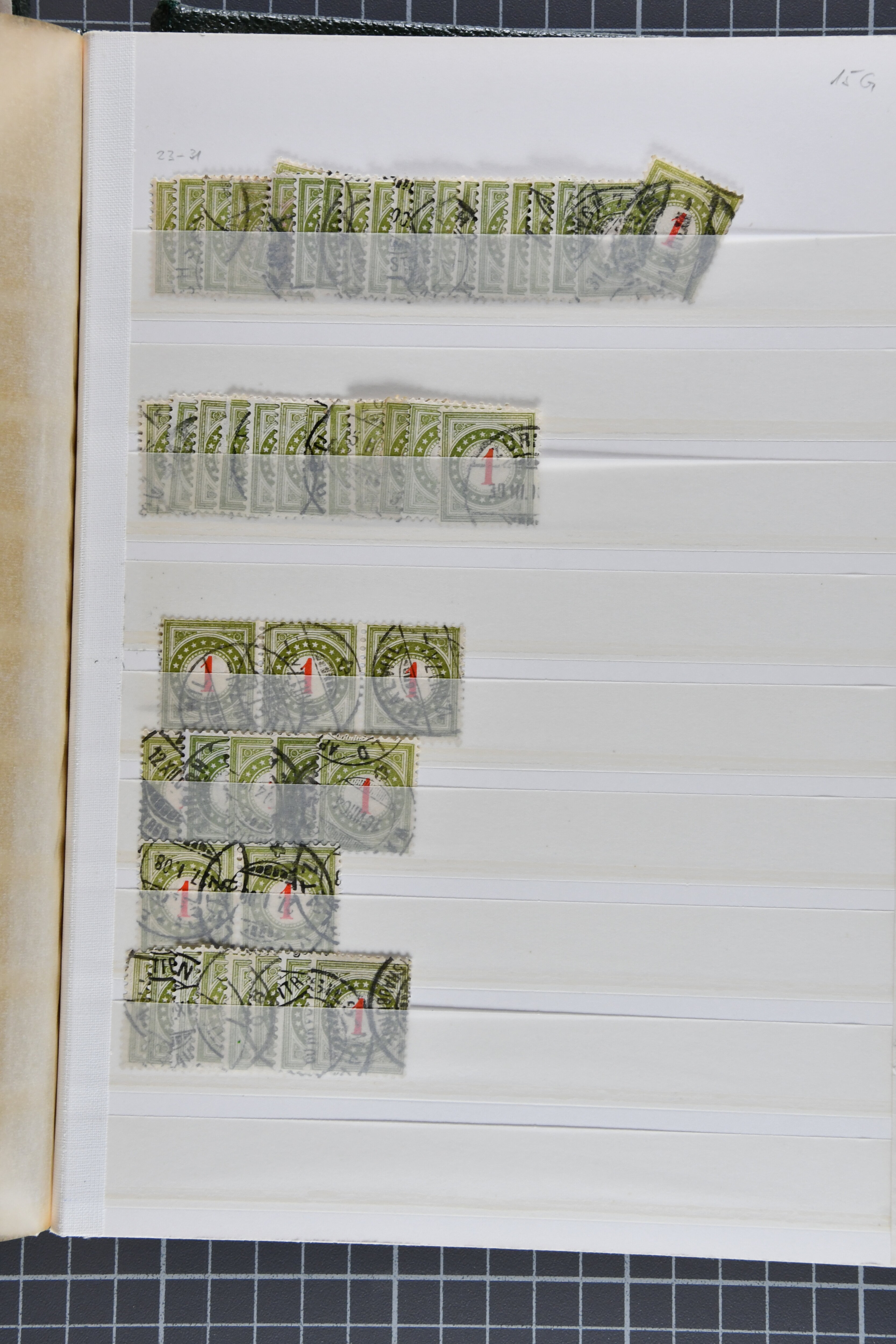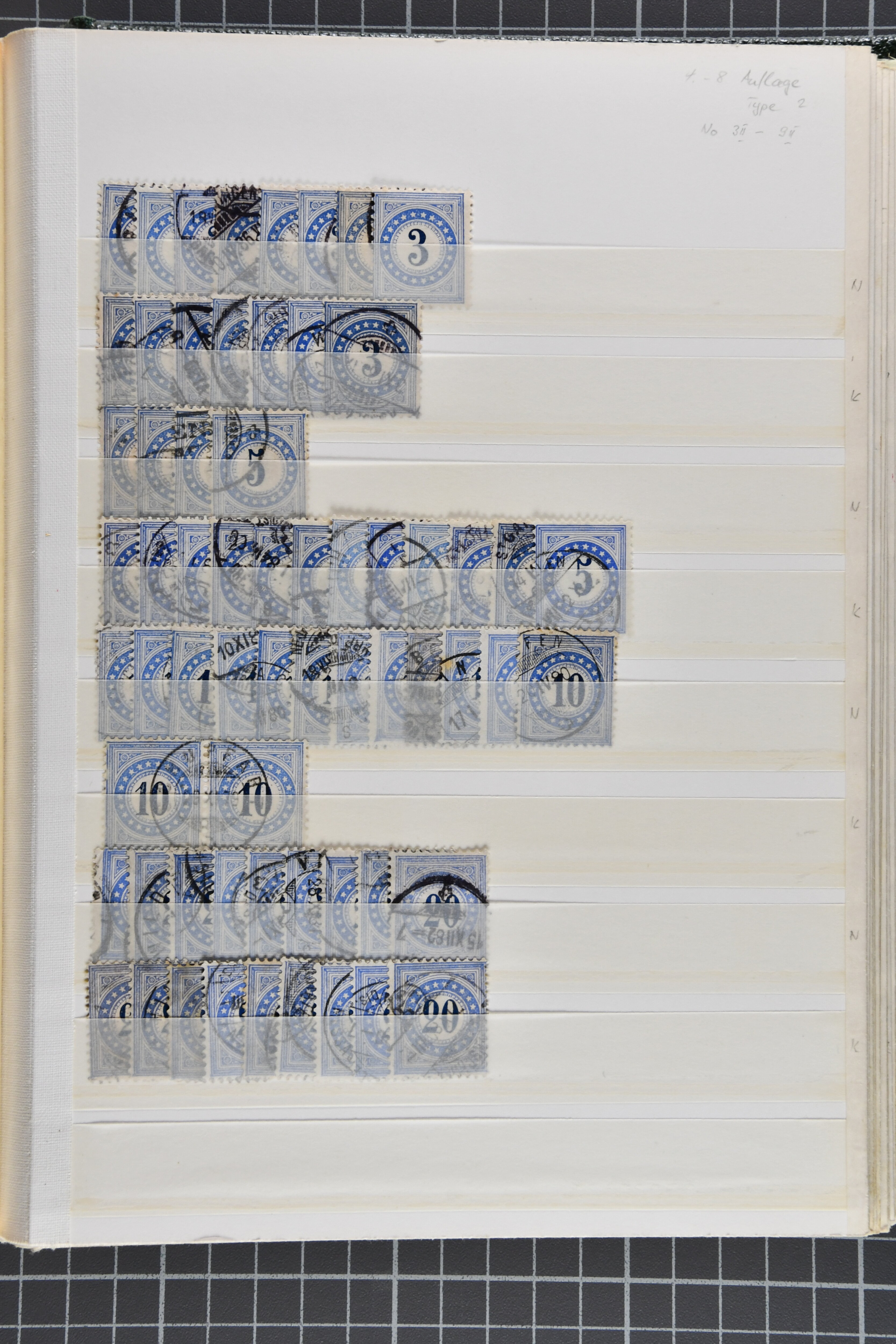 1883/34: ca. 60 Partie Nachportobelege ab der blauen Zifferausgabe auf Beleg, untergebracht in einem Briefalbum. Enthalten sind neun Mischfrankaturen blau/grün sowie bei den späteren Ausgaben einige interessante