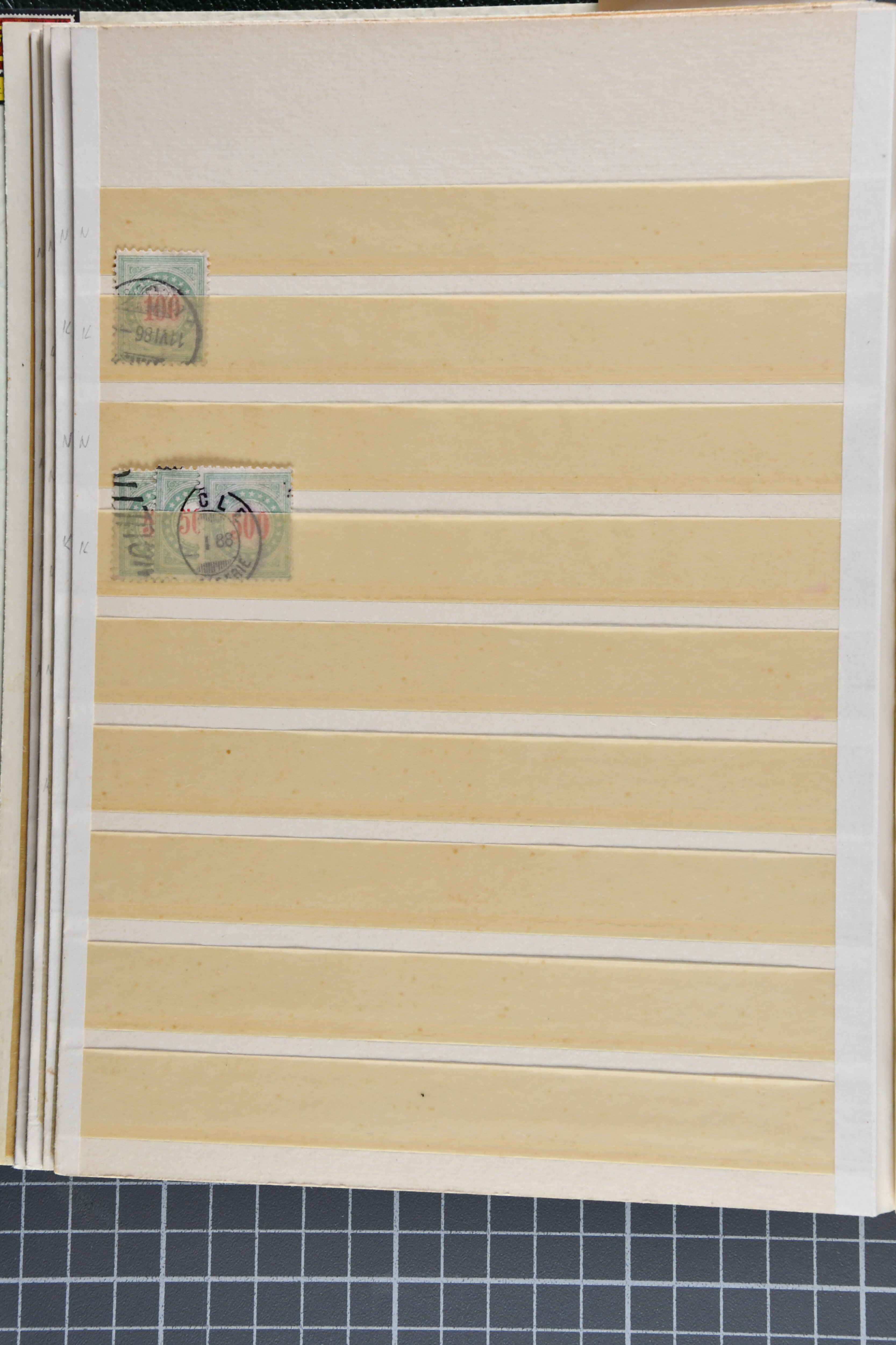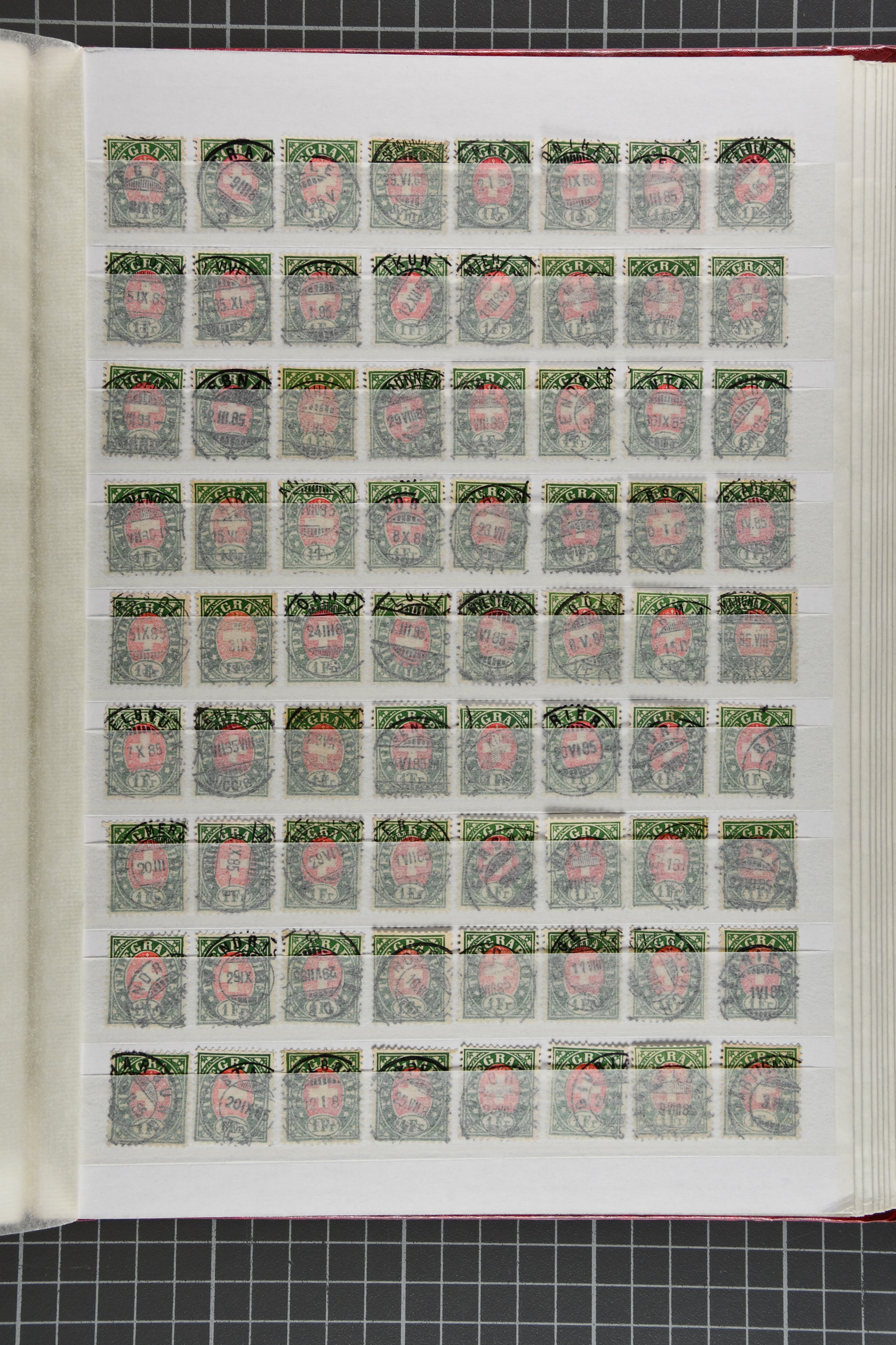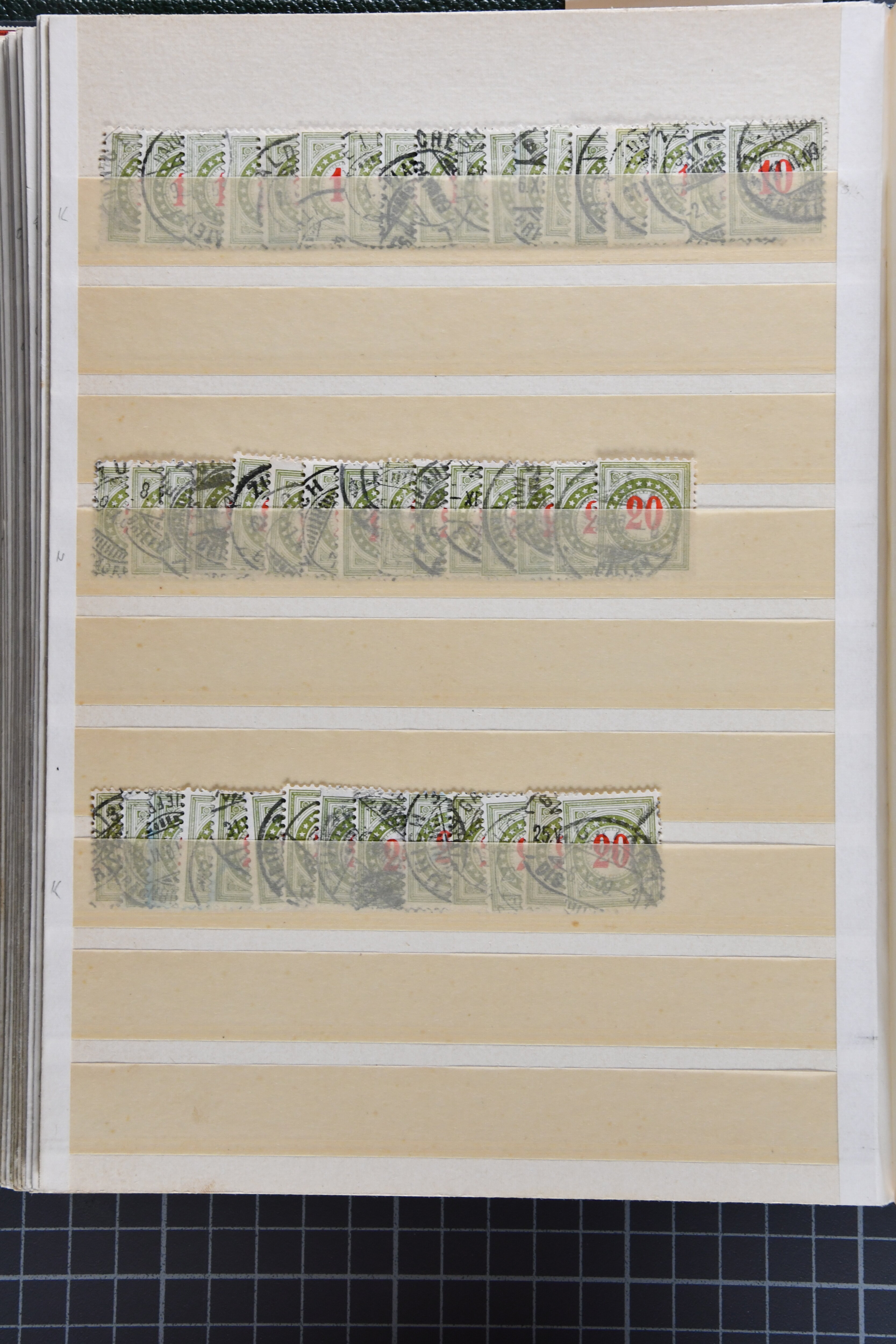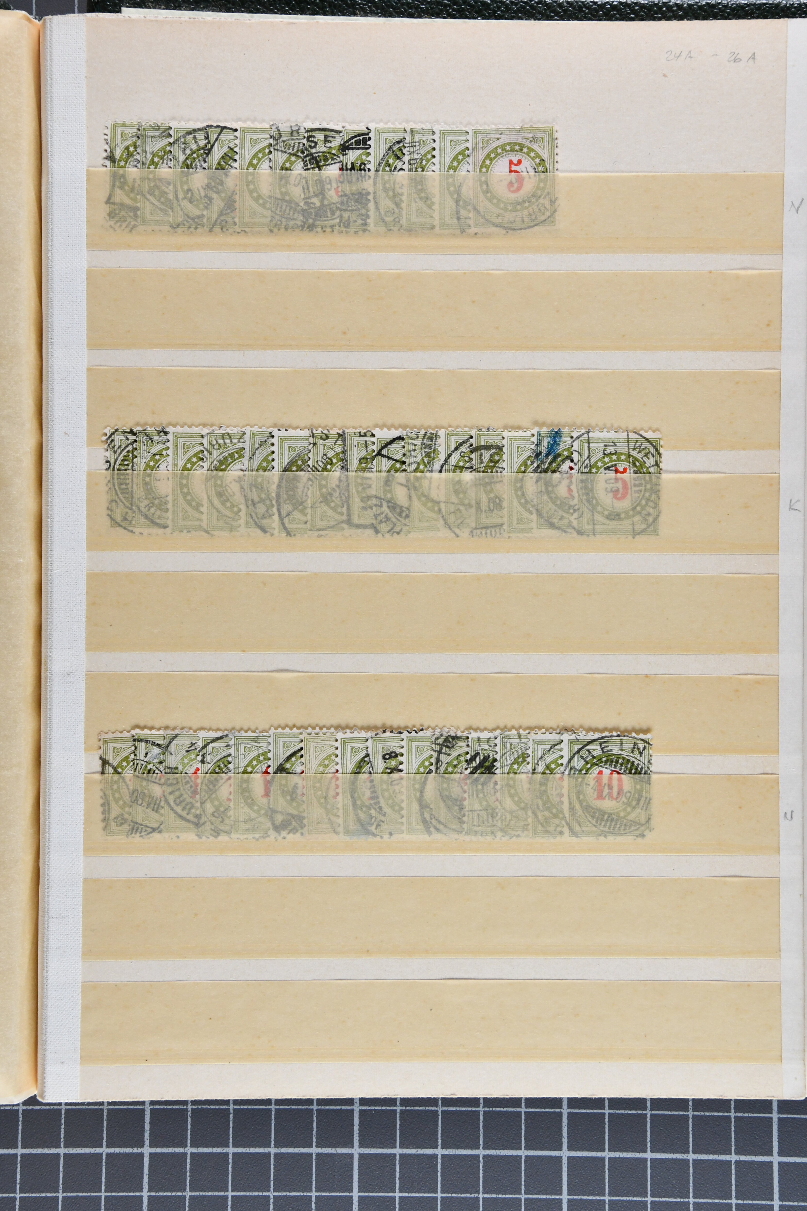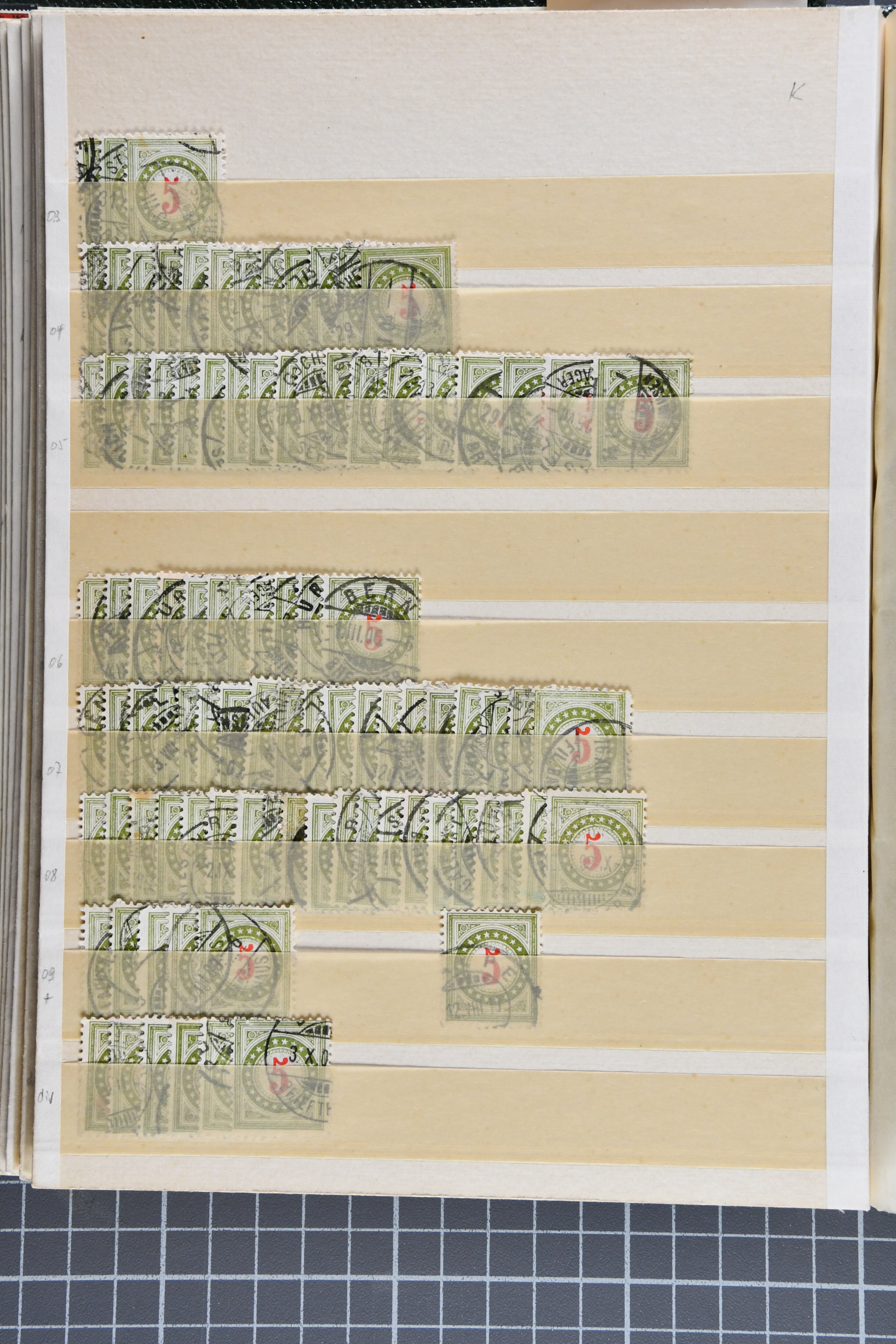 1883/34: ca. 60 Partie Nachportobelege ab der blauen Zifferausgabe auf Beleg, untergebracht in einem Briefalbum. Enthalten sind neun Mischfrankaturen blau/grün sowie bei den späteren Ausgaben einige interessante