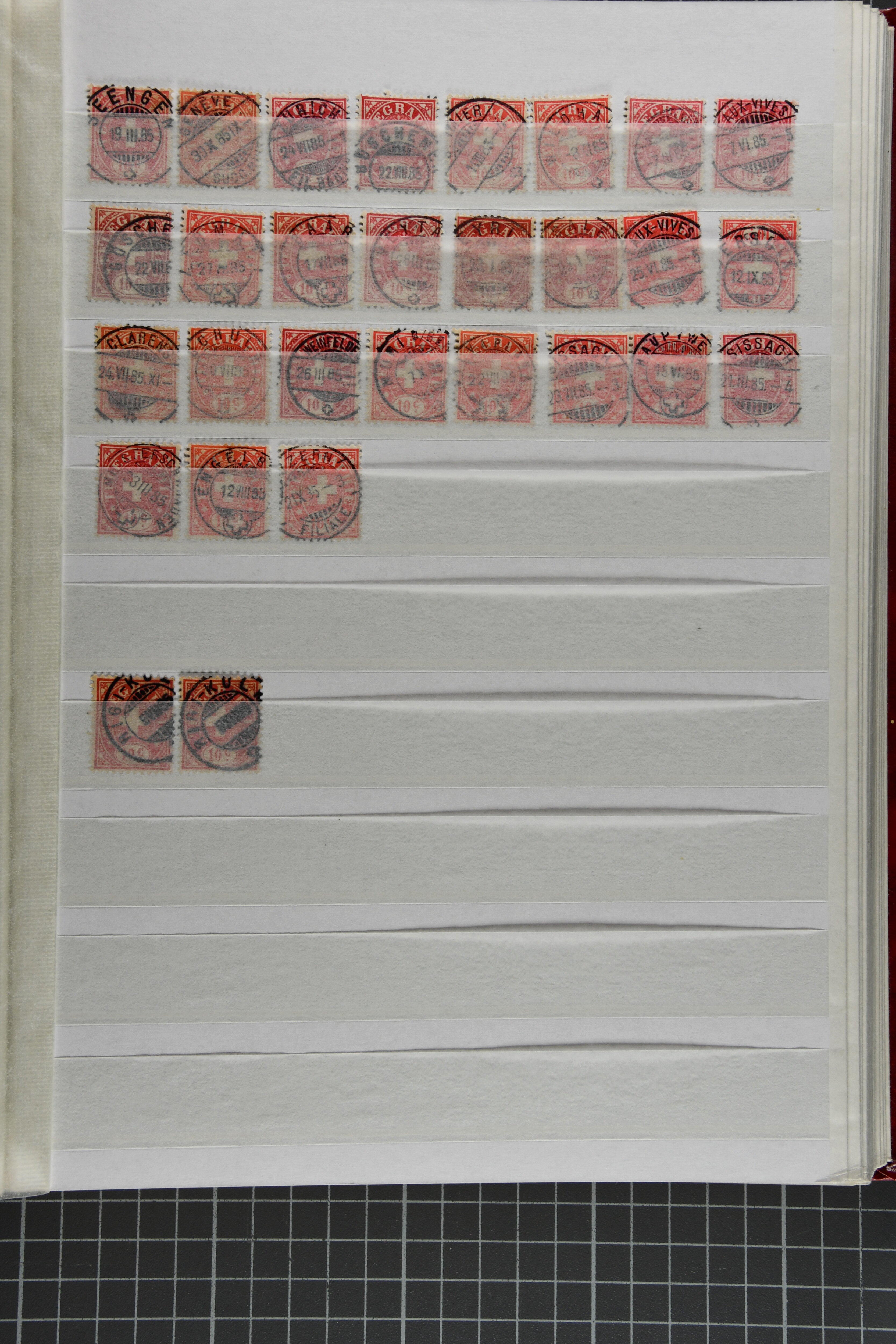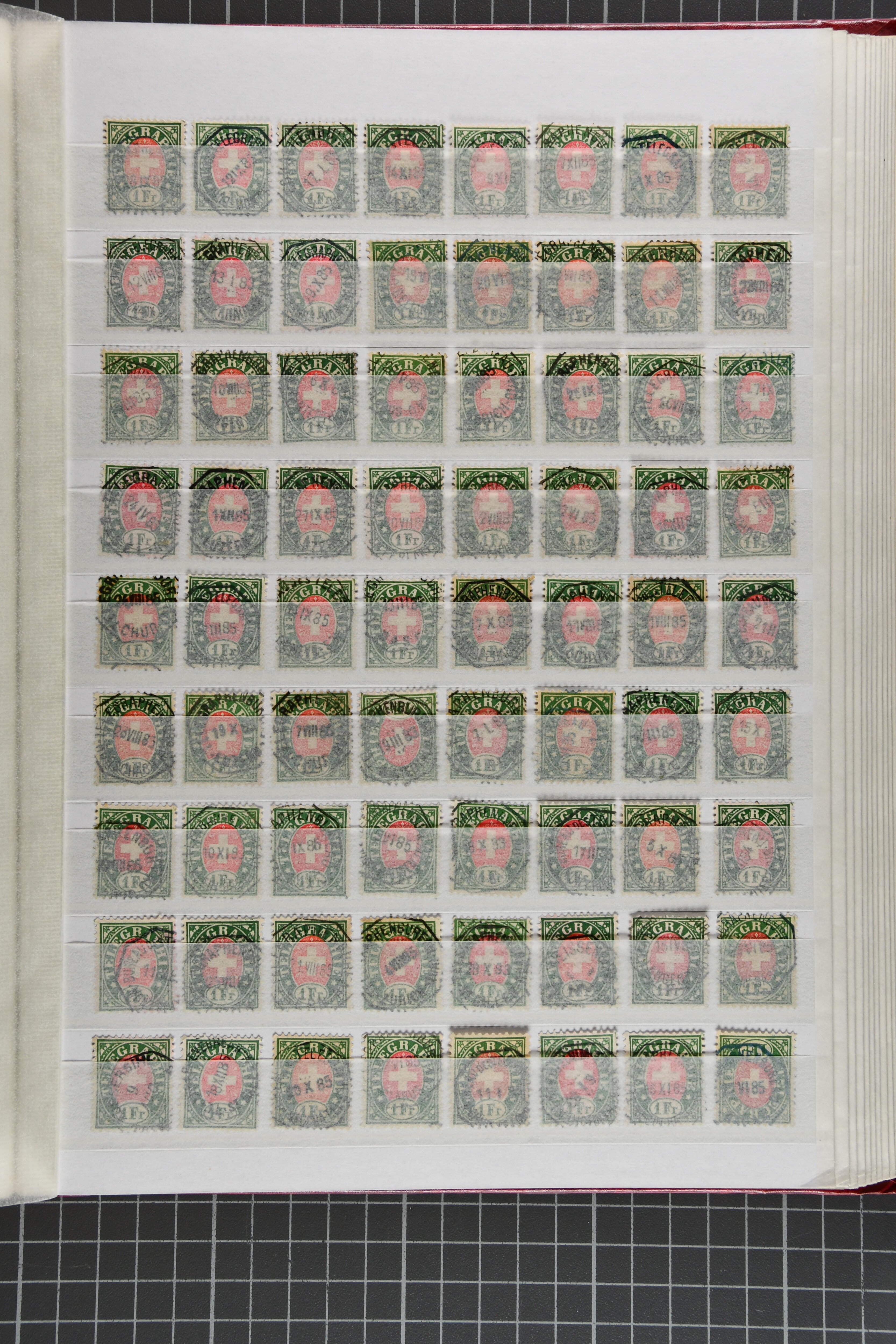 1881/86: Bestand der Telegraphenmarken-Ausgabe auf Faserpapier in drei Steckbüchern. Dabei eine Steckkarte mit 1 Fr. gold/karmin (SBK 4), ein Album mit ausgesuchten Stempeln auf den Werten zu 5, 10, 25, 50 und 100