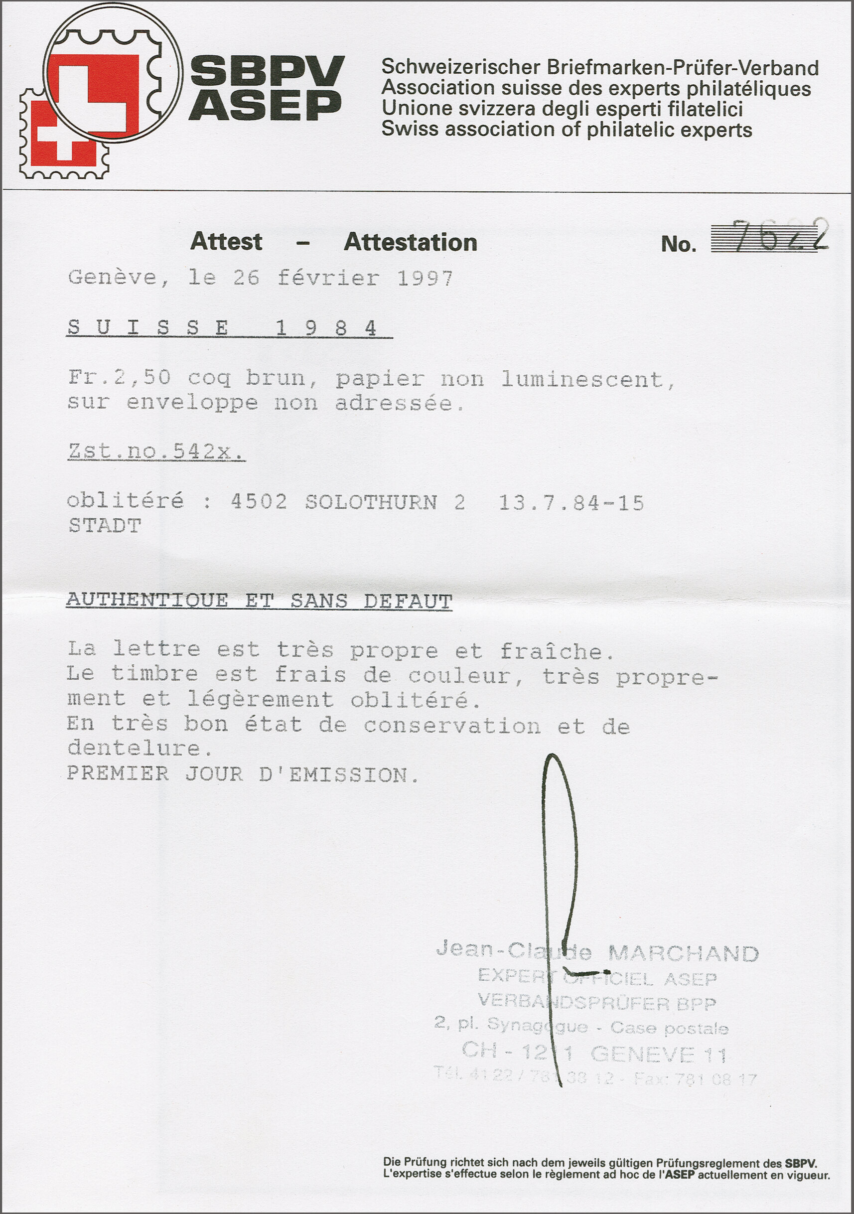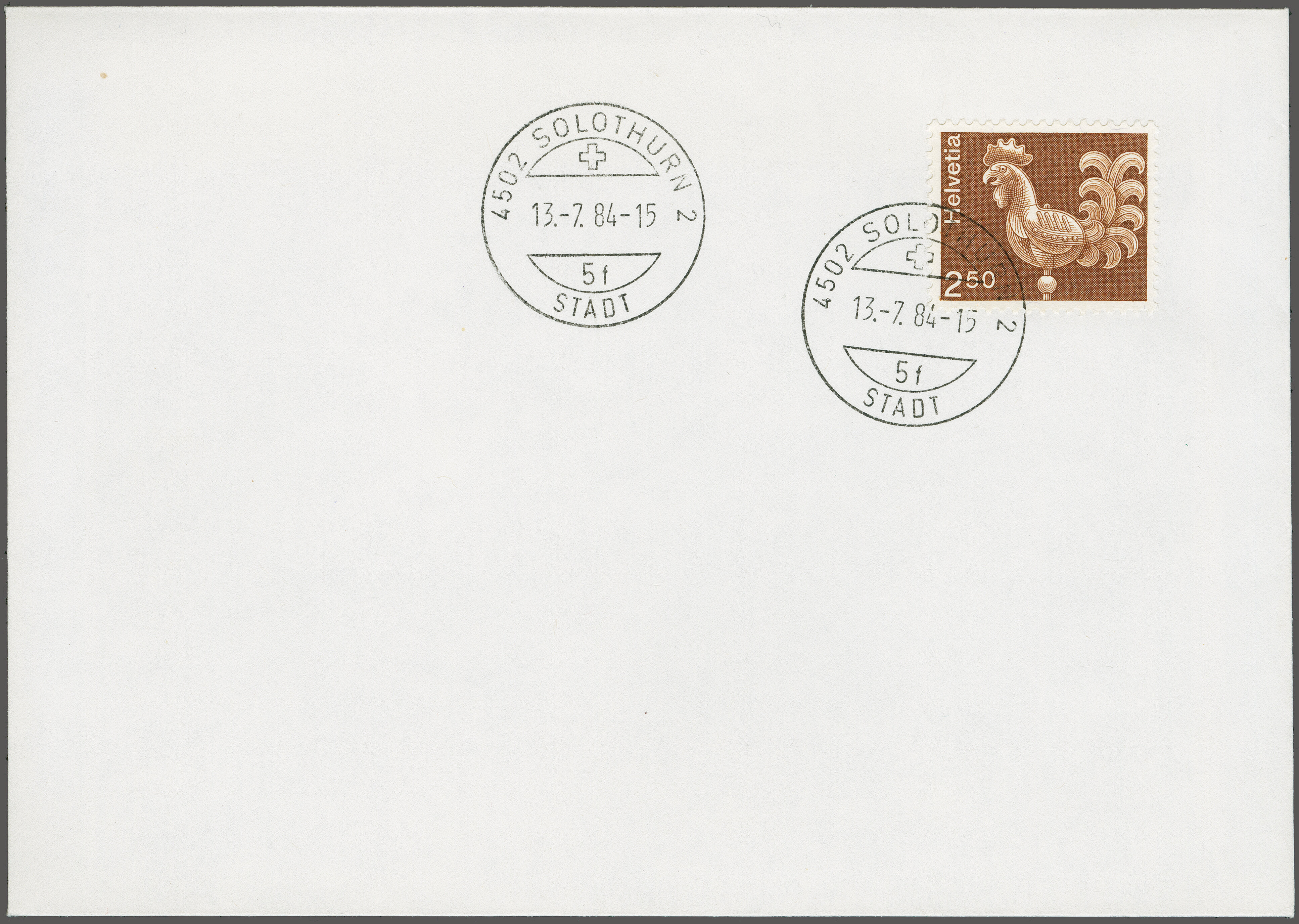 1984: Turmhahn 2,50 Fr. auf violett gefasertem Papier ohne Leuchtstoff, klar und sauber entw. am Ersttag mit "4502 SOLOTHURN 2 13.-7.84 - 15 STADT" auf Blankoumschlag. Attest Marchand (1997) SBK = CHF 2'500. (Image 1)