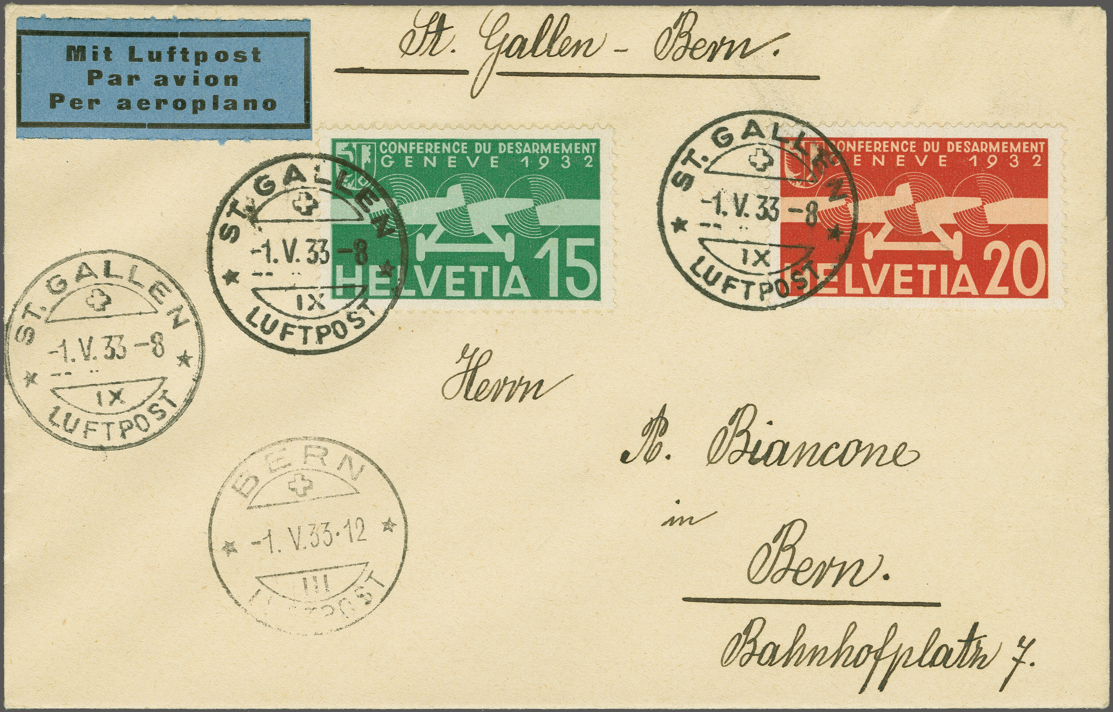 ALPAR - Erstflug St. Gallen - Bern 1933 (1. Mai): Brief frankiert mit Luftpost 15 Rp. u. 20 Rp. gest. "St. Gallen Luftpost 1.V.33-8" mit AStp. "Bern -1.V.33.12". Sauberer u. seltener Beleg, befS ca. 10. SLH = CHF 1700. (Image 1)