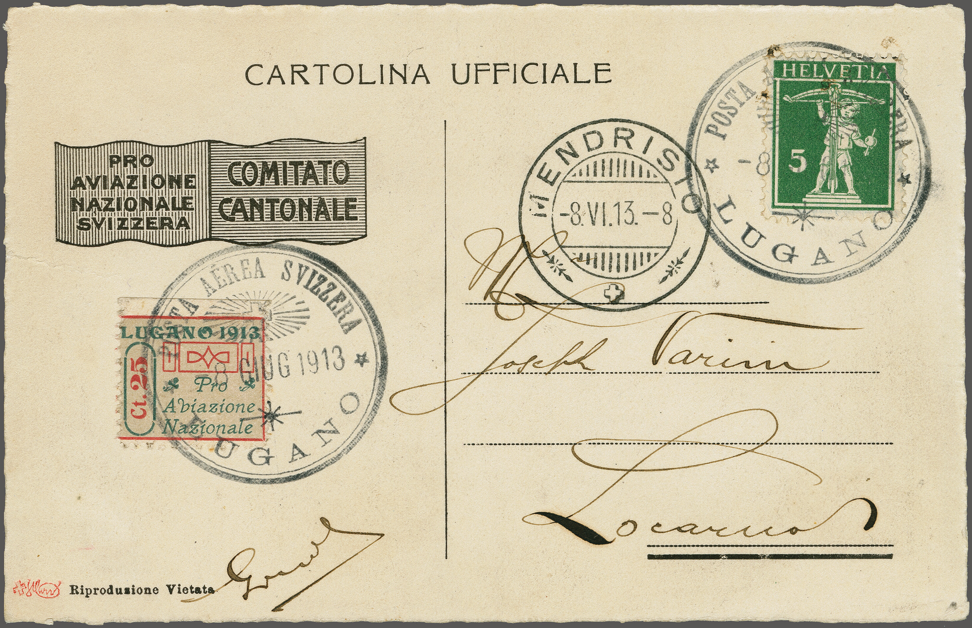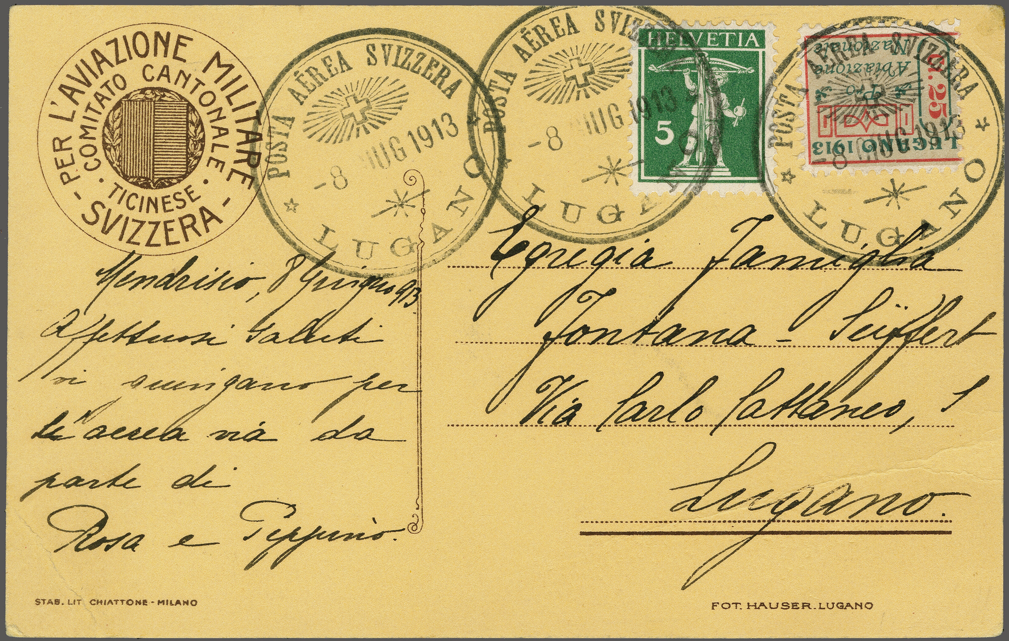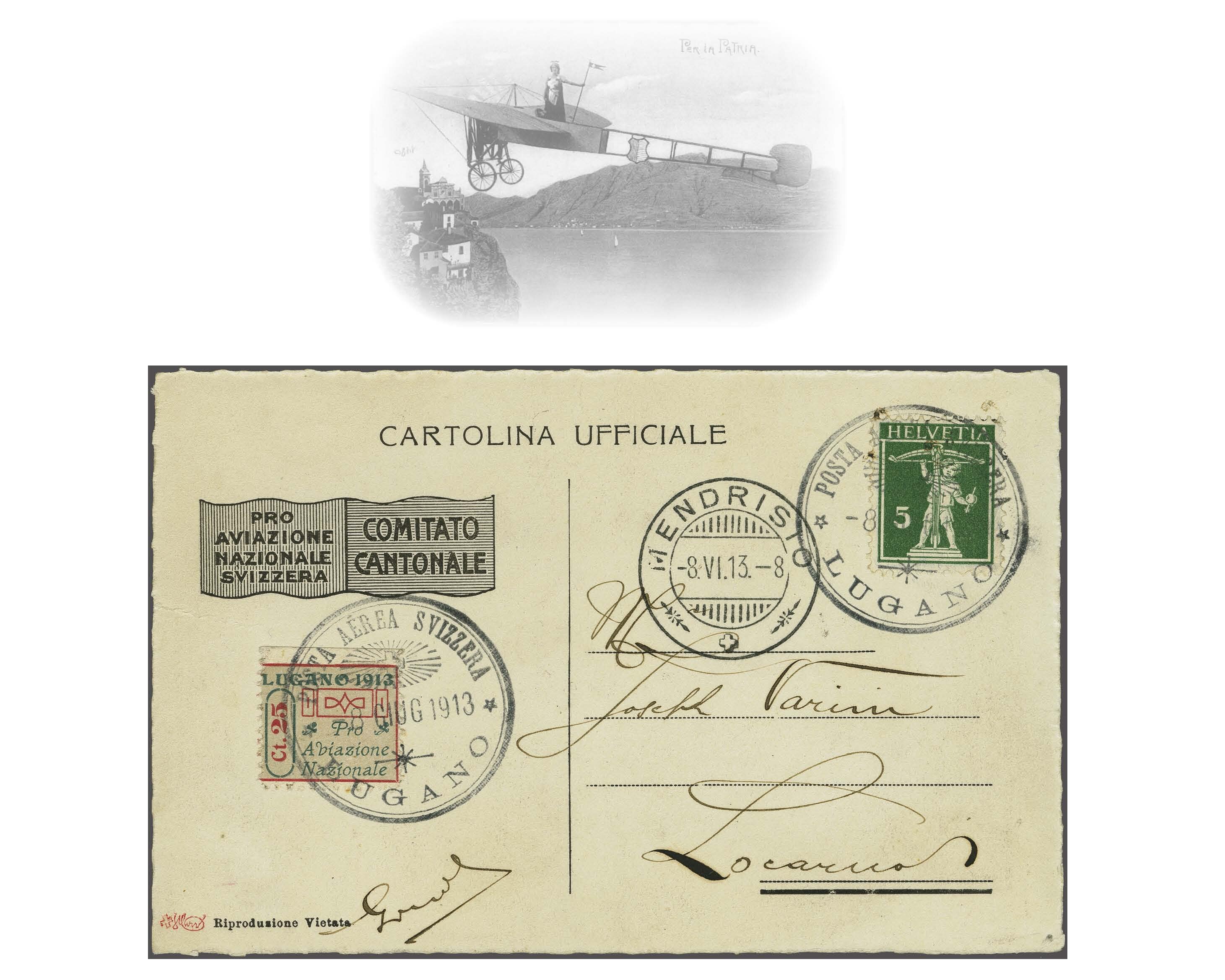 und übergehend entw. mit schwarzem SStp. "POSTA AEREA SVIZZERA / LUGANO / 8. GIUG 1913", dieser nebenges. nochmals wiederholt, auf offizieller Karte Nr. 1 (zwei unbed. Büge) datiert "Mendrisio 8 Giugno 13" nach Lugano. Eine aussergewöhnlich