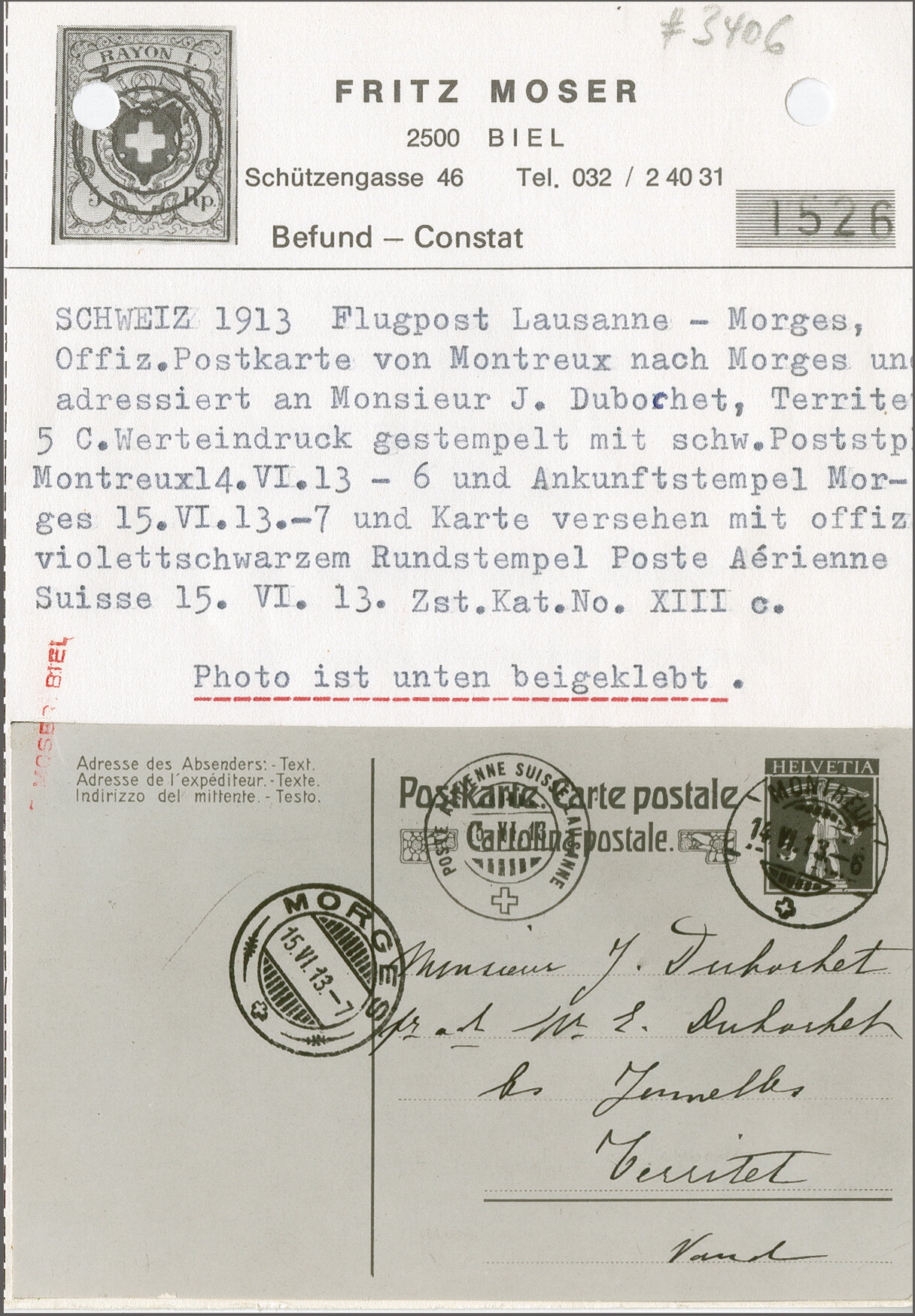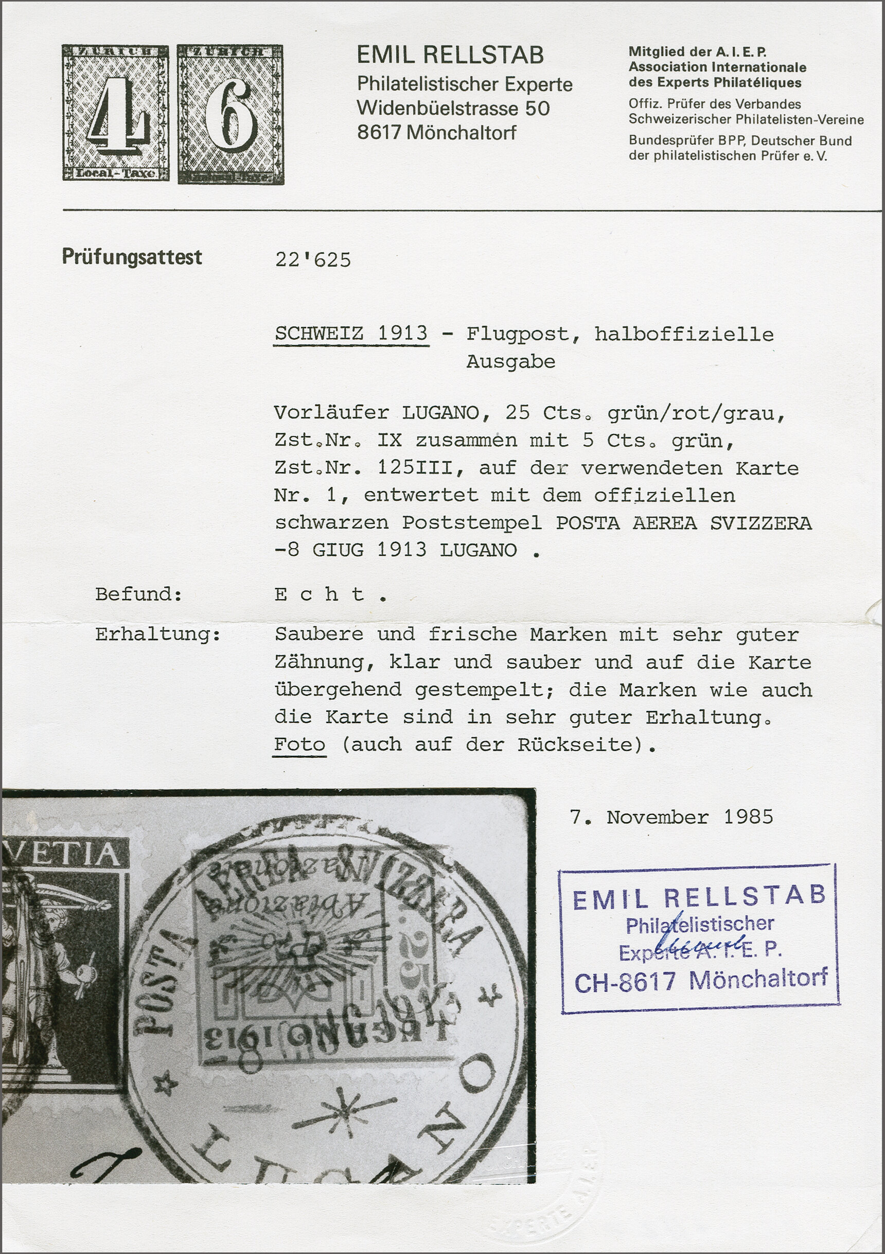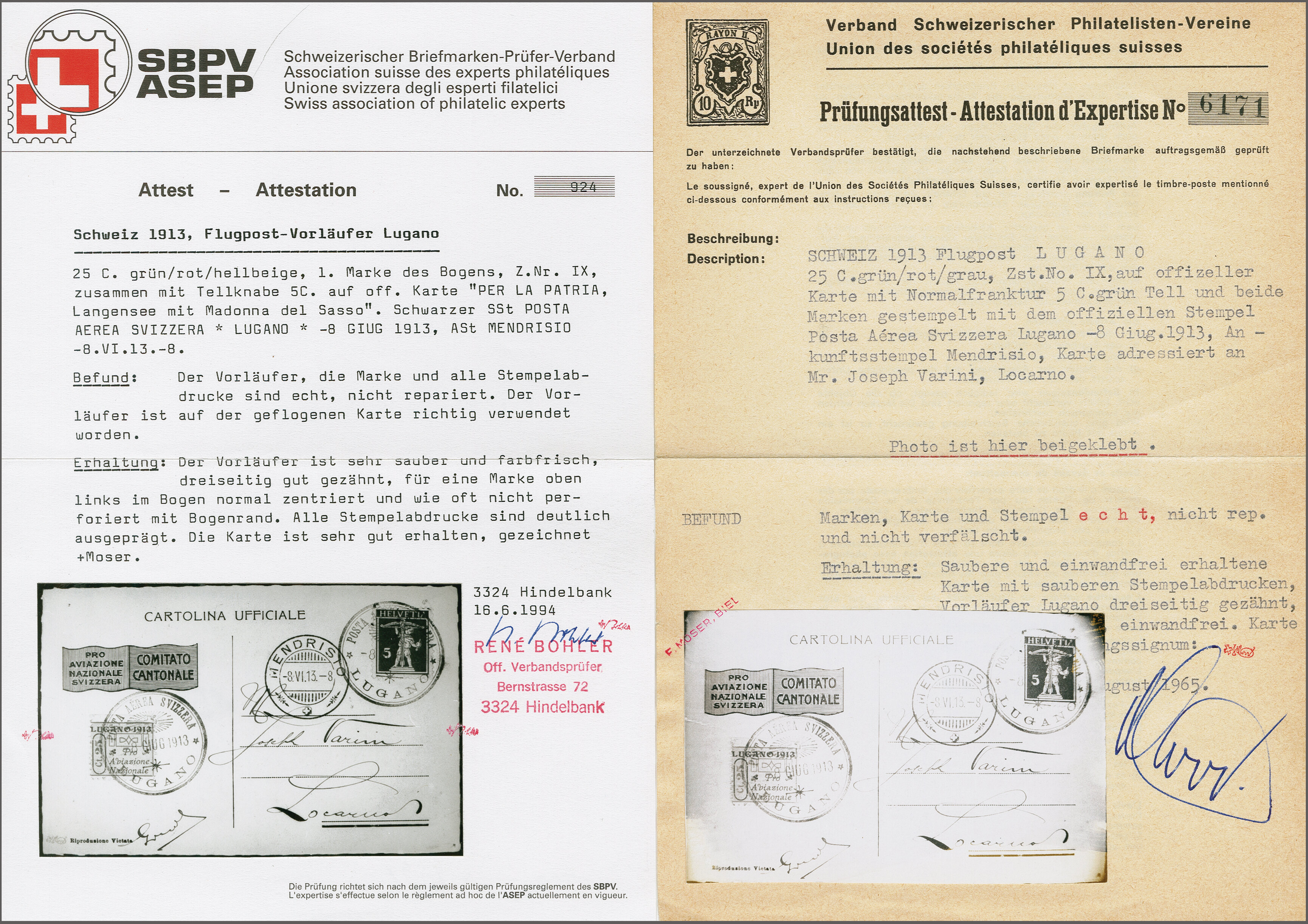 übergehend entw. mit SStp. "POSTA AÉREA SVIZZERA / LUGANO / 8 GIUG 1913" auf offizieller Karte Nr. 2 mit AStp. "MENDRISIO 8.VI.13-8" nach Locarno. Eine interessante Abart auf sauberer Karte; Atteste Moser (1965) und Bohler (1994). SBK=CHF 3'800. (Image 1)