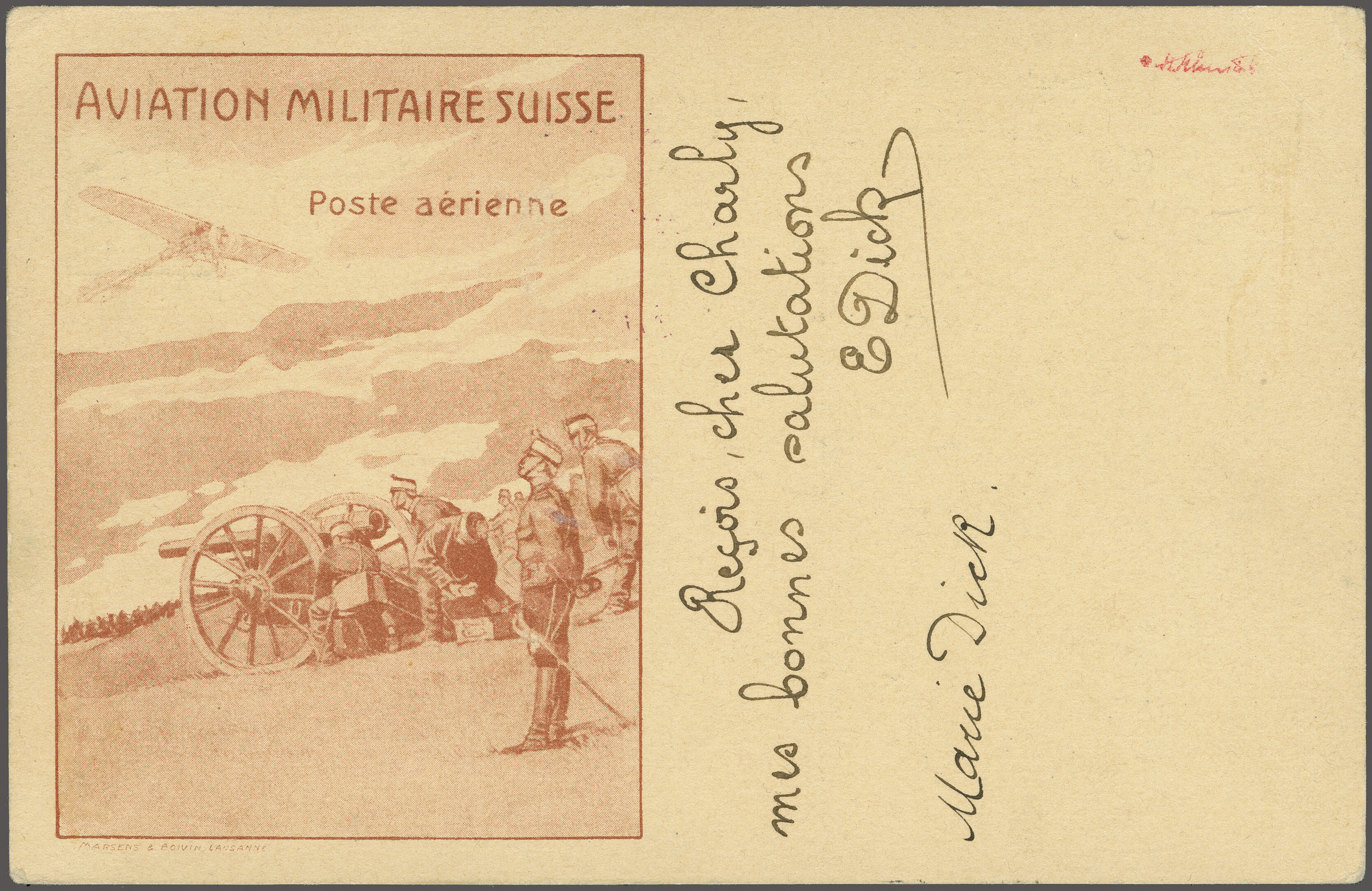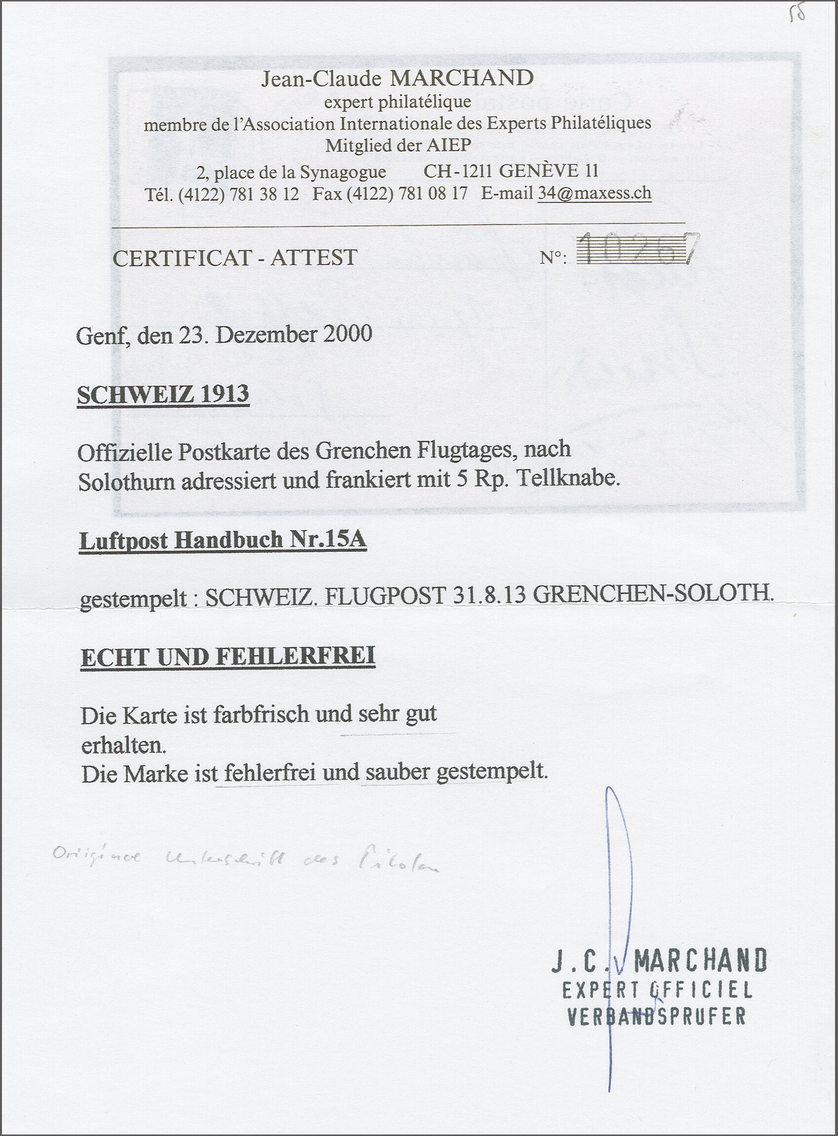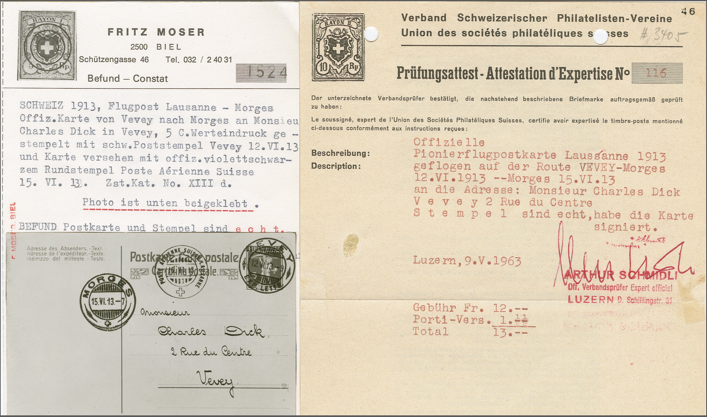 übergehend entw. mit SStp. "POSTA AÉREA SVIZZERA / LUGANO / 8 GIUG 1913" auf offizieller Karte Nr. 2 mit AStp. "MENDRISIO 8.VI.13-8" nach Locarno. Eine interessante Abart auf sauberer Karte; Atteste Moser (1965) und Bohler (1994). SBK=CHF 3'800. (Image 1)