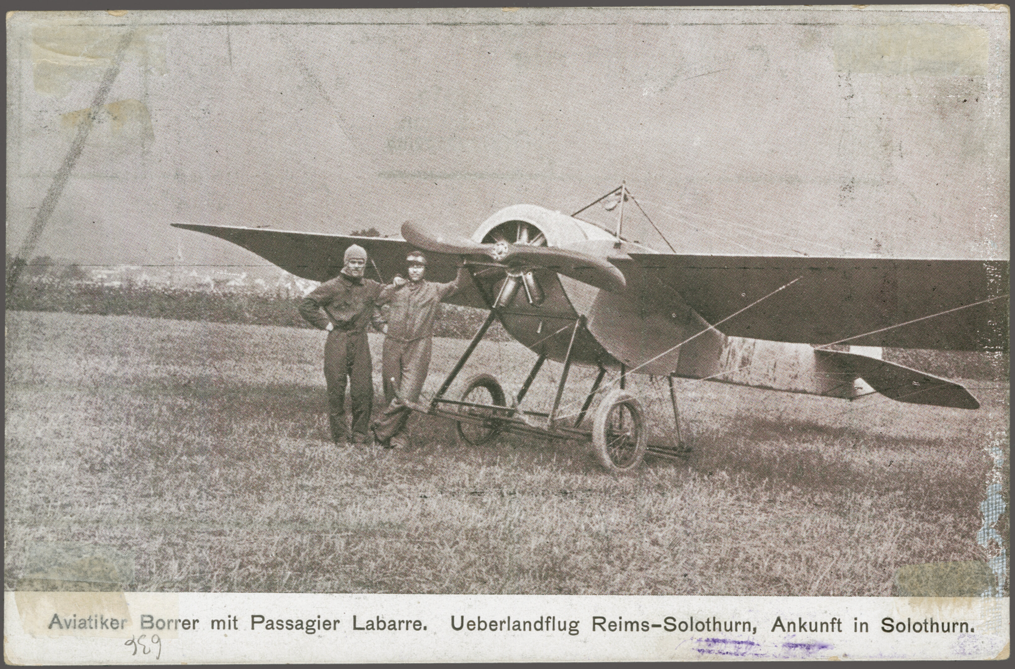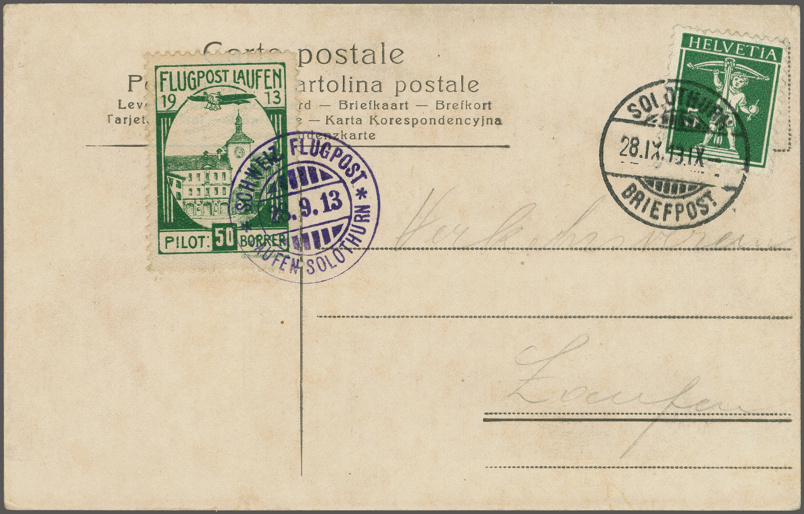 mit Passagier Labarre" nach Solothurn. Vorders. aus der Hand des Absenders Vermerk "geflogen am 31. Aug. 13" sowie Unterschrift von Pilot Theodor Borrer. Attest Marchand (2000). SLH/SBK=CHF 2'800. (Image 1)